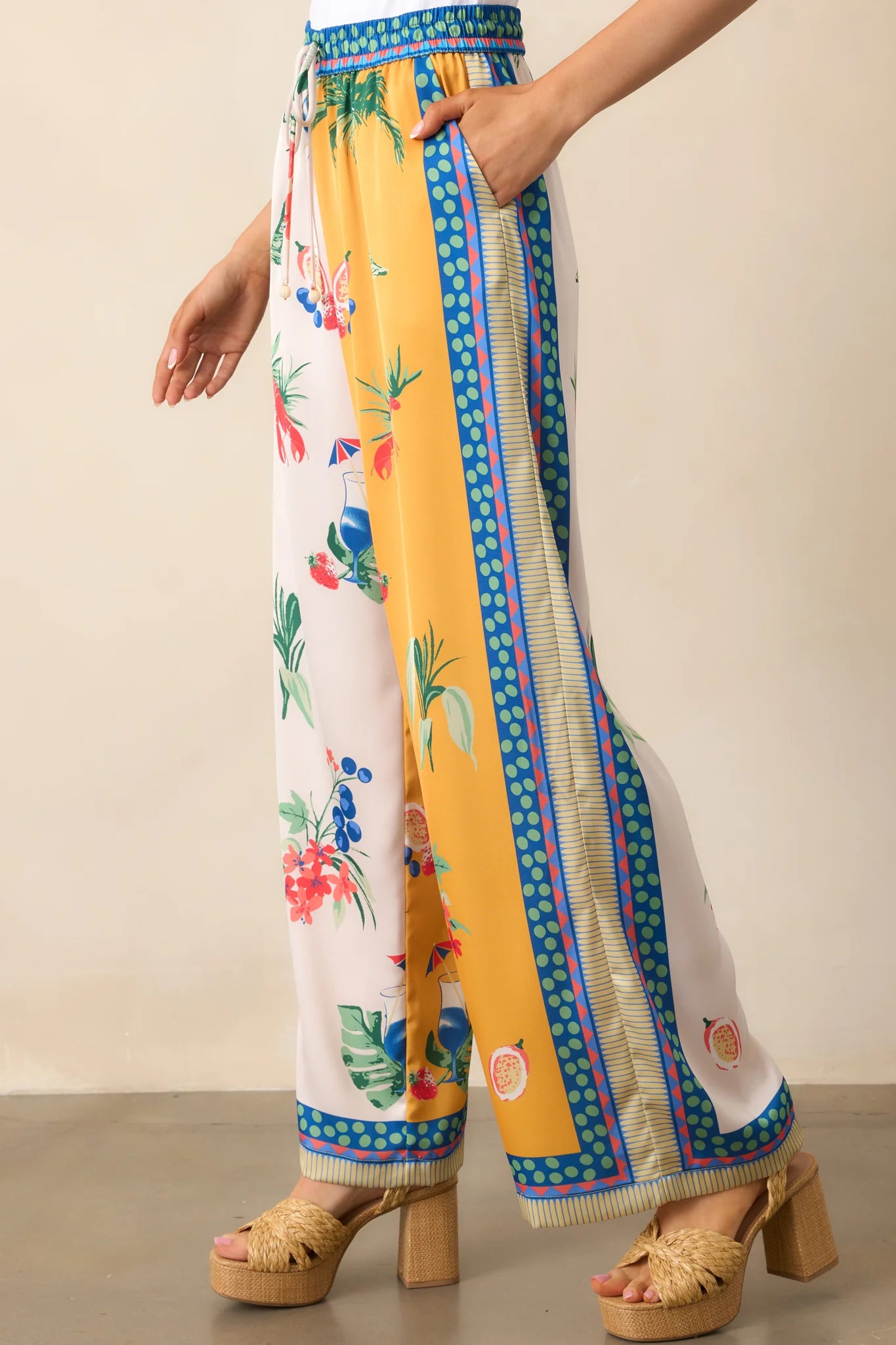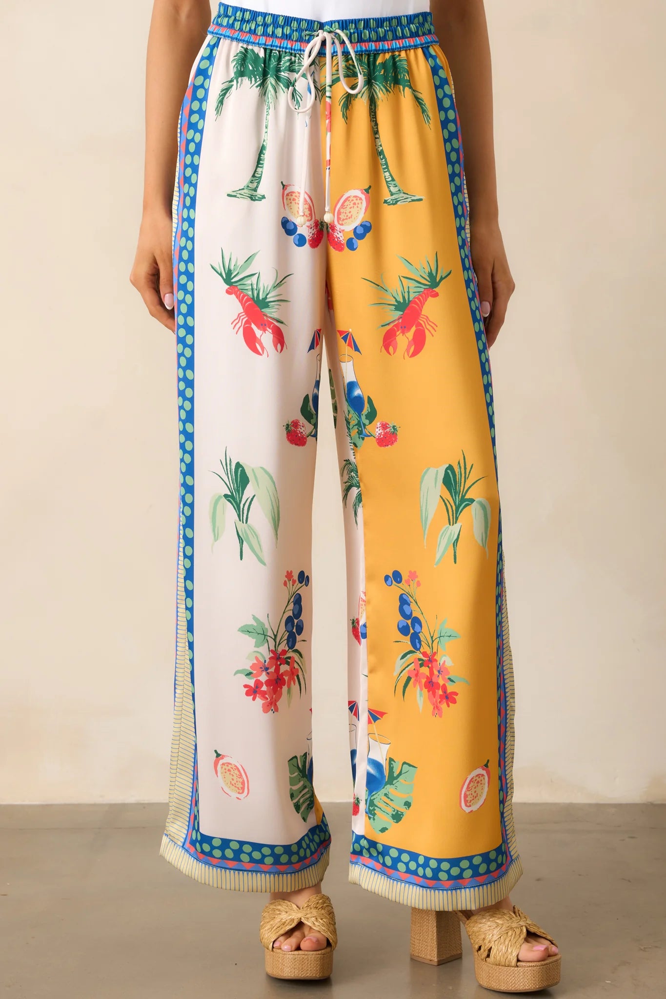 The Deep Yellow Colorblock Coastal Print Set bring a burst of sunny charm to your wardrobe. With a playful mix of coastal-inspired prints and a relaxed fit, they��re perfect for lounging or strolling by the beach in effortless style. These yellow Set feature a colorblock design with various prints and coastal icons, an elastic high rise waistband, adjustable self-tie drawstring, and functional pockets.