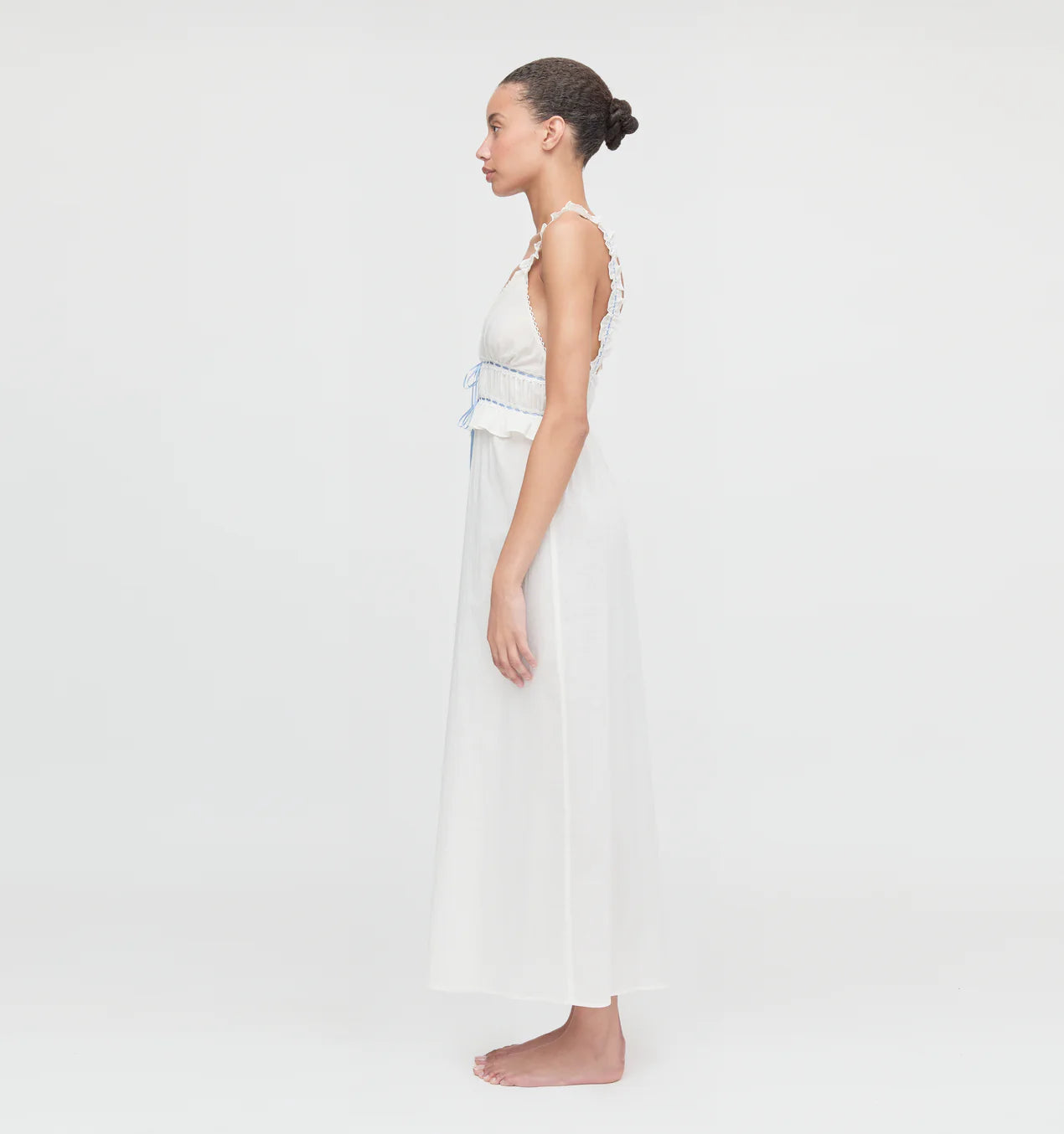 Meet the Delicate ruffle dress. Made from airy, ultra lightweight cotton, the features elasticated straps and a softly gathered bodice adorned with a delicate ruffle trim and functional powder blue satin ties. The bodice detailing creates a flattering waist moment before falling into a relaxed, ankle-length skirt that moves with you.�