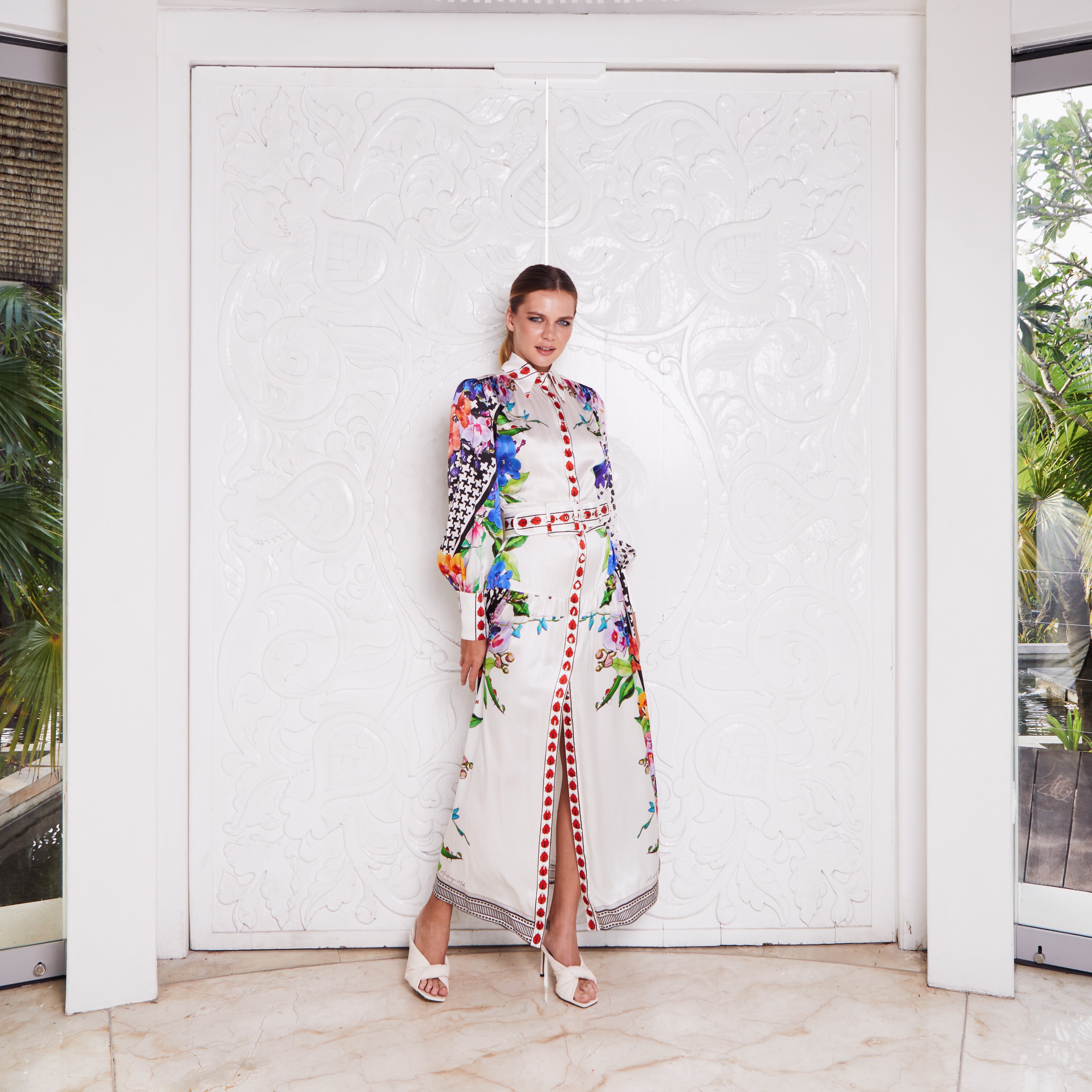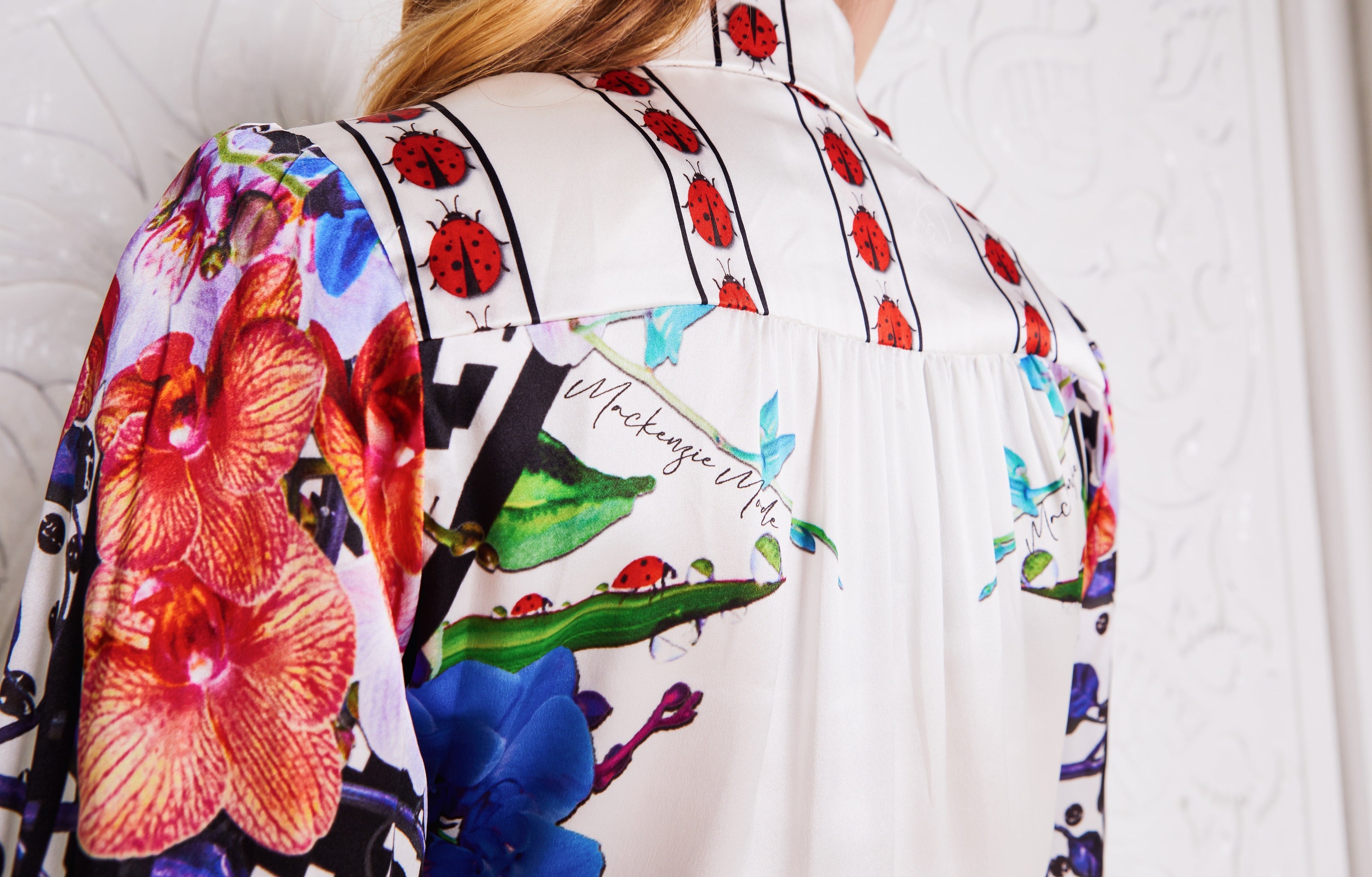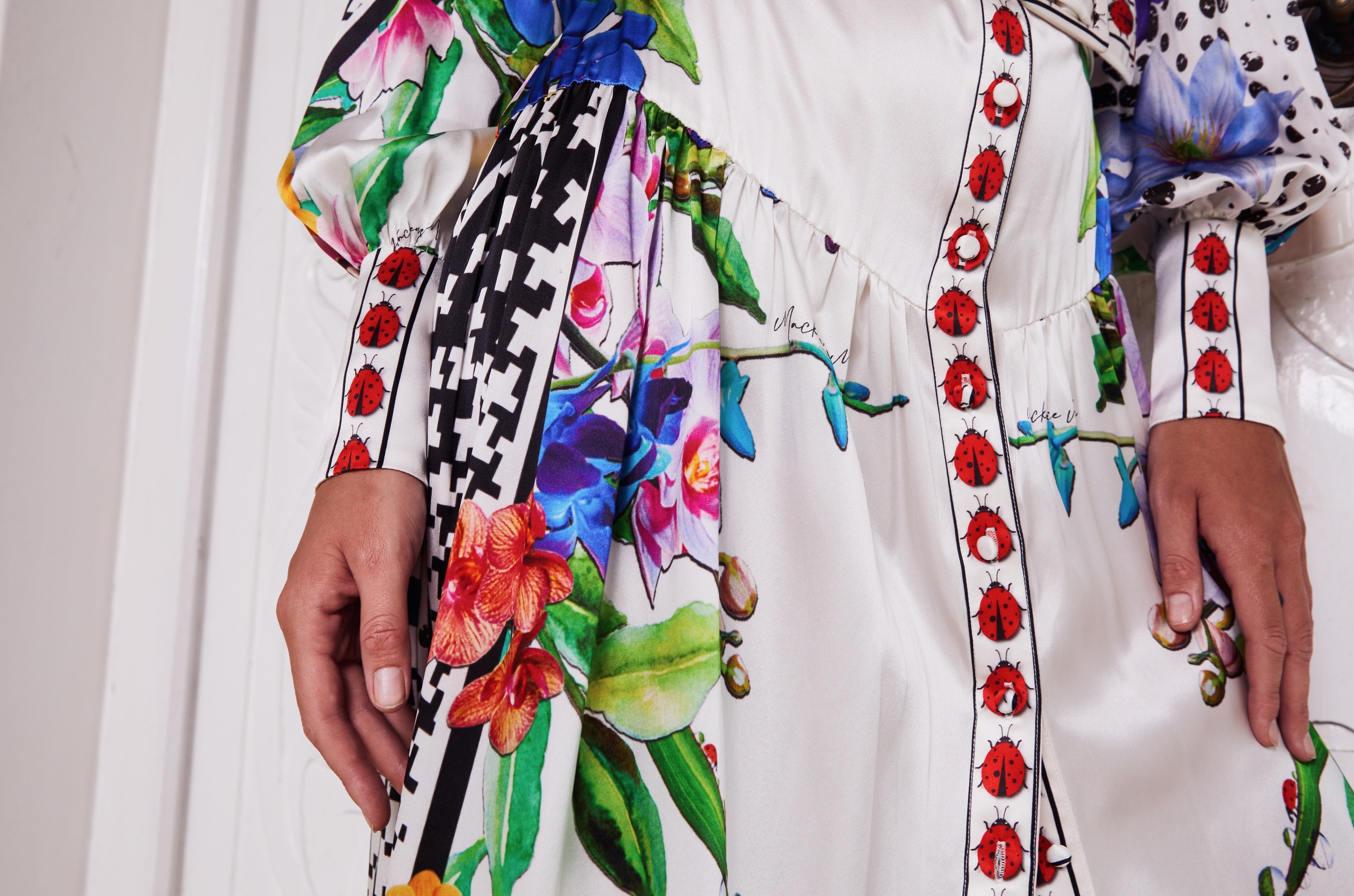 The button front closure allows for easy wear, while the removable adjustable belt gives you the freedom to style the dress to your liking. Whether you're attending a garden party or a special occasion, the Empress Silk Maxi in Ladybug Print is the perfect choice to make a bold and stylish statement.