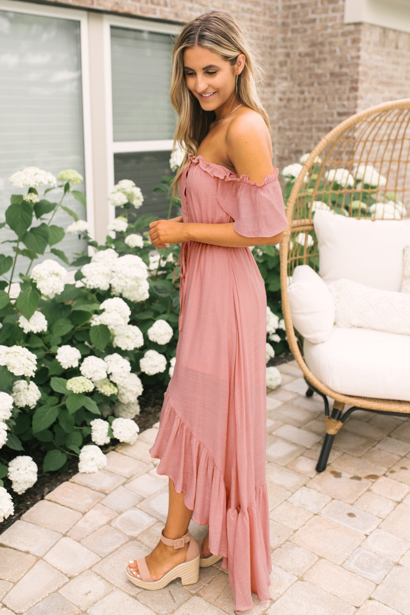 Add this blogger-favorite maxi dress style to your closet this season for a country wedding or any semi-formal, outdoor event! Our Off-Shoulder Button Down Blush High Low Maxi is a must-have for your next special event, perfect for a rustic wedding setting or any big day. This dress is a shining star in our wedding dress collection. Featuring a functional button-down detail at the dress front, a functional drawstring waistline, and a high-low maxi length hemline with ruffle detail, giving it an elegant touch.