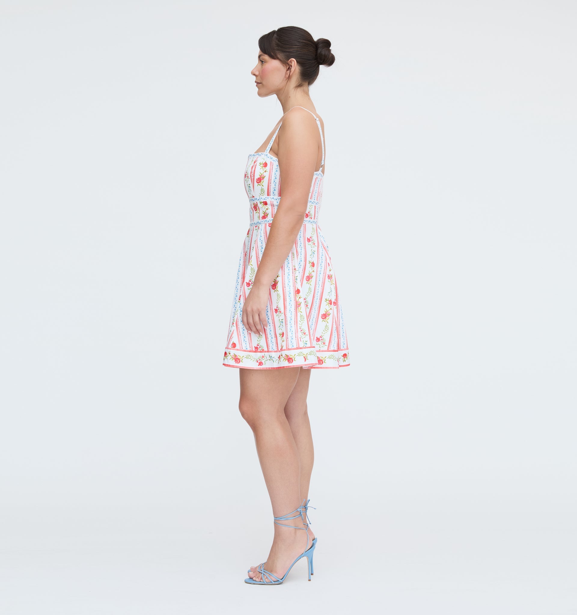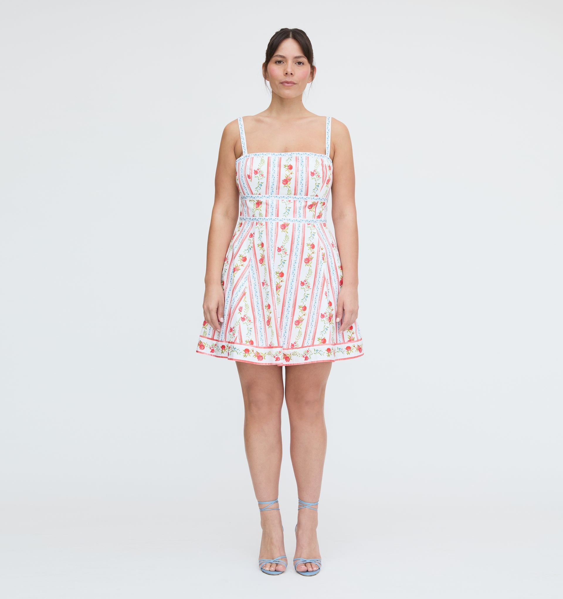 The Pomegranate Stripe print features hand-painted vertical stripes adorned with vibrant red pomegranates, delicate blue blossoms, and leafy green vines. Each stripe alternates with painterly red dots and soft blue florals.�