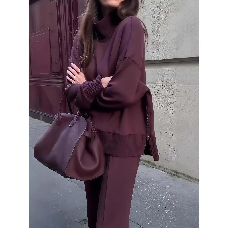 The long-sleeve turtleneck top offers warmth and gentle coverage, while the wide-leg pants create a balanced, flattering silhouette �� especially comfortable for fuller figures. The simple solid color design adds a touch of timeless sophistication that suits both casual outings and cozy indoor moments.