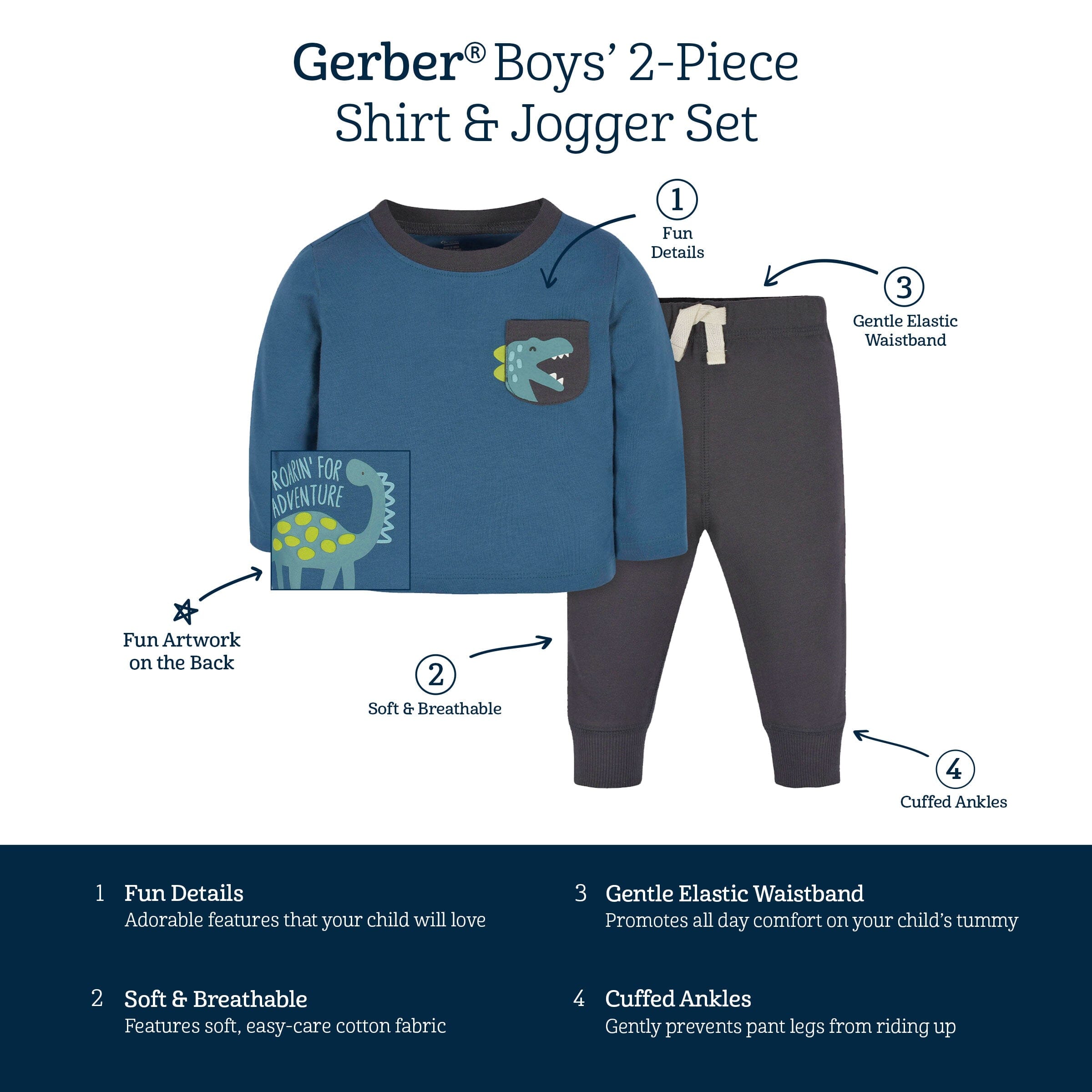 Roarin' for adventure! Our baby and toddler boy 2-piece outfits are so soft and warm, he’ll want to wear one every day! We use STANDARD 100 by OEKO-TEX® certification on products tested in an independent laboratory against a list of more than 400 harmful substances, including PFAS.