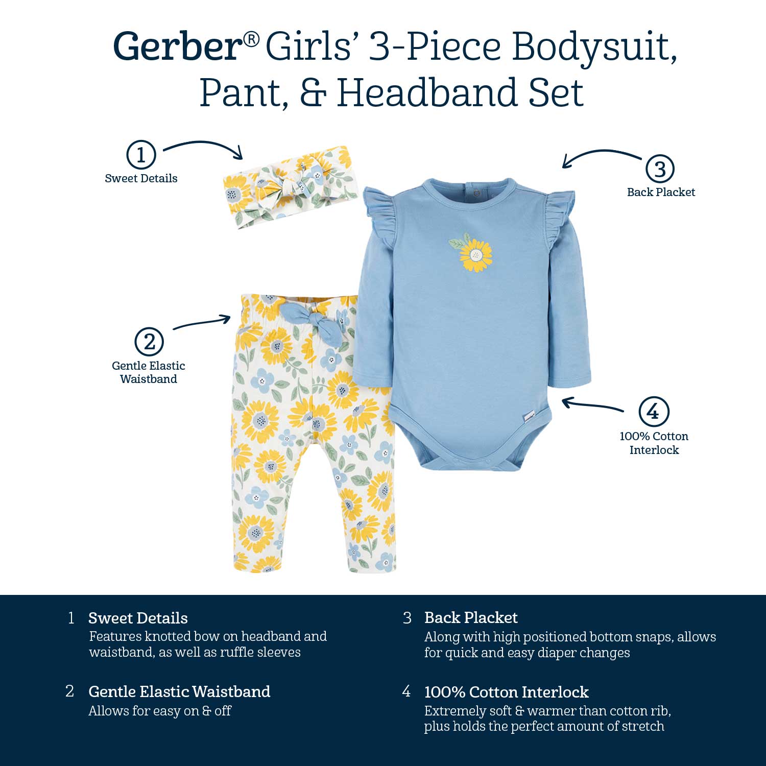 3-Piece Baby Girls Sunny Garden Onesies® Bodysuit, Pants & Headband Set