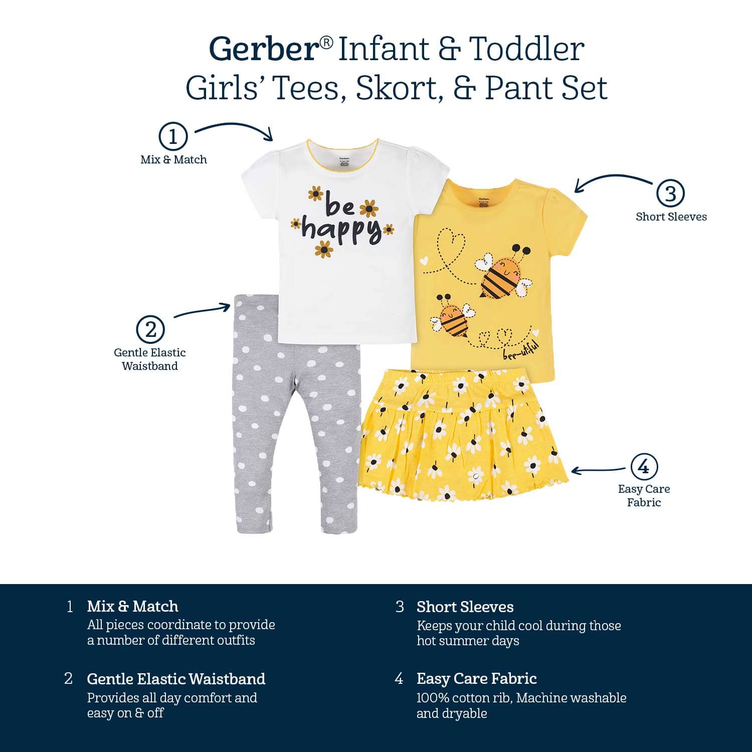 Our adorable four-piece sets are the perfect spring and summer outfits for babies and toddlers! Each one is made with soft cotton fabrics that your child will adore. Our essentials have been independently certified with STANDARD 100 by OEKO-TEX® so that you don’t have to worry about harmful substances in your baby’s wardrobe.