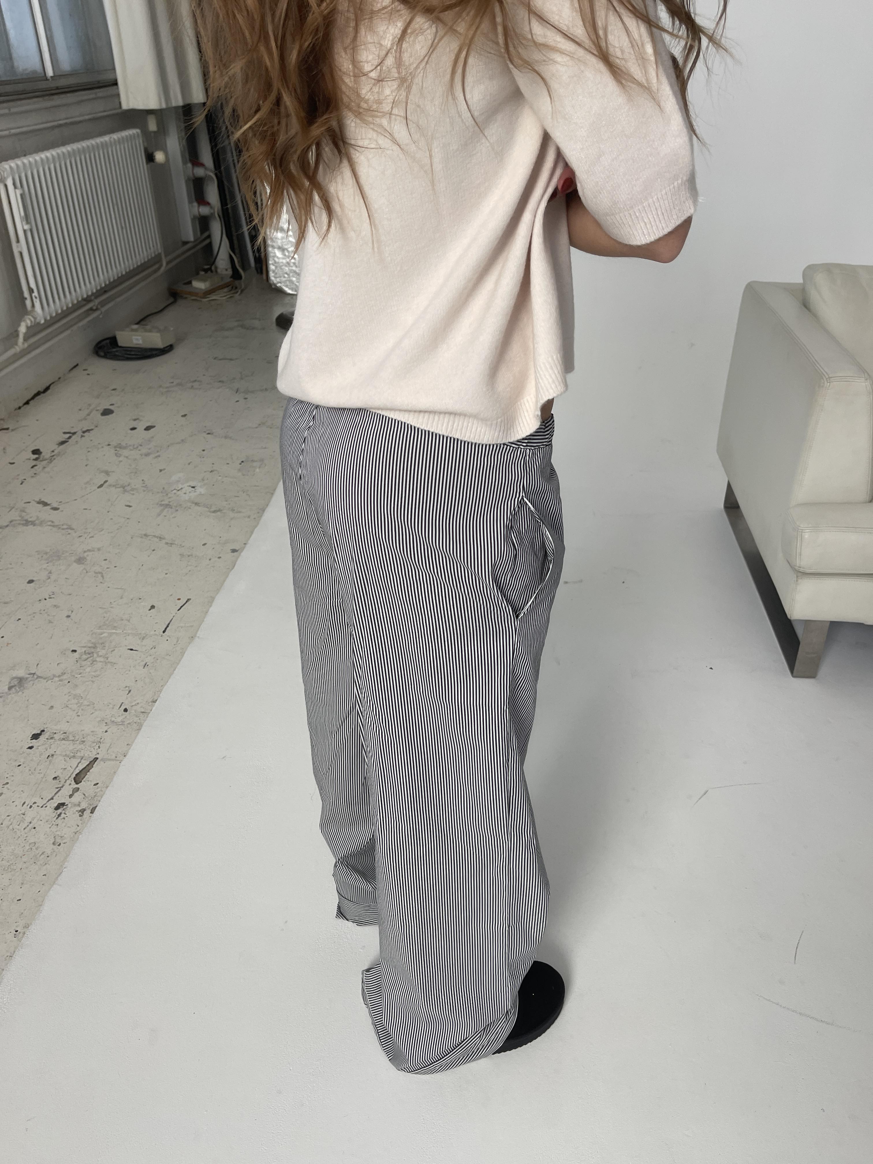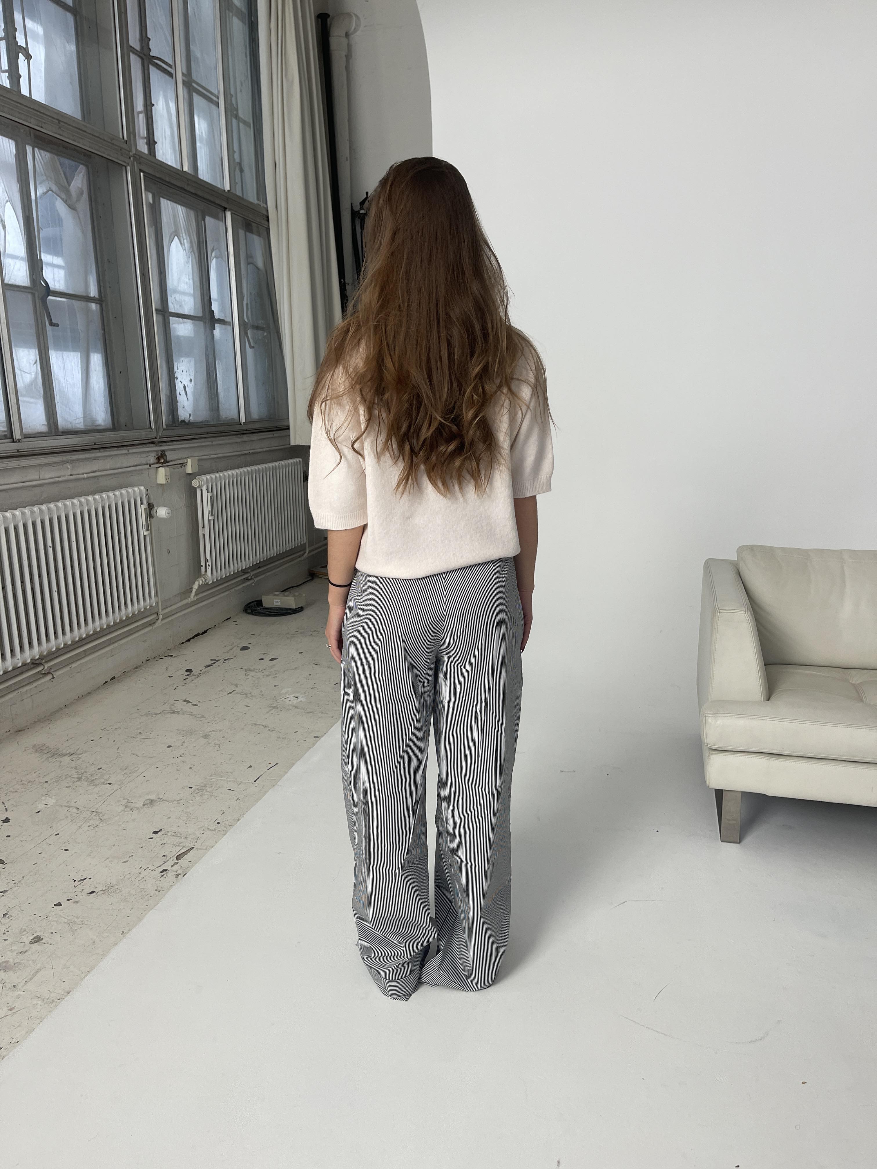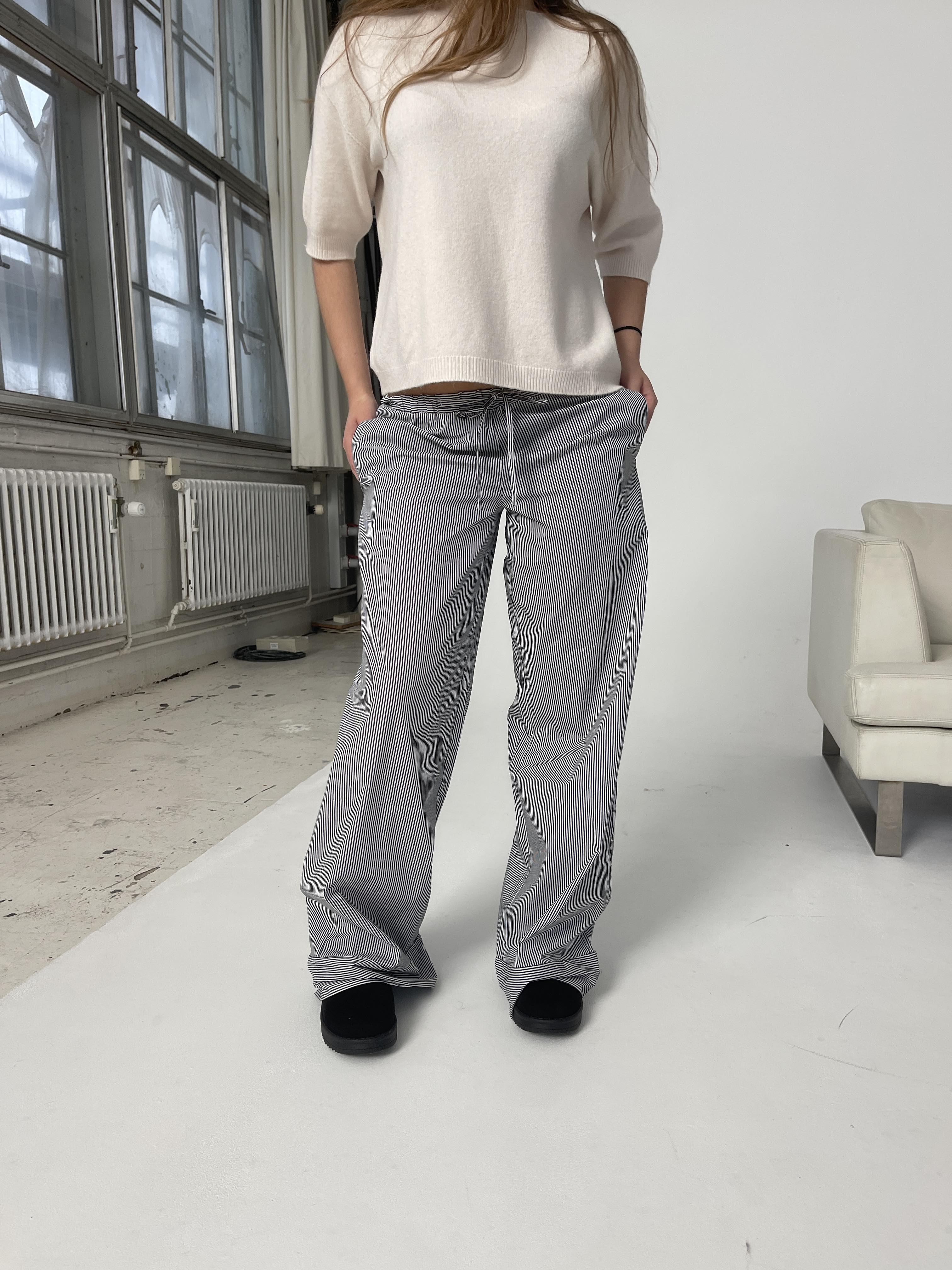 These pants have a low waist with a loose and straight fit. The pants have an elastic waistband with horizontal stripes that can be tied with a drawstring. The rest of the pants have vertical stripes, except for the bottom, which also has horizontal stripes. The pants have 2 side pockets.