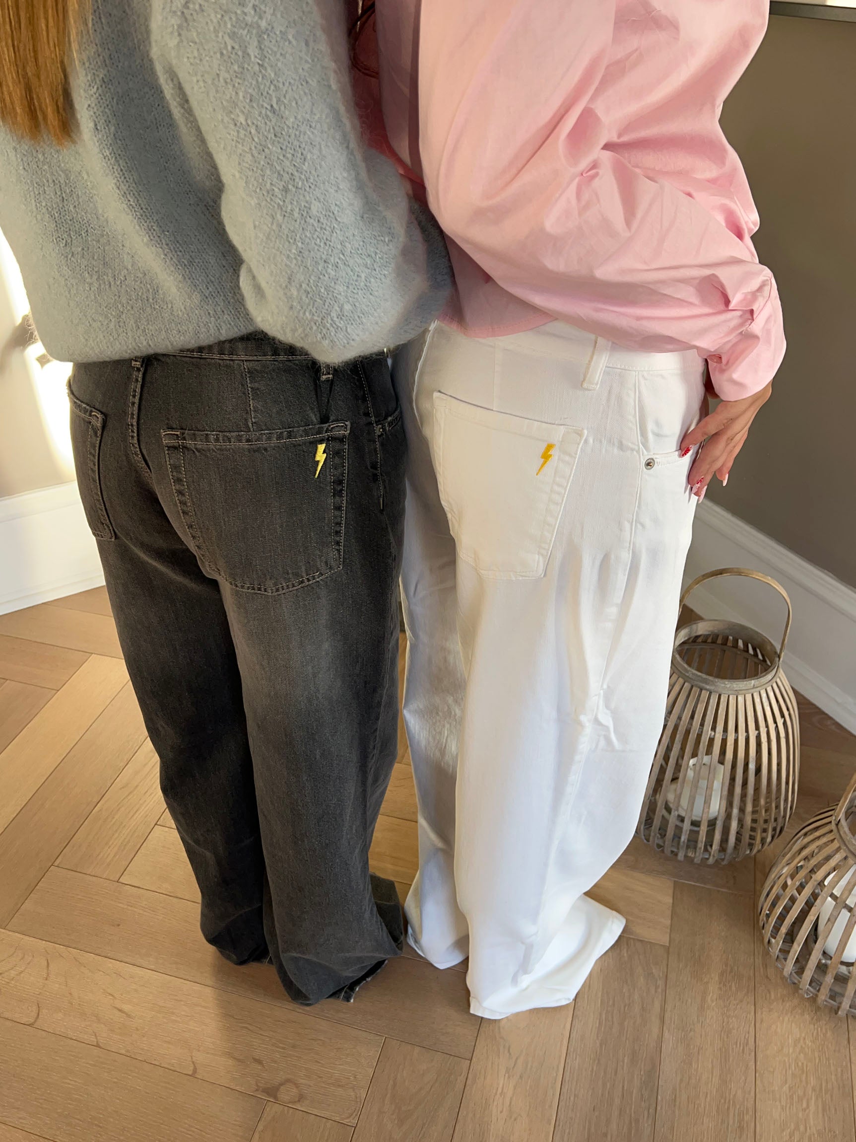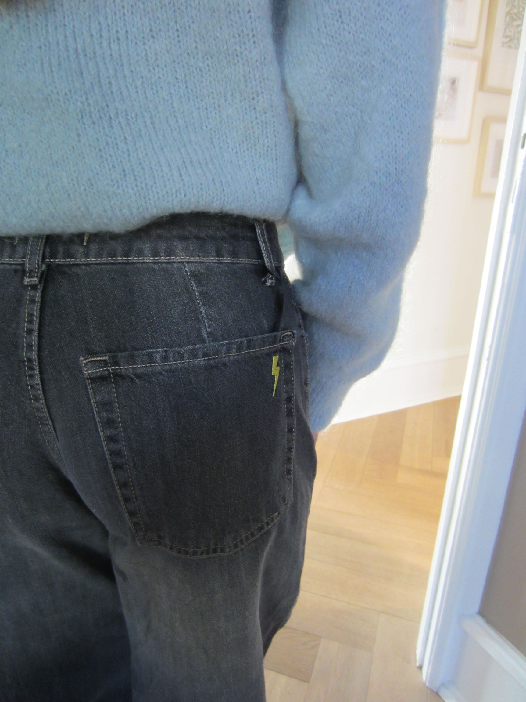These jeans have the coolest lightning bolt detail at the back, making them unique. They have a low waist and a loose, long fit. The jeans come with belt loops and a zip and button closure at the front.