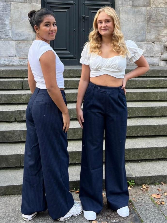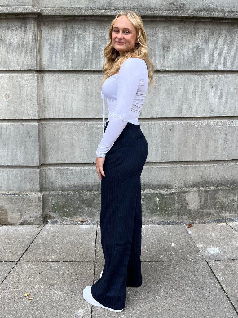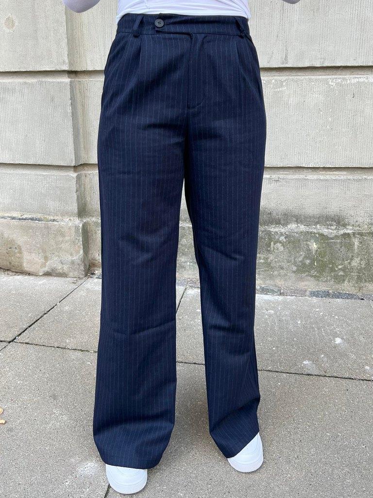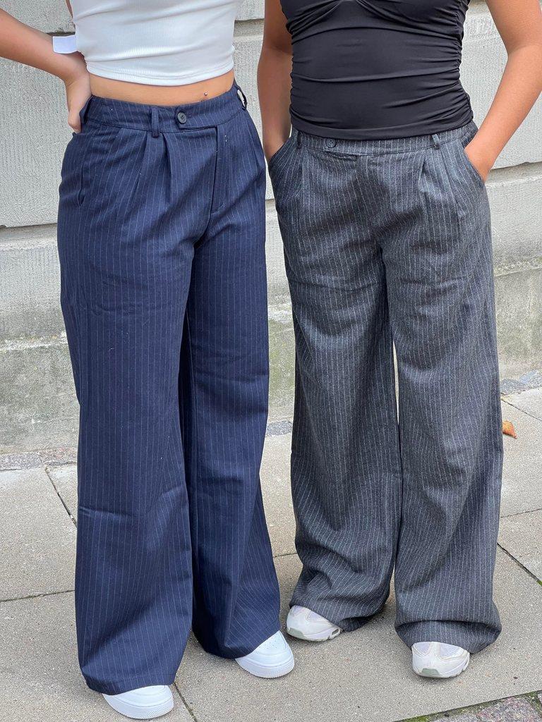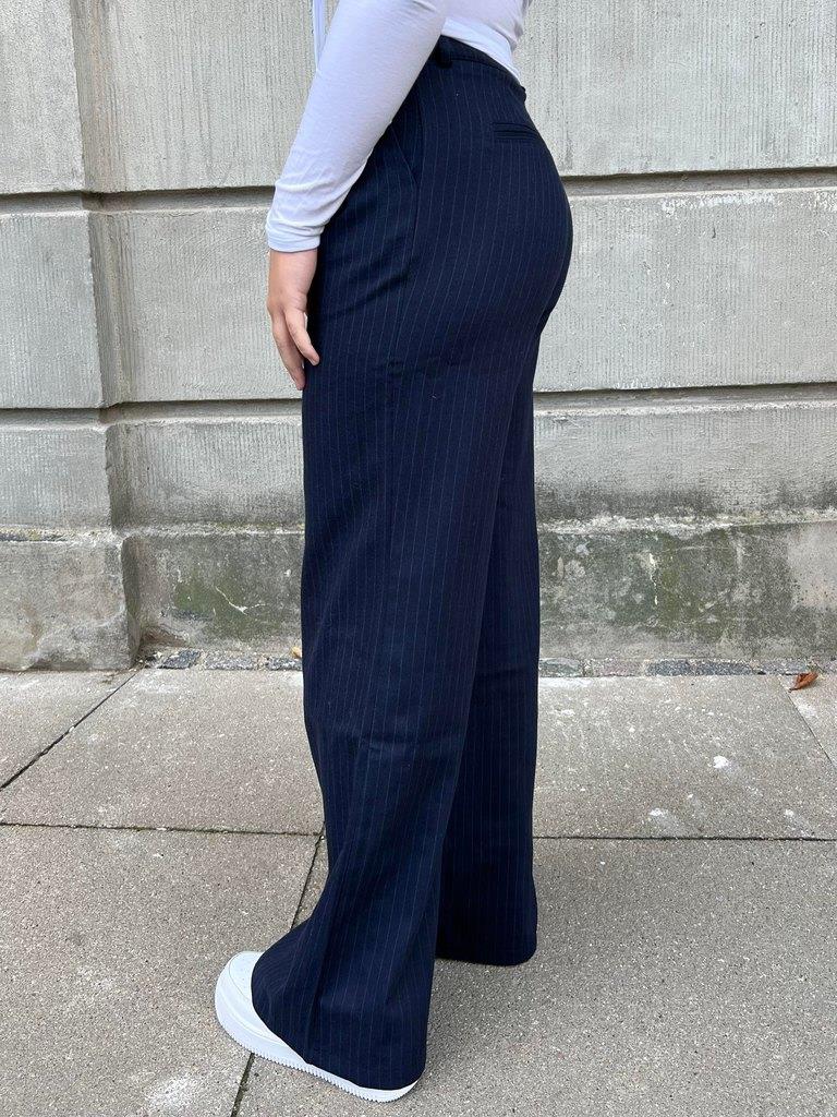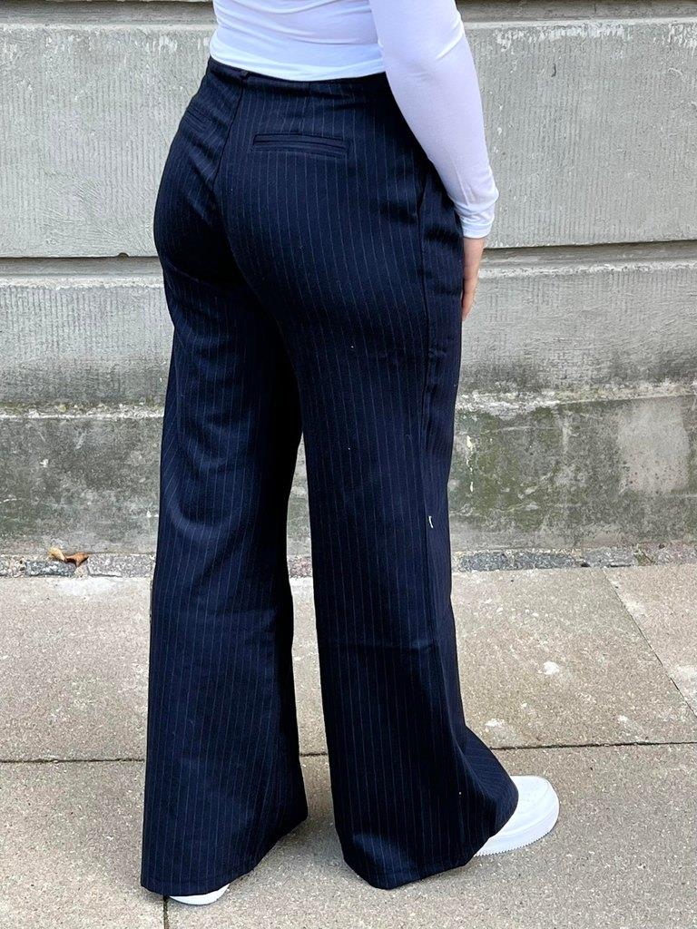 Trousers with straight fit, stripes and side pockets. Has decorative pockets at the back and pleats at the front. Closes with a zip and staggered button.Colour: navy with stripesMaterial: 40% cotton, 25% polyester, 20% wool, 10% acrylic and 5% other fiberThe model is 165cm and wears size S