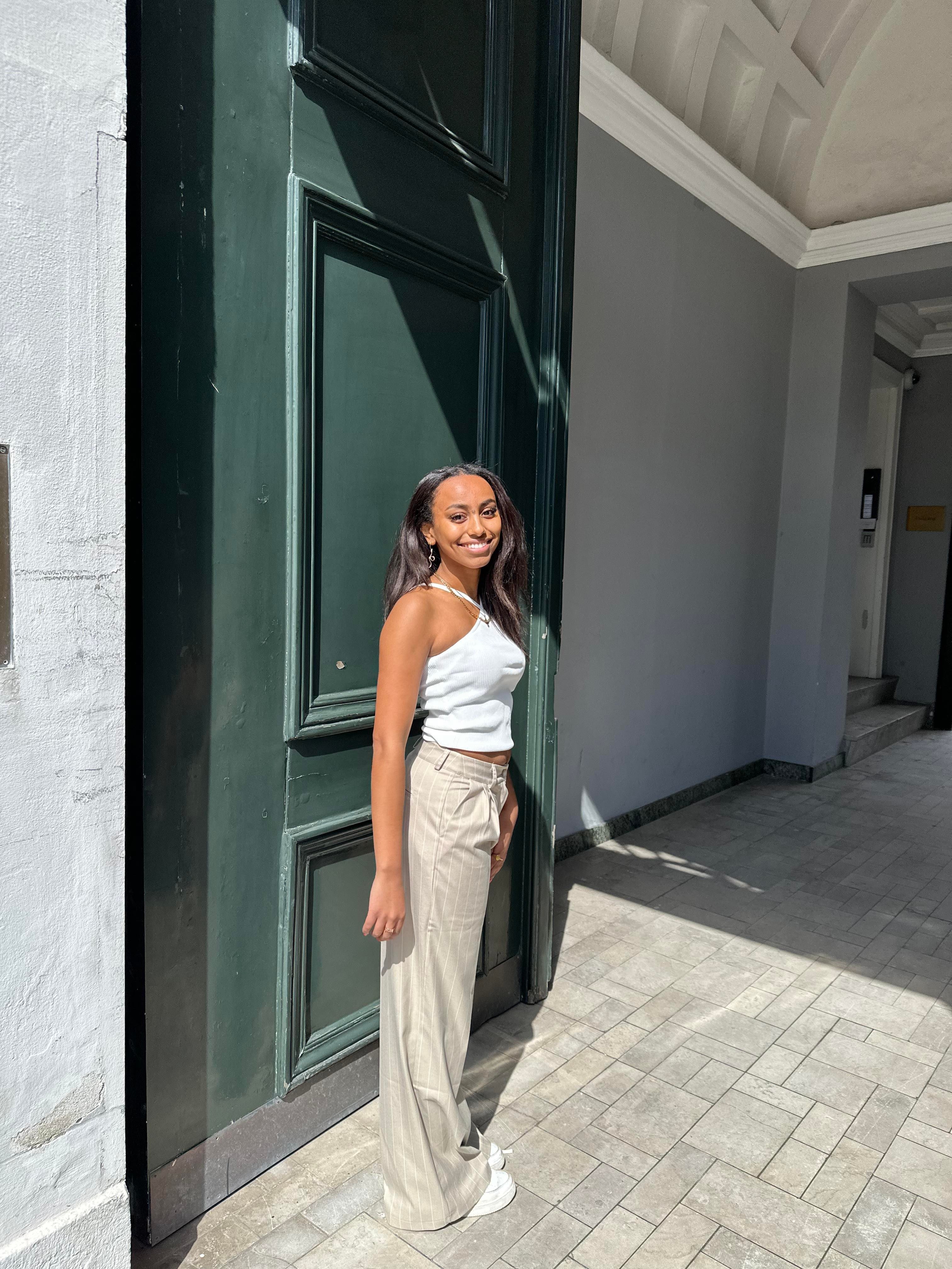 Suit trousers with a straight fit. The trousers can be styled both mid- and low waist and have the finest details. The trousers close with a button and zip, and have decorative pockets at the back, and two pockets on each side of the leg.