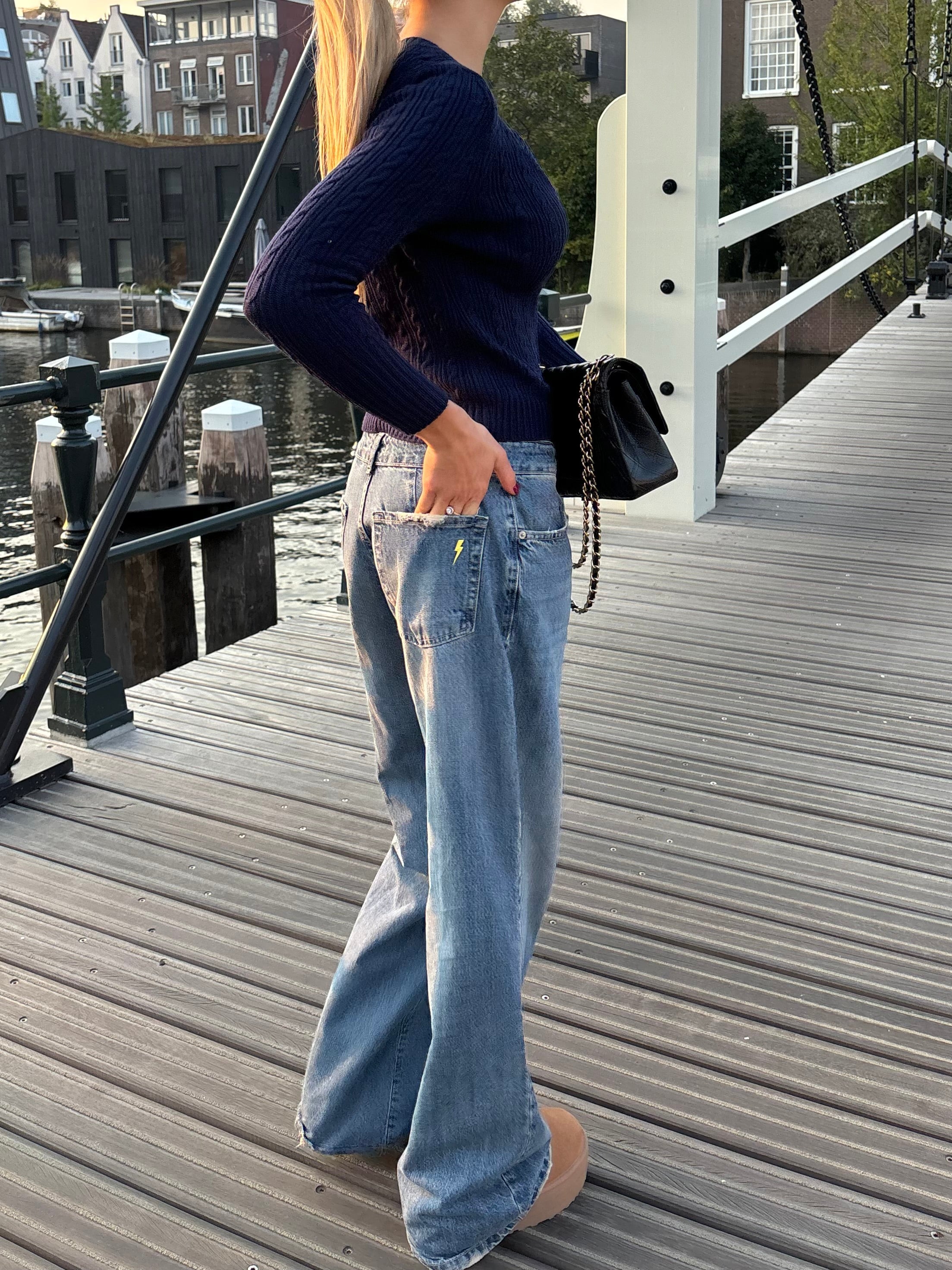 These jeans have the coolest lightning detail at the back that makes them unique. The jeans have a low waist and a loose and long length. They have belt loops and a front zipper and button closure.
