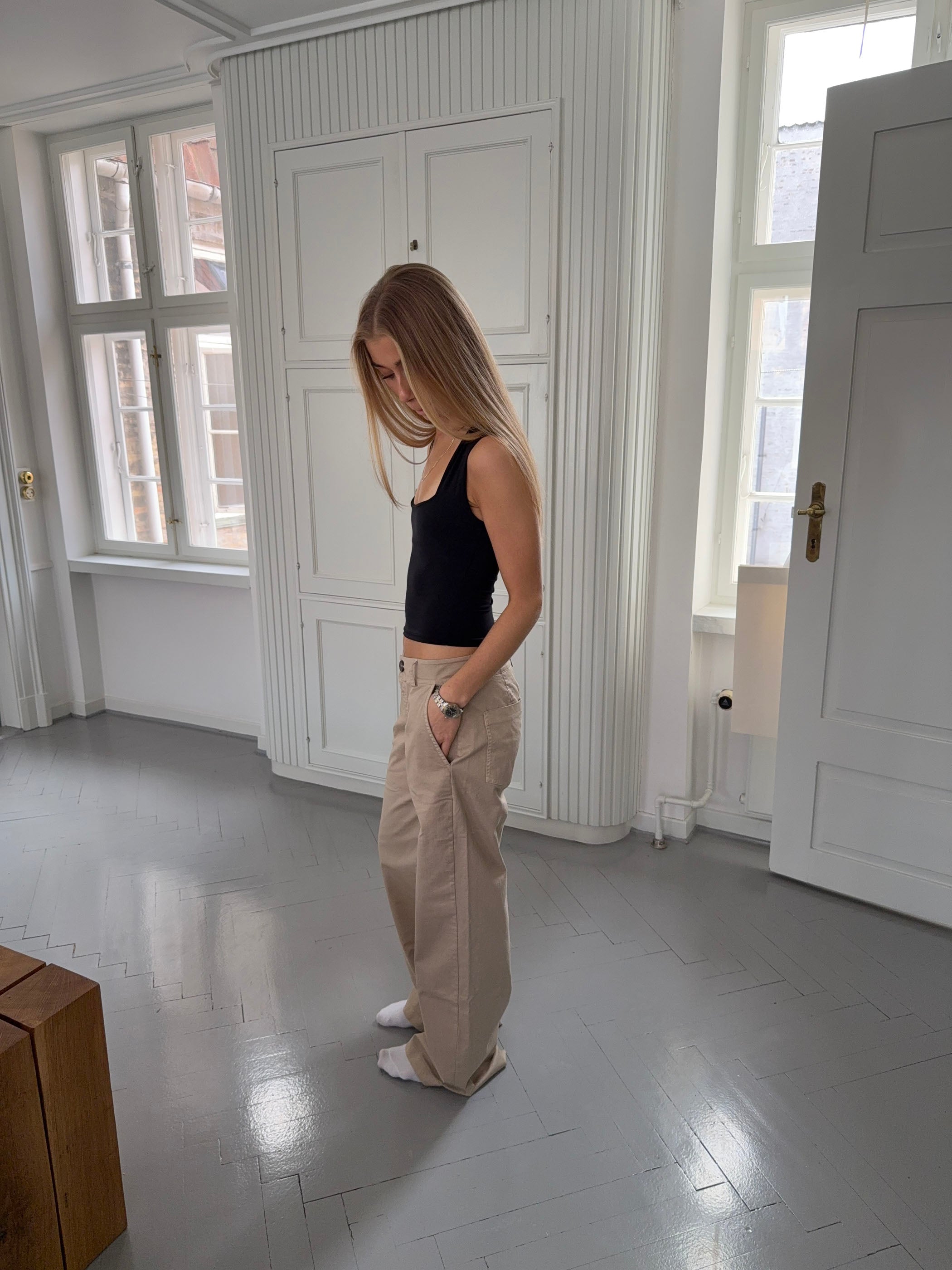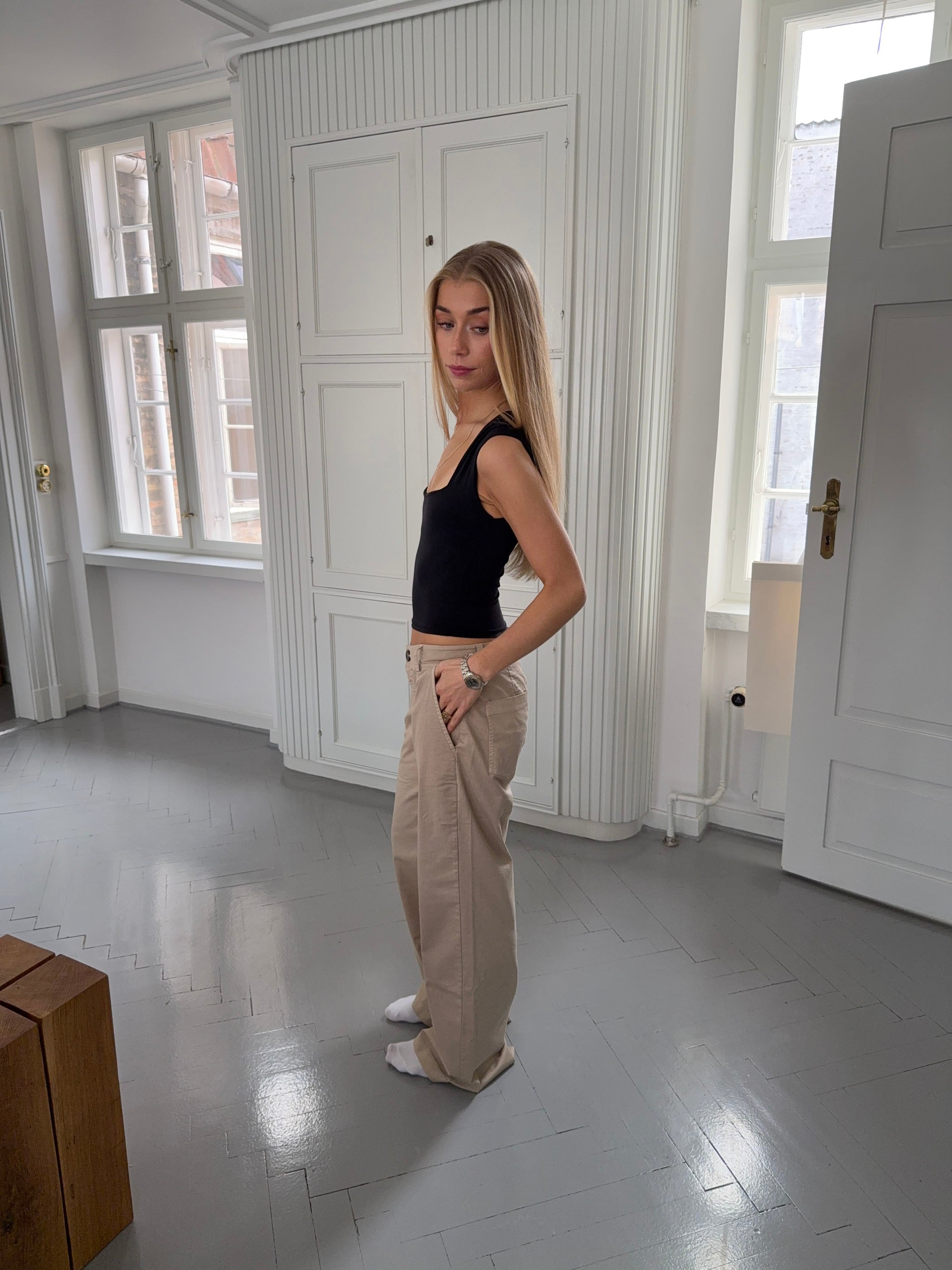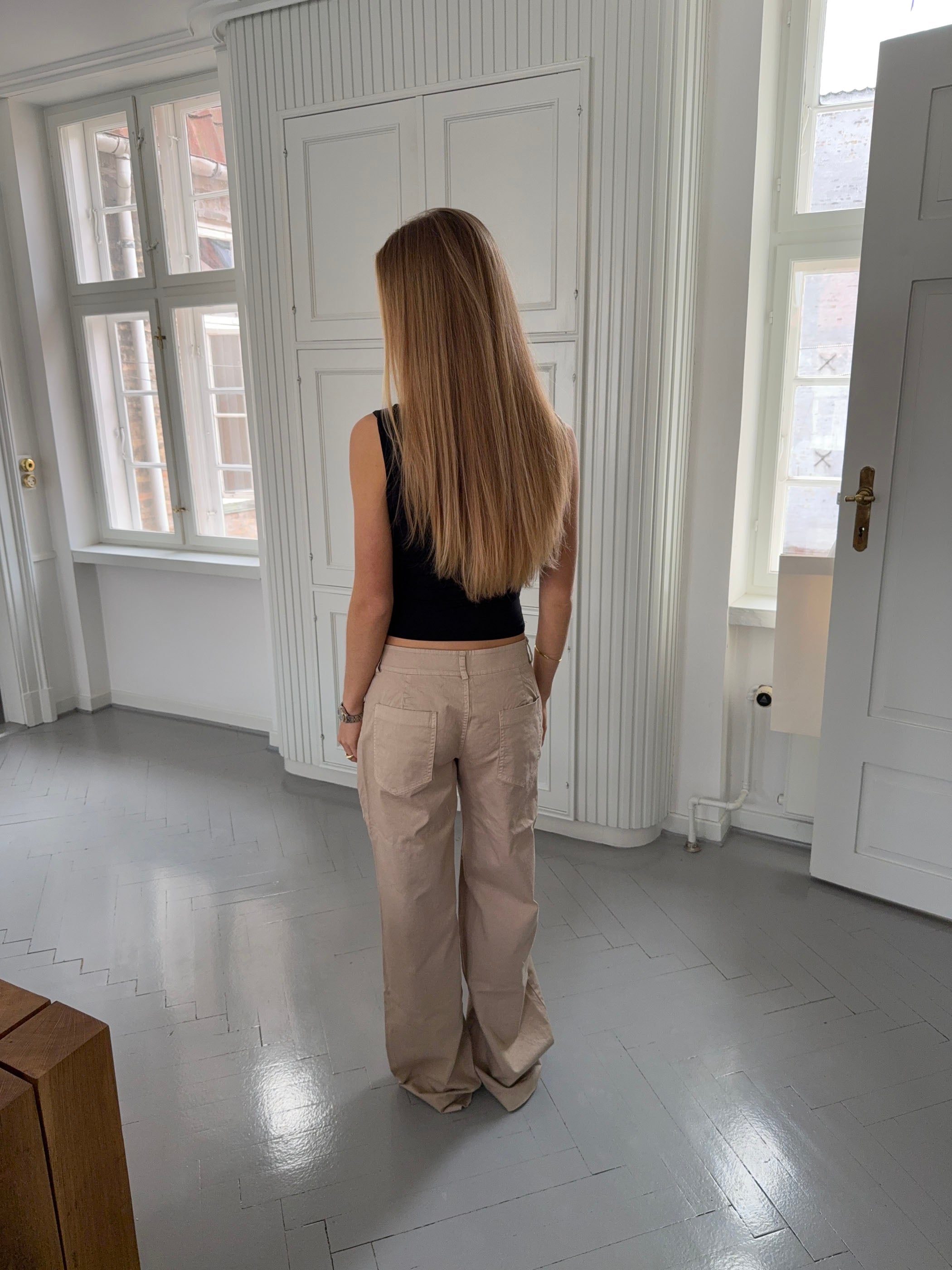 The Ama oversized trousers in beige combine comfort with a modern, relaxed vibe. Their loose fit creates a cool, effortless look, while the lightweight fabric ensures freedom of movement and all-day comfort. Featuring an elastic waistband and wide legs that drape beautifully, these trousers offer an airy silhouette. A versatile piece that can be dressed up or down—perfect with a fitted top or a loose shirt, depending on your mood and the occasion.