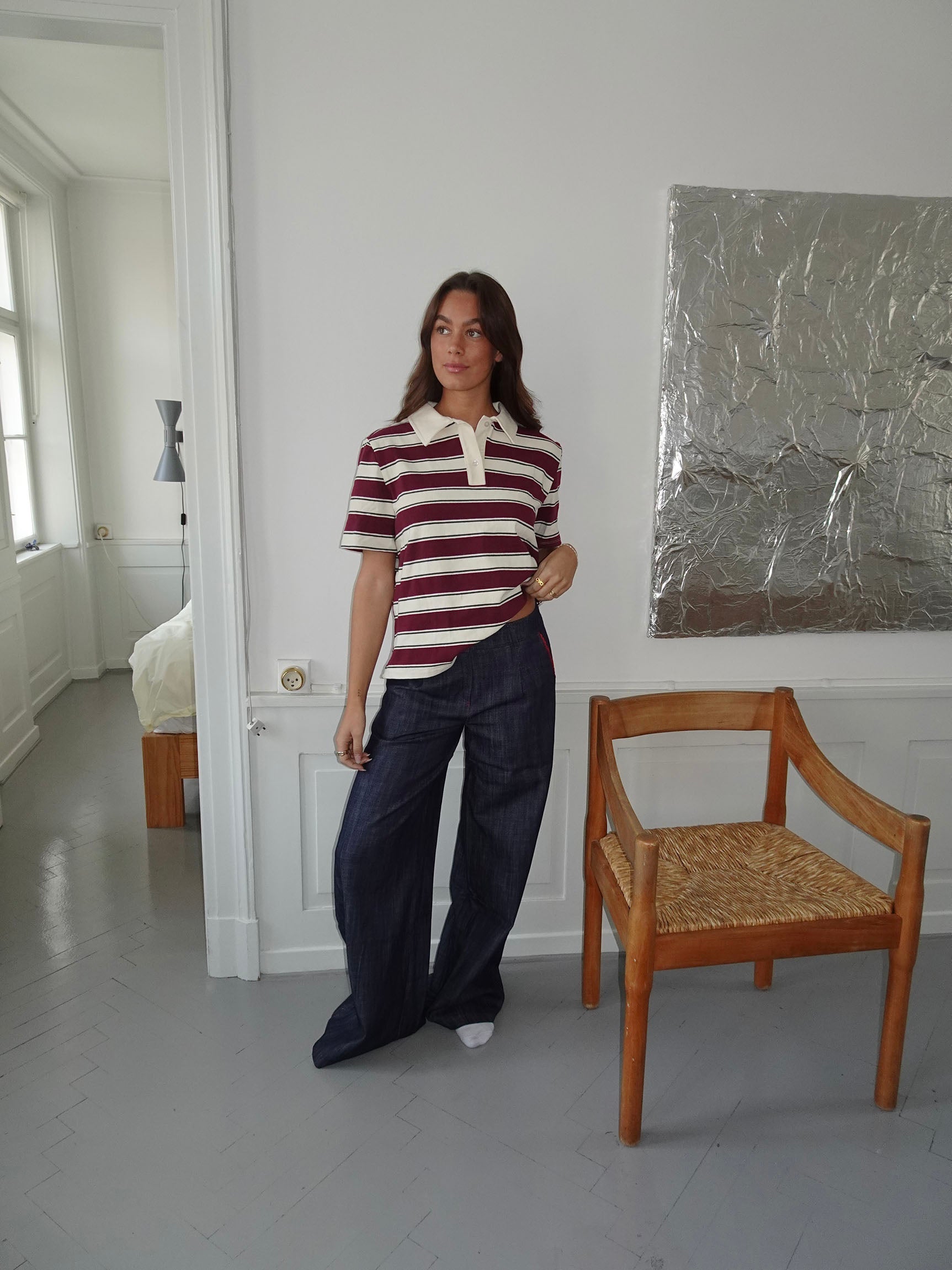 Our Astrid trousers in blue stand out with contrast-stitched red details and a wide waistband that creates a bold, edgy look. The straight-leg fit makes them easy to style, while the red stitching adds a modern twist. Pair them with a simple tank top or a cropped shirt for a cool, street-inspired outfit.