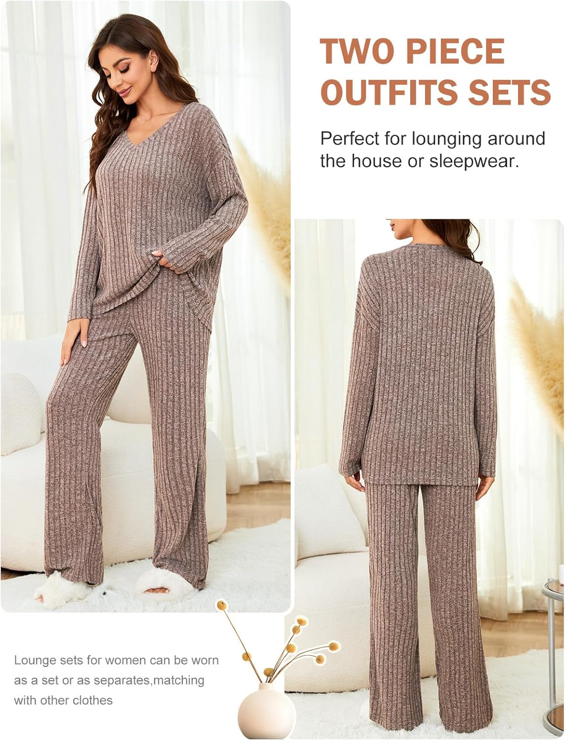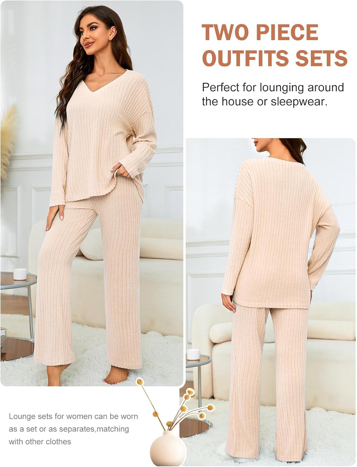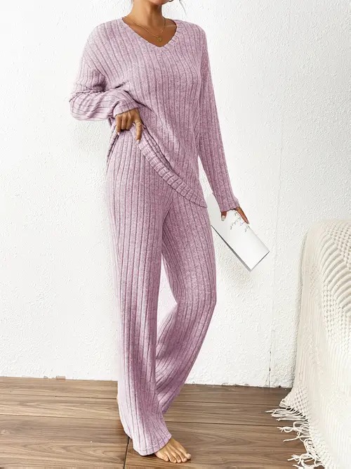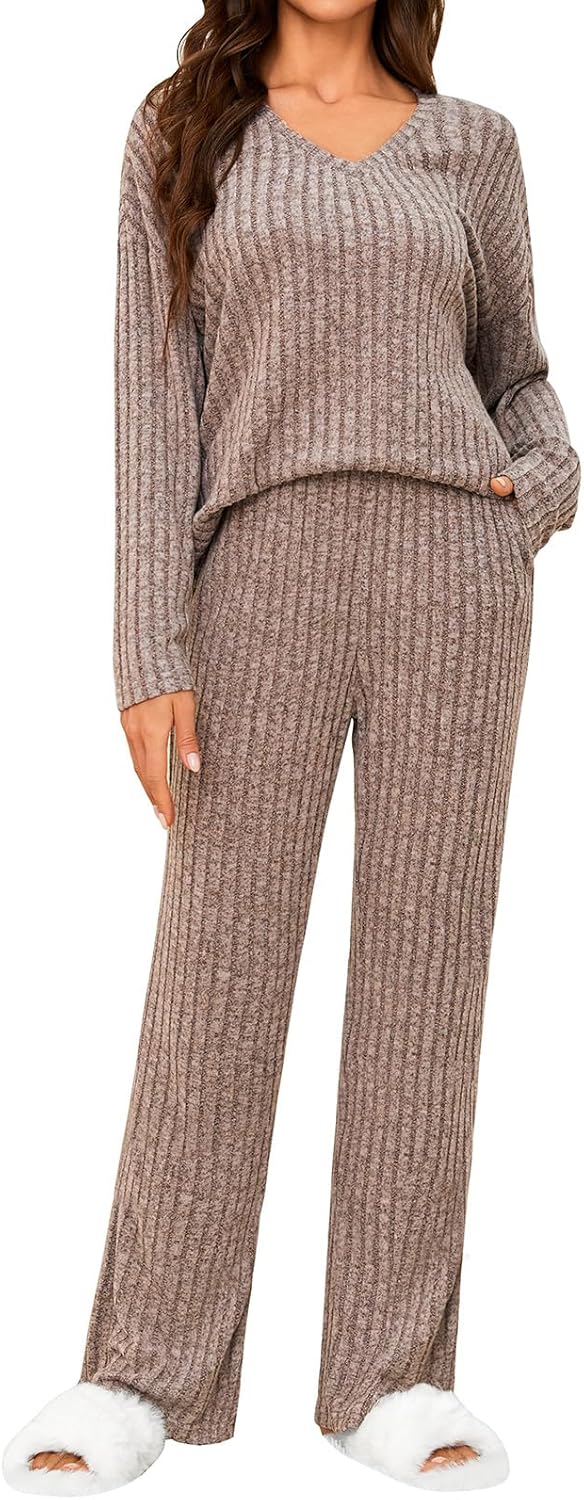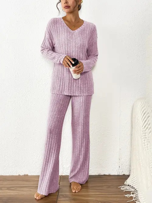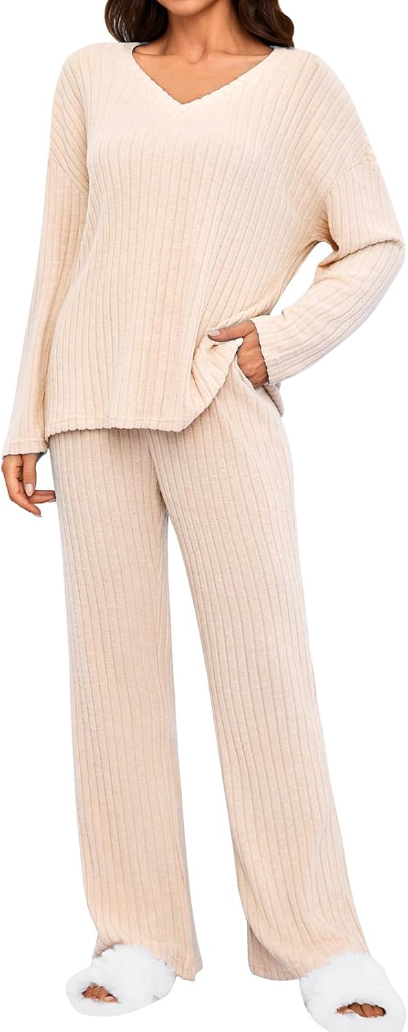 • Women's 2 Piece Outfits Pajamas Set Rib Knit Matching Lounge Sets Pajama Set Long Sleeve V Neck Tops Wide Leg Pants