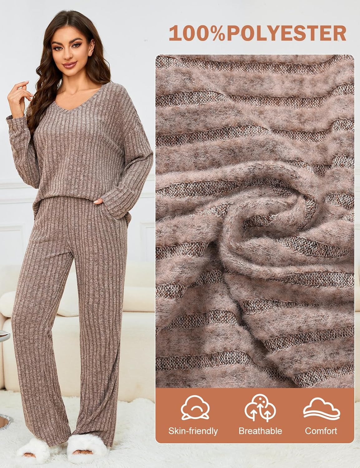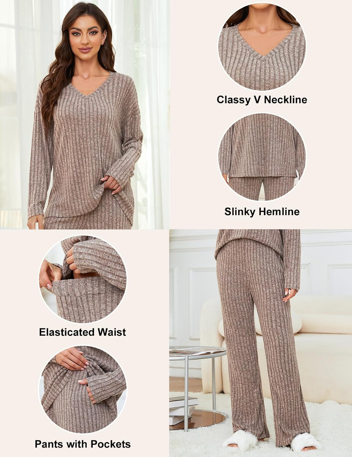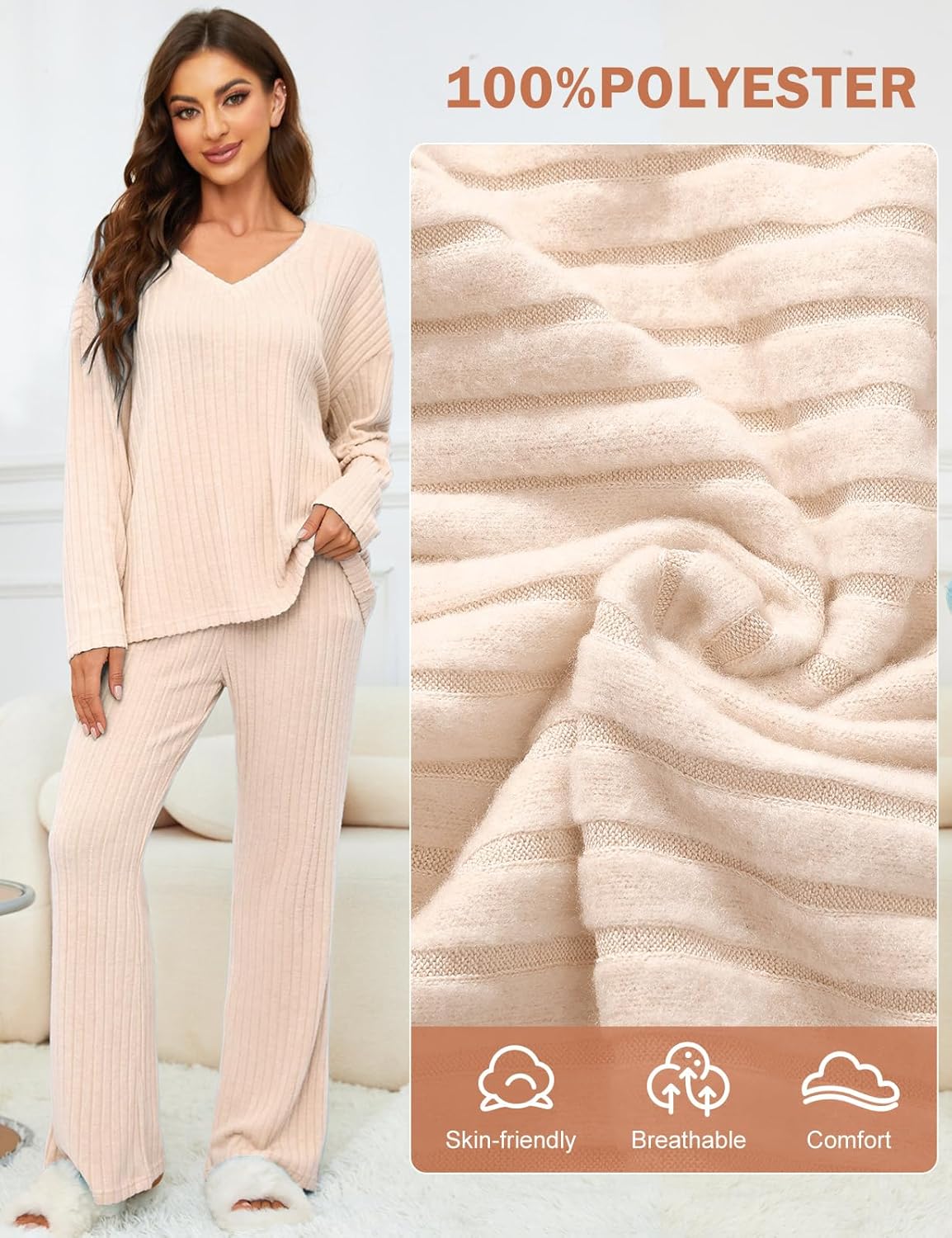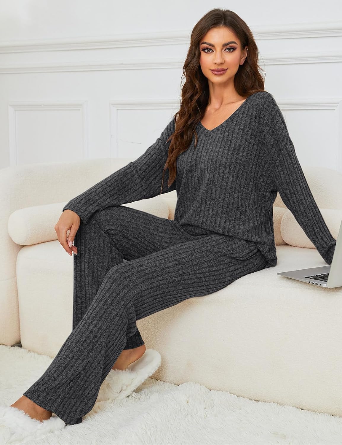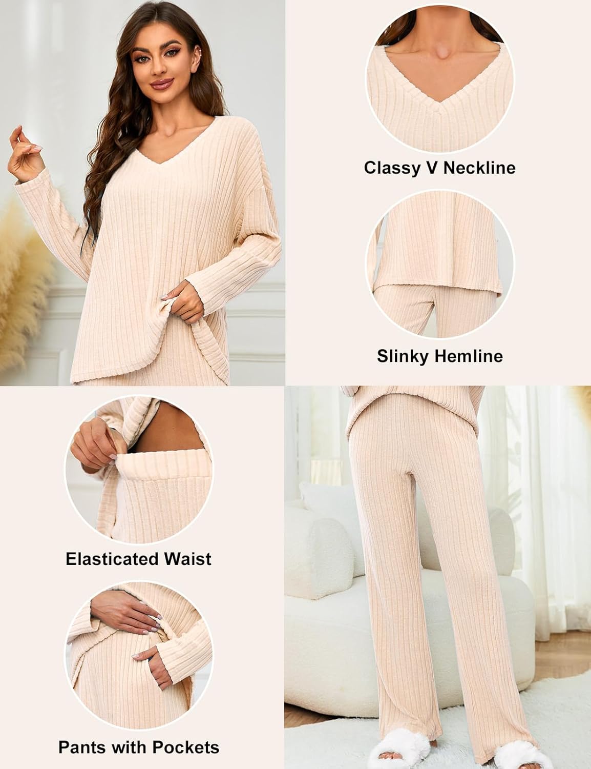 • Women's 2 Piece Outfits Pajamas Set Rib Knit Matching Lounge Sets Pajama Set Long Sleeve V Neck Tops Wide Leg Pants
