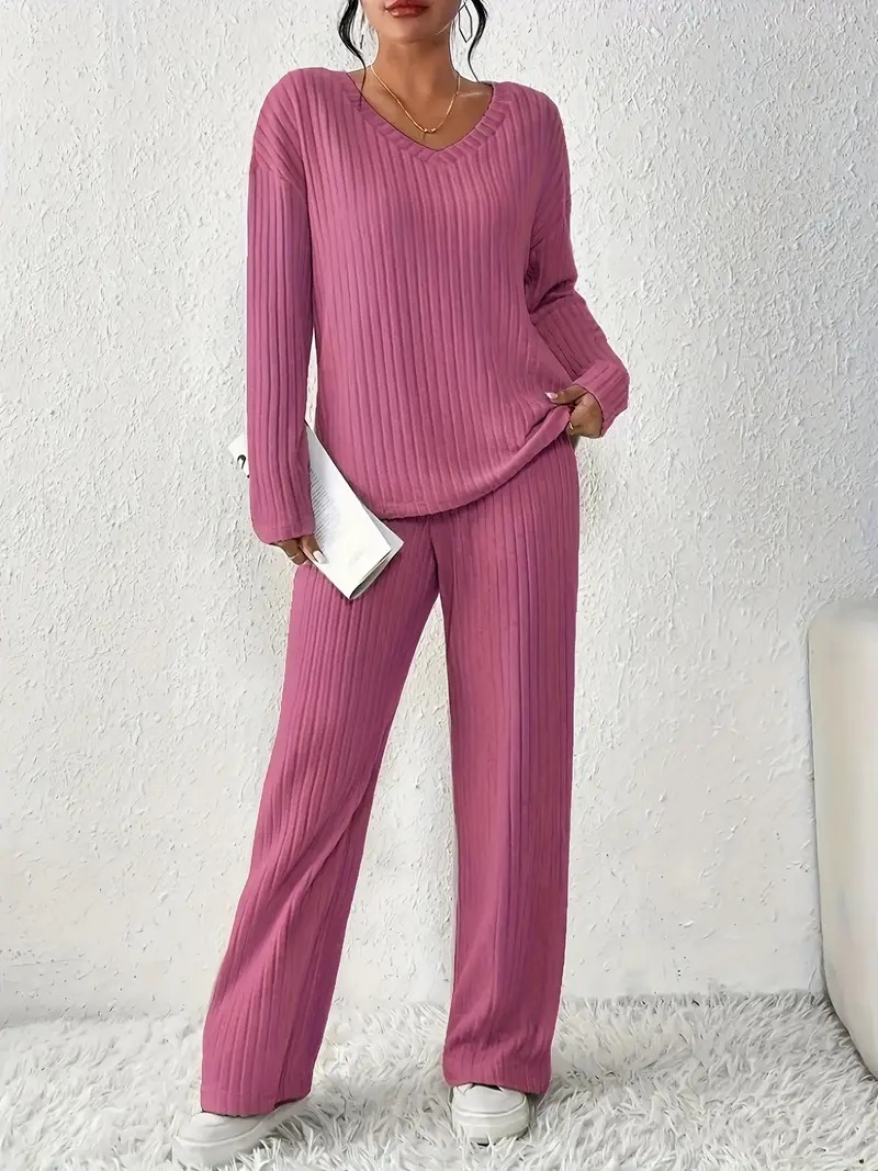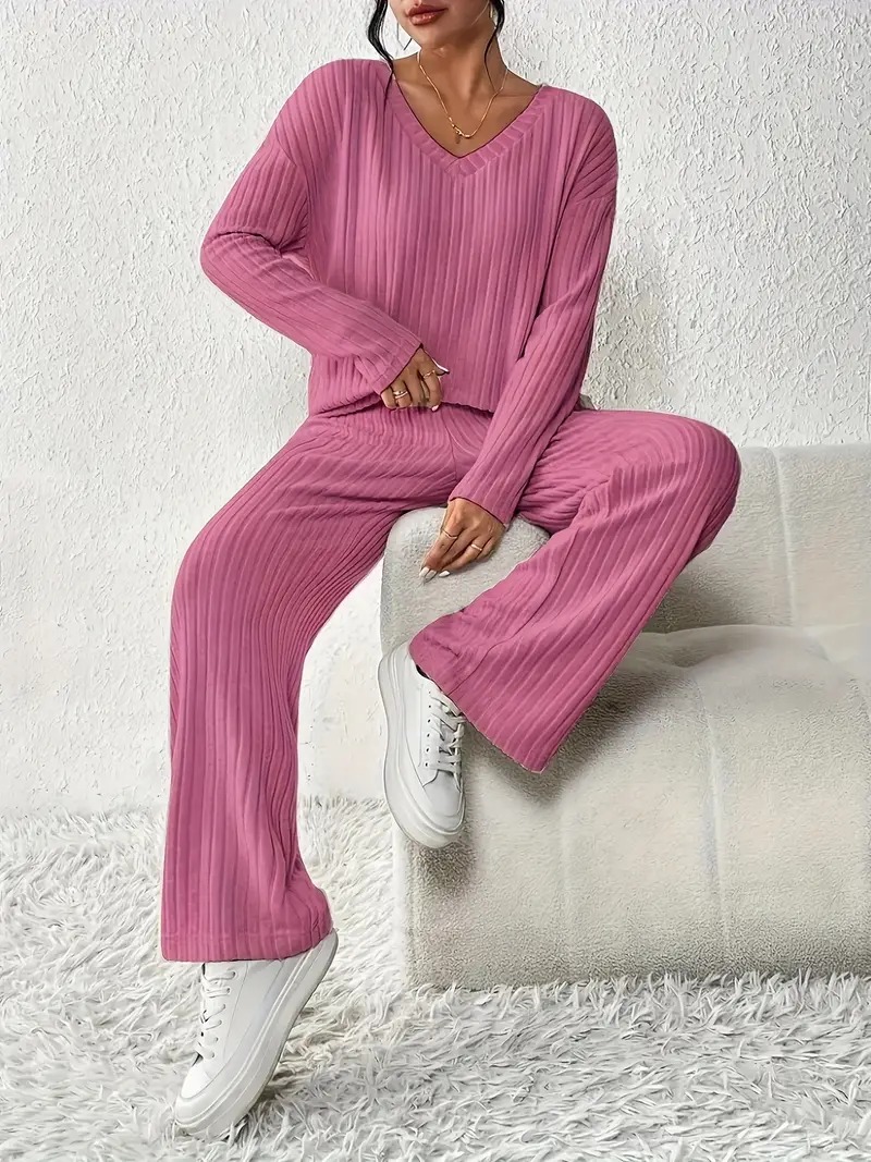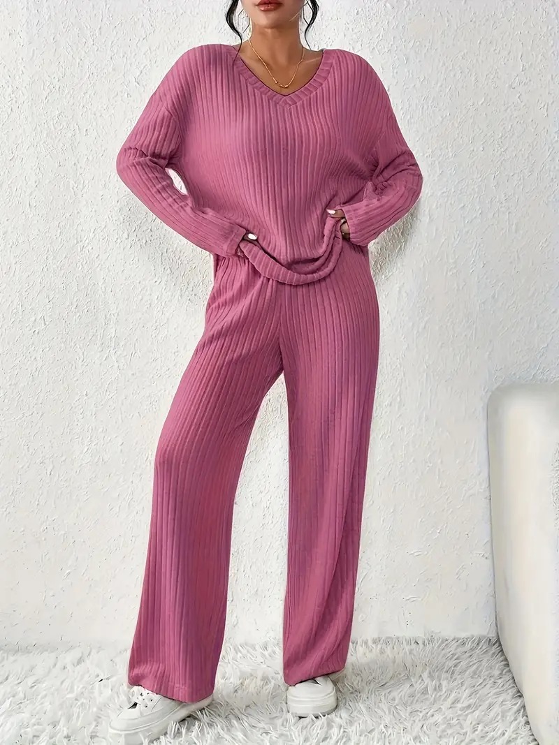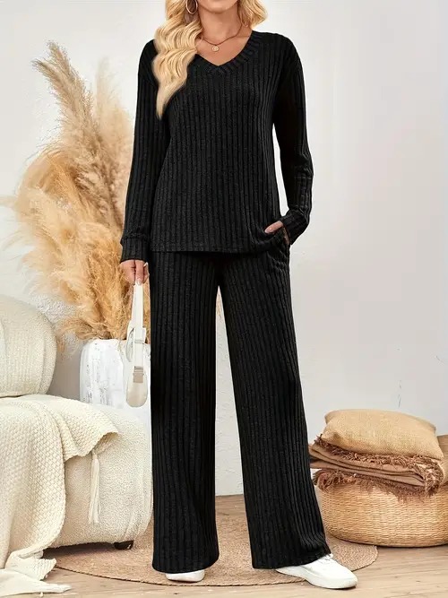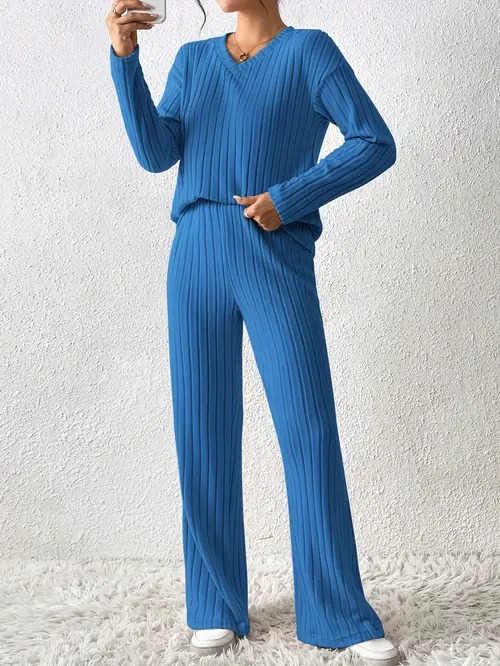 ribbed solid color knitted pantsuits casual drop shoulder long sleeve v neck top straight leg pants outfits womens clothing Product details 1