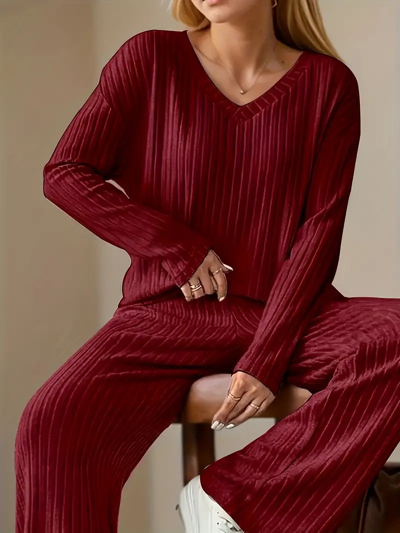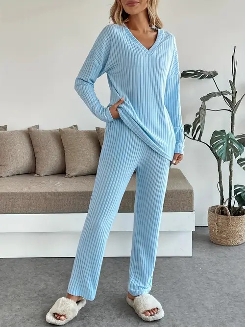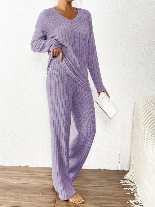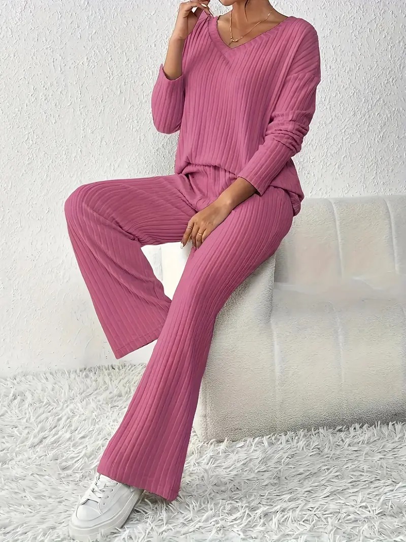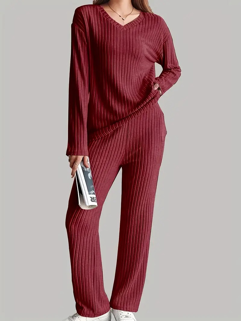 ribbed solid color knitted pantsuits casual drop shoulder long sleeve v neck top straight leg pants outfits womens clothing Product details 1