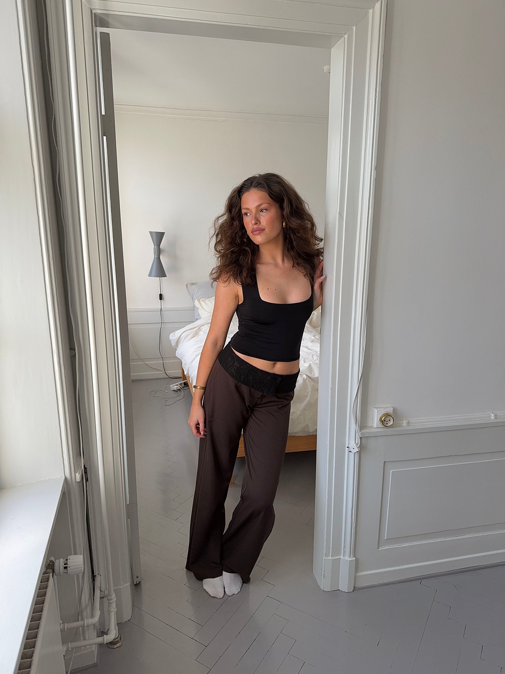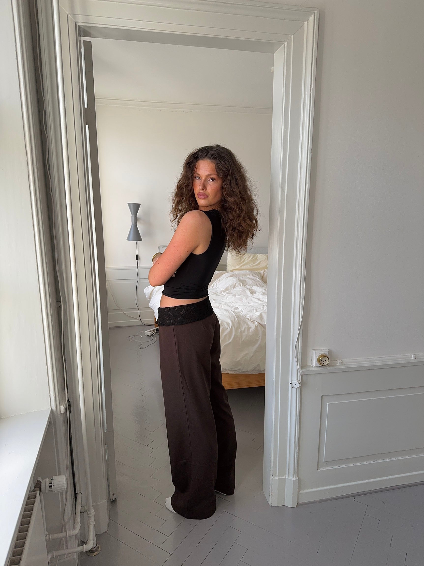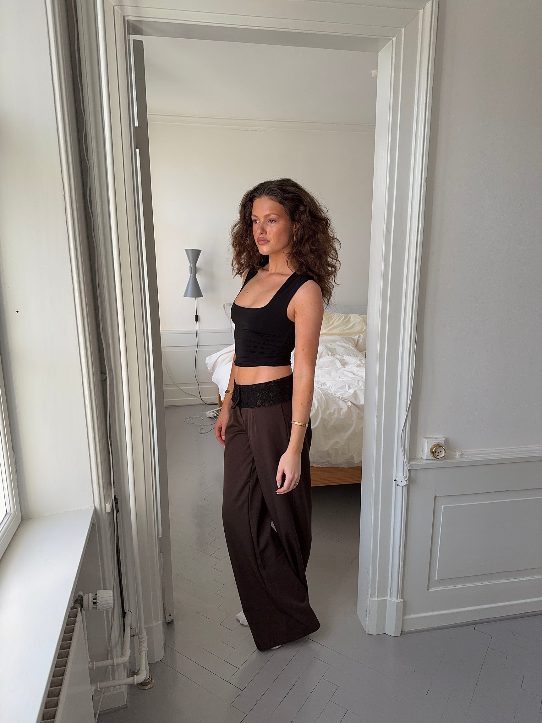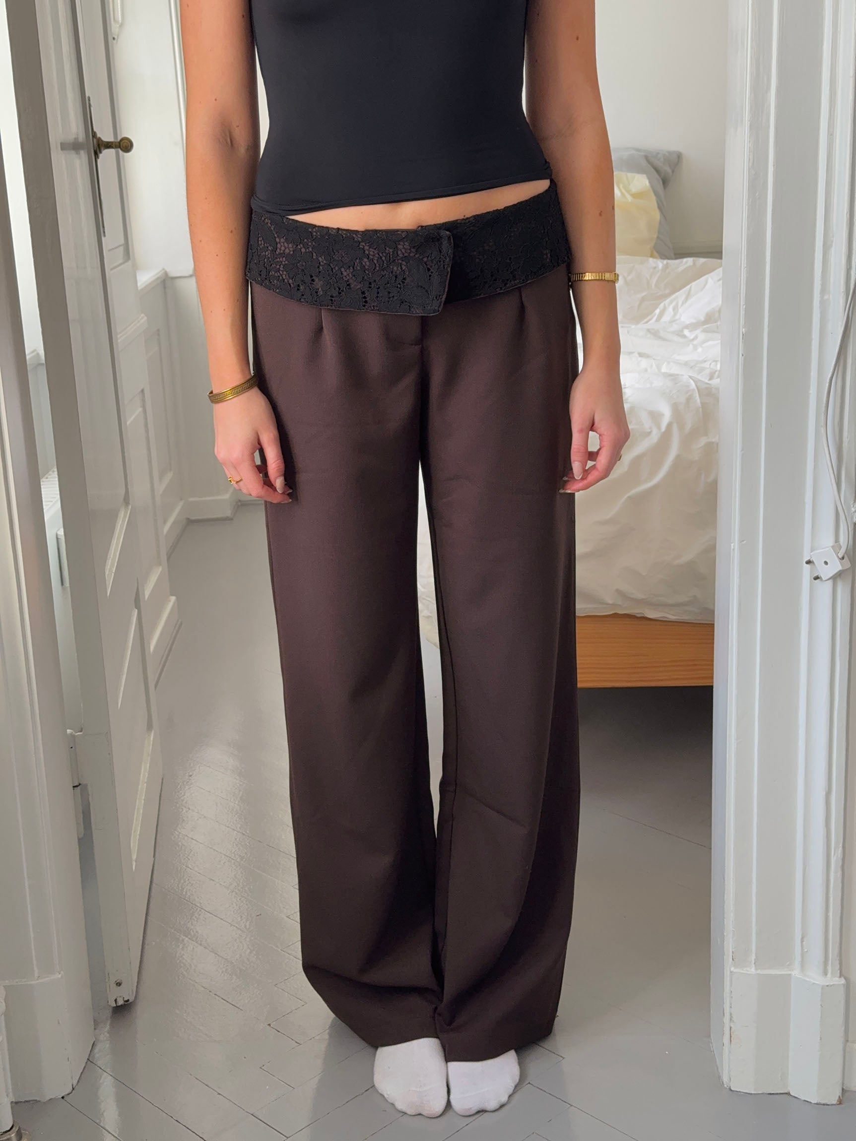 These loose-fit suit trousers in brown offer an elegant alternative to classic trousers, featuring a subtle yet eye-catching detail. The delicate black lace trim along the waistline sets them apart from traditional suit trousers, adding a sophisticated and festive touch. The relaxed fit ensures both comfort and style, while the classic brown color makes them versatile and easy to style. The beautiful lace detail adds a modern twist, making these trousers perfect for both special occasions and formal events where you want to stand out with a discreet yet luxurious design.