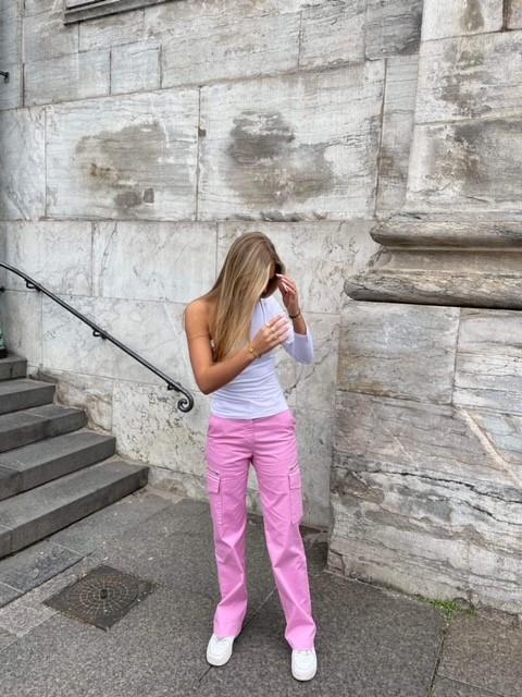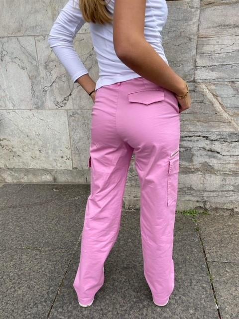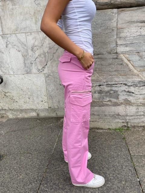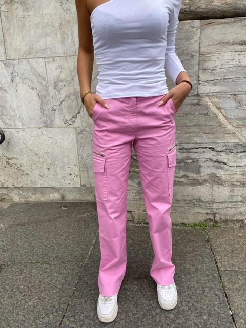Cargo pants with pockets and side zippers. The pants close with a zipper and button.