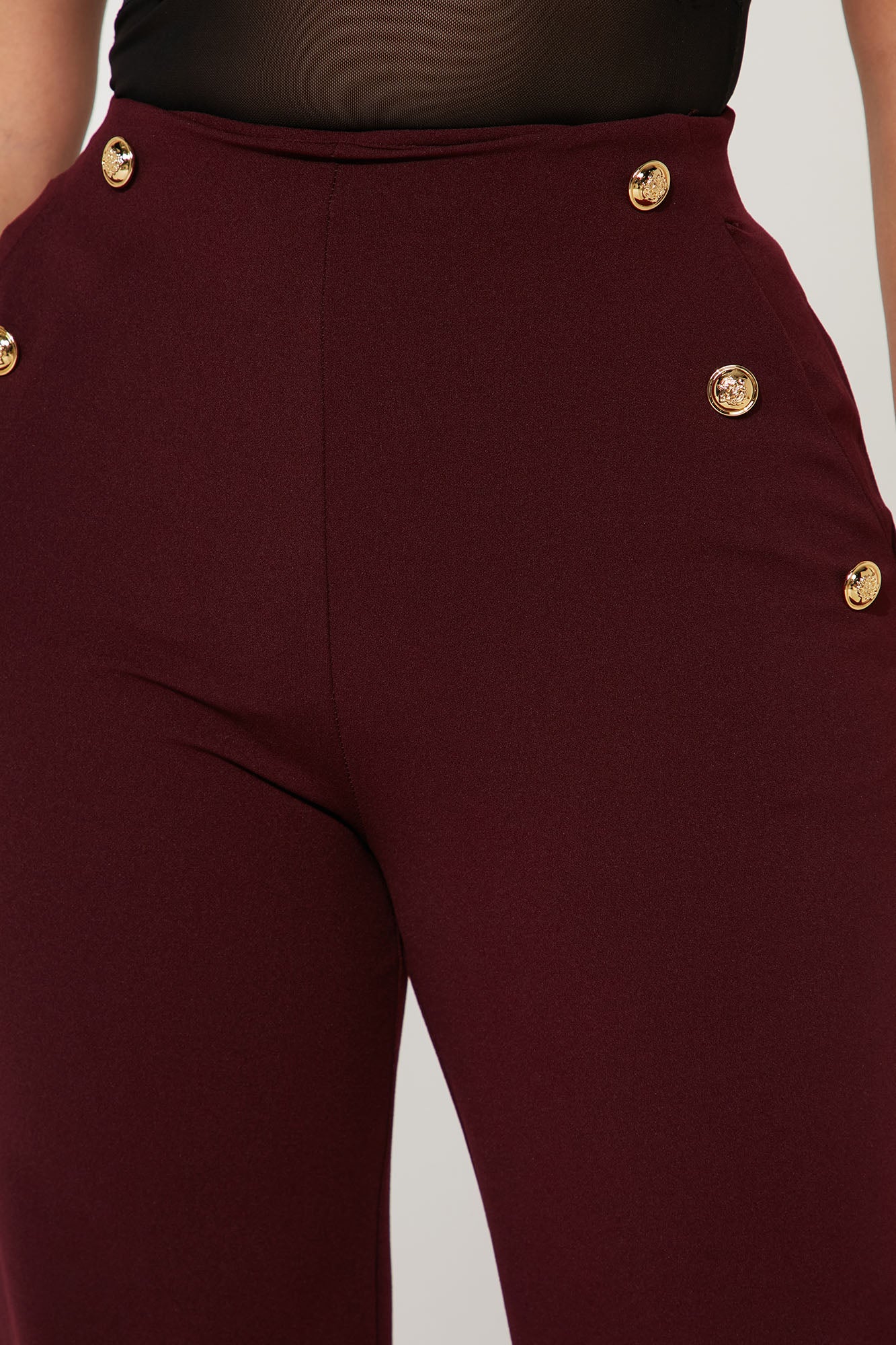 Available In Burgundy.Wide Leg TrouserHigh WaistElastic WaistbandPocketsMulti Button DetailPull OnStretch CrepePair With Celine Blazer95% Polyester 5% SpandexImported