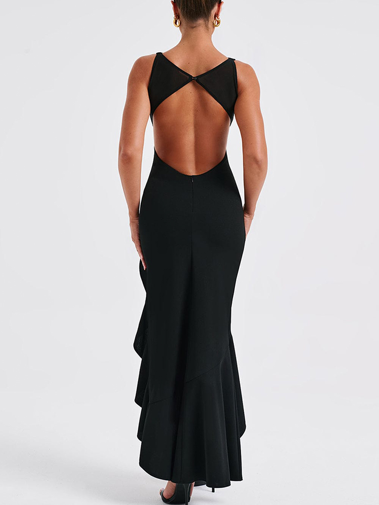 Chiffon Ruffle Detail High Slit Backless Maxi Dress