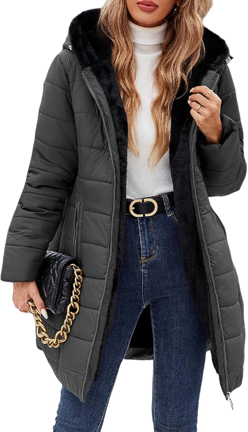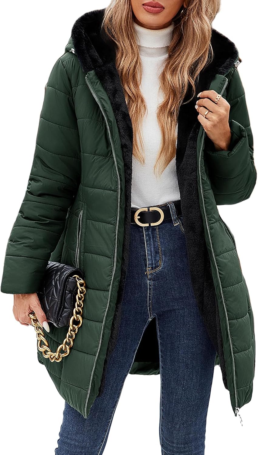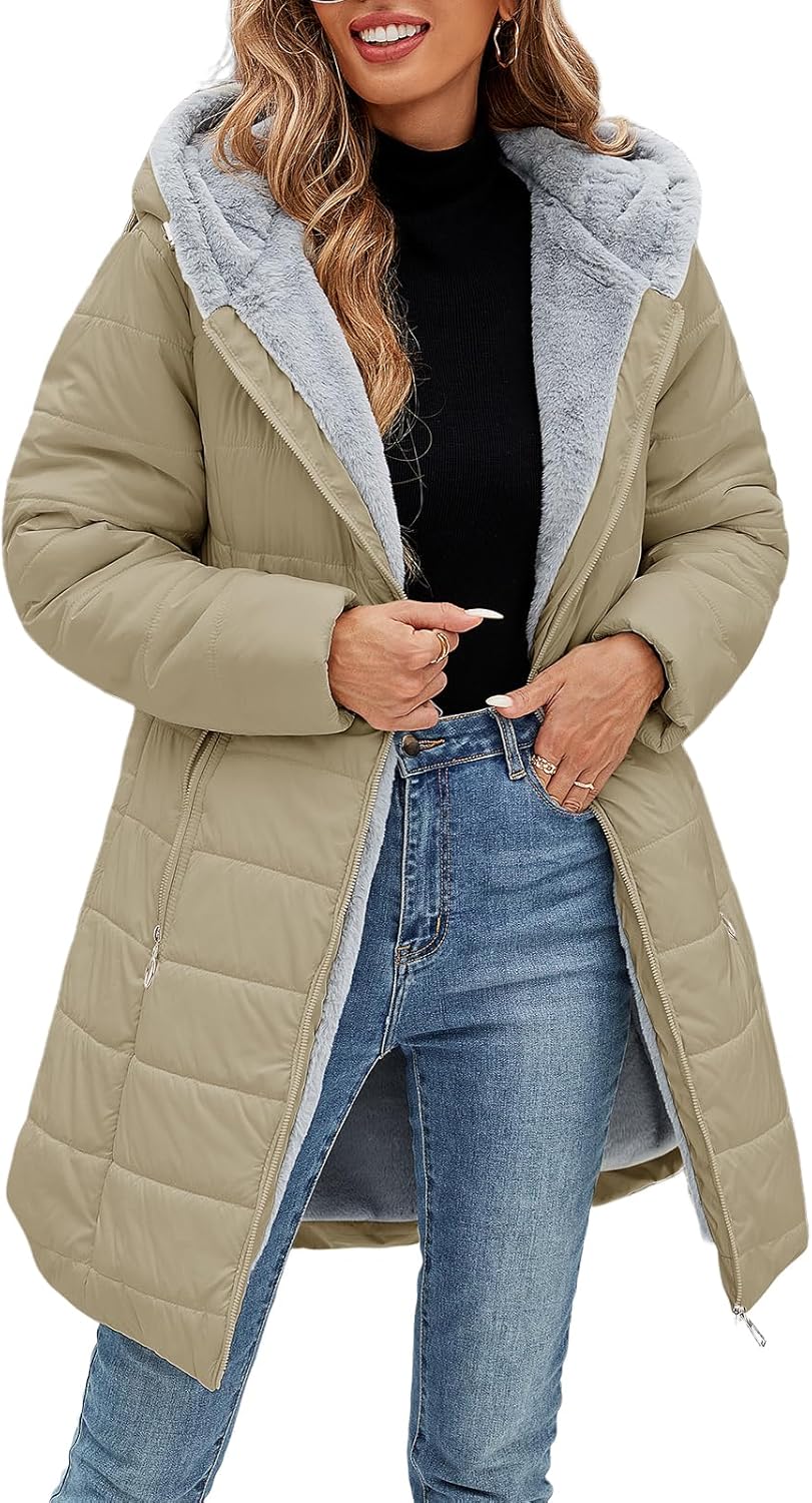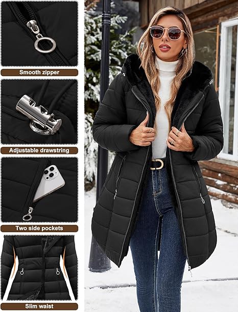 CMTOP Women's Coats Winter Fleece Lined Long Jackets for Women Warm Padded Parka Coat Plush Thermal Water Repellent Elegant Jacket Zipper Hooded Outwear