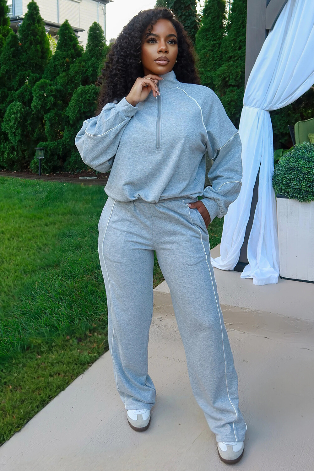 Contrast Line Half-Zip Sweatshirt Wide Leg Pants 2pcs Set-Black