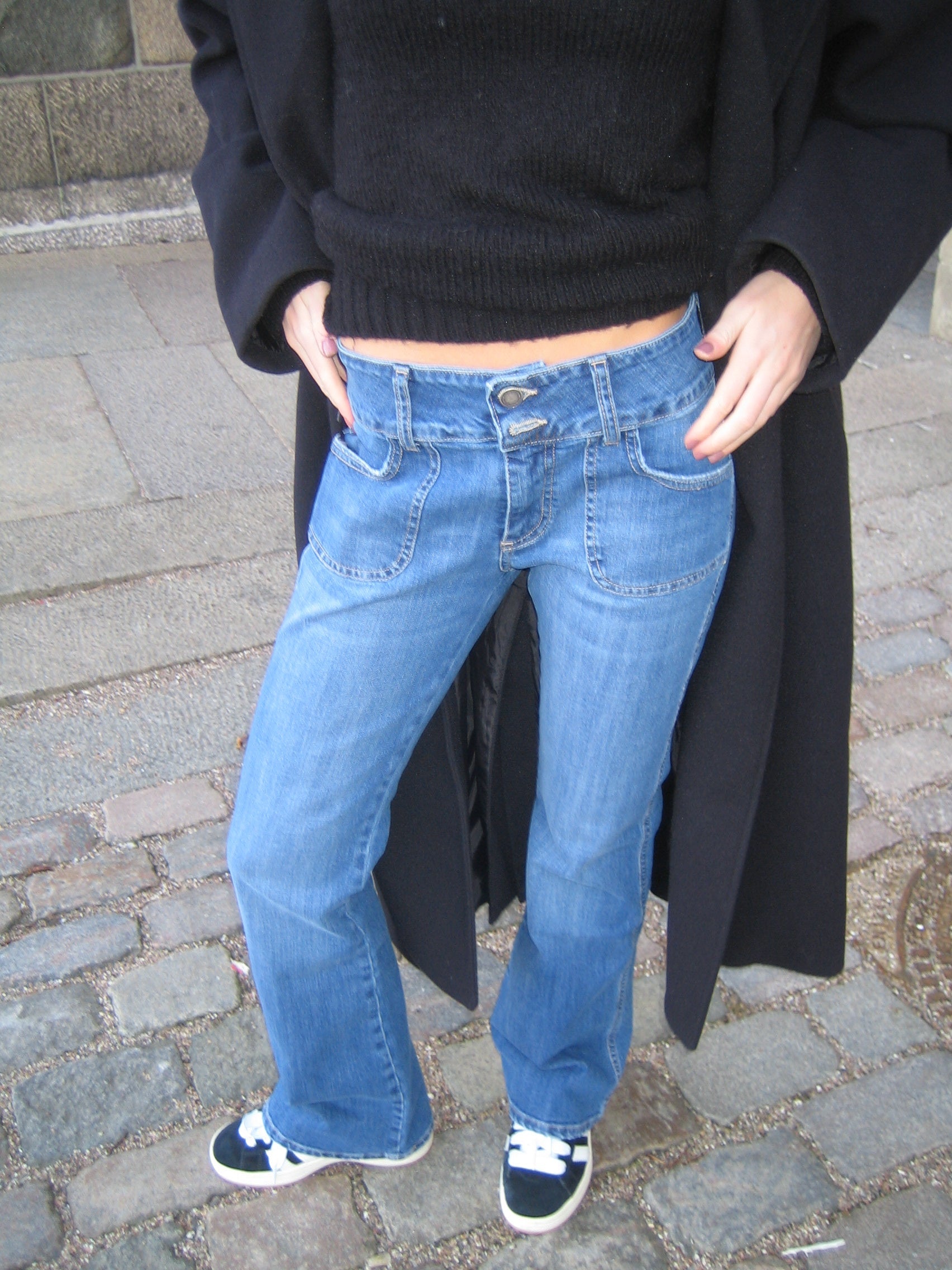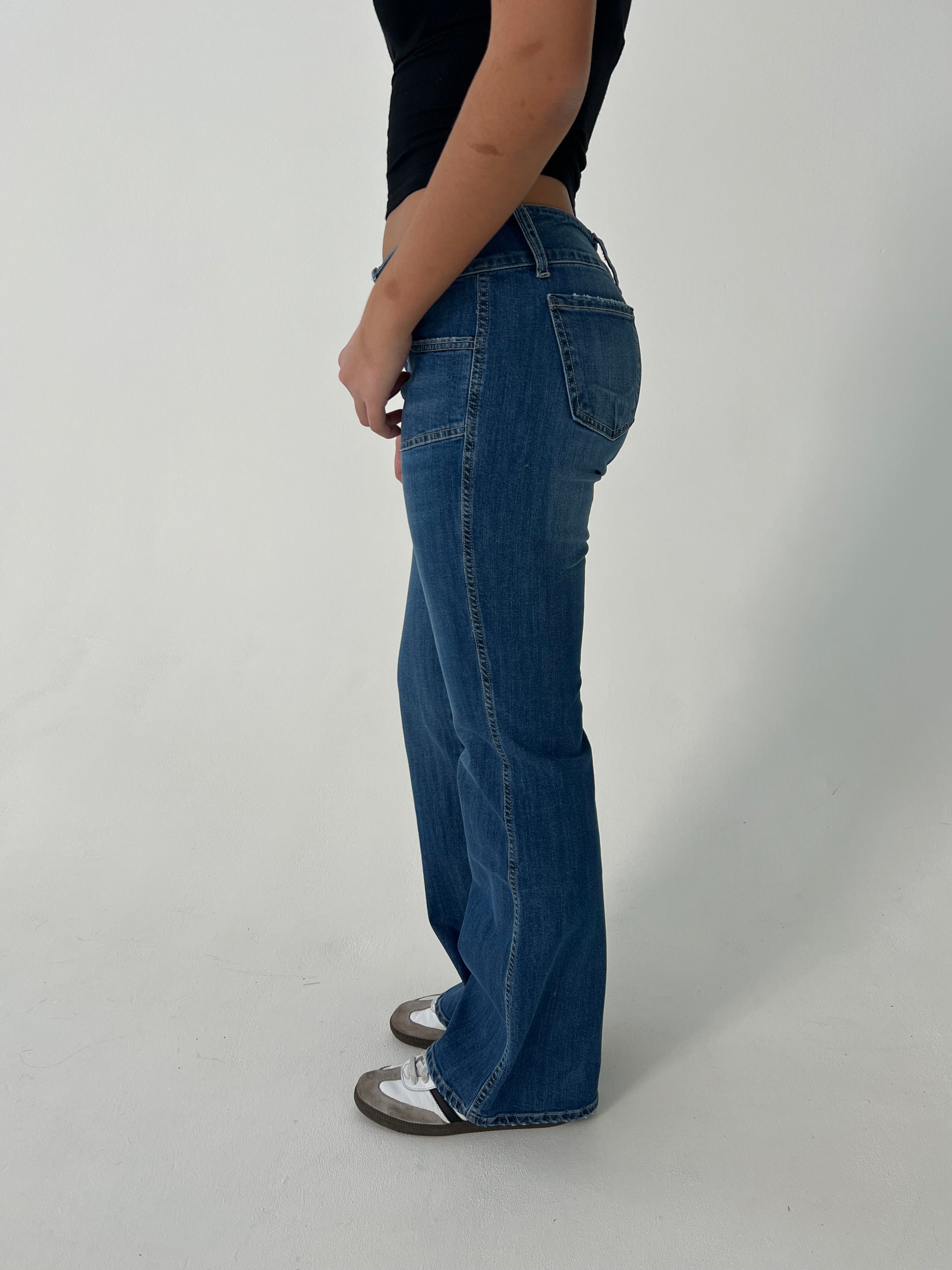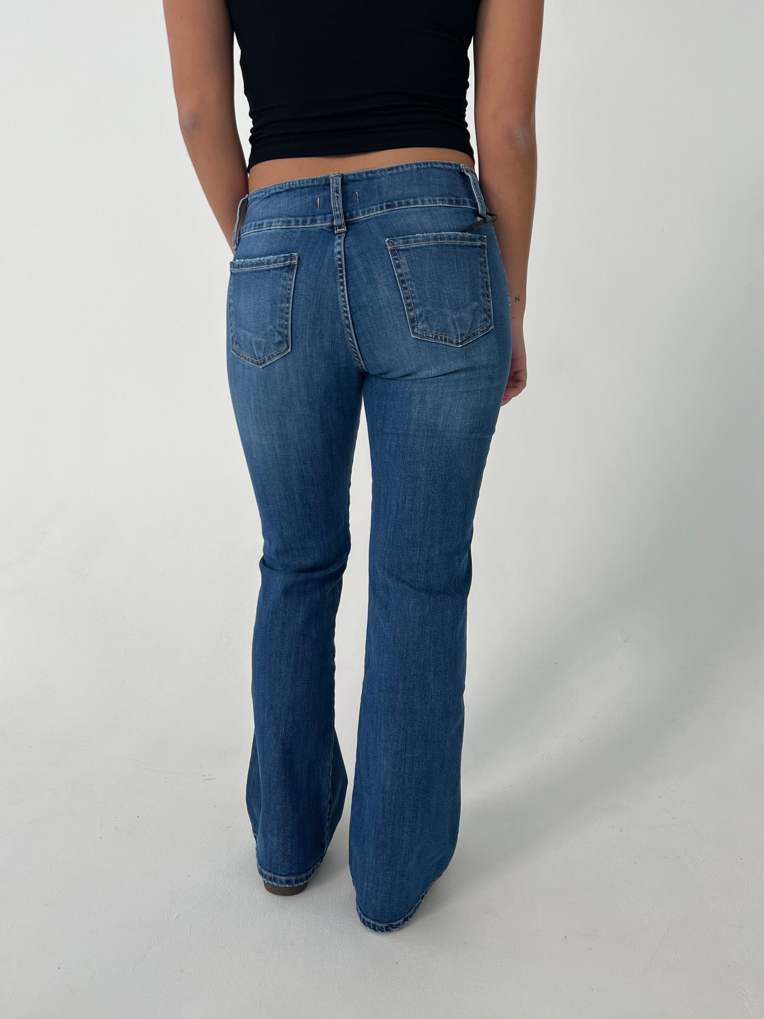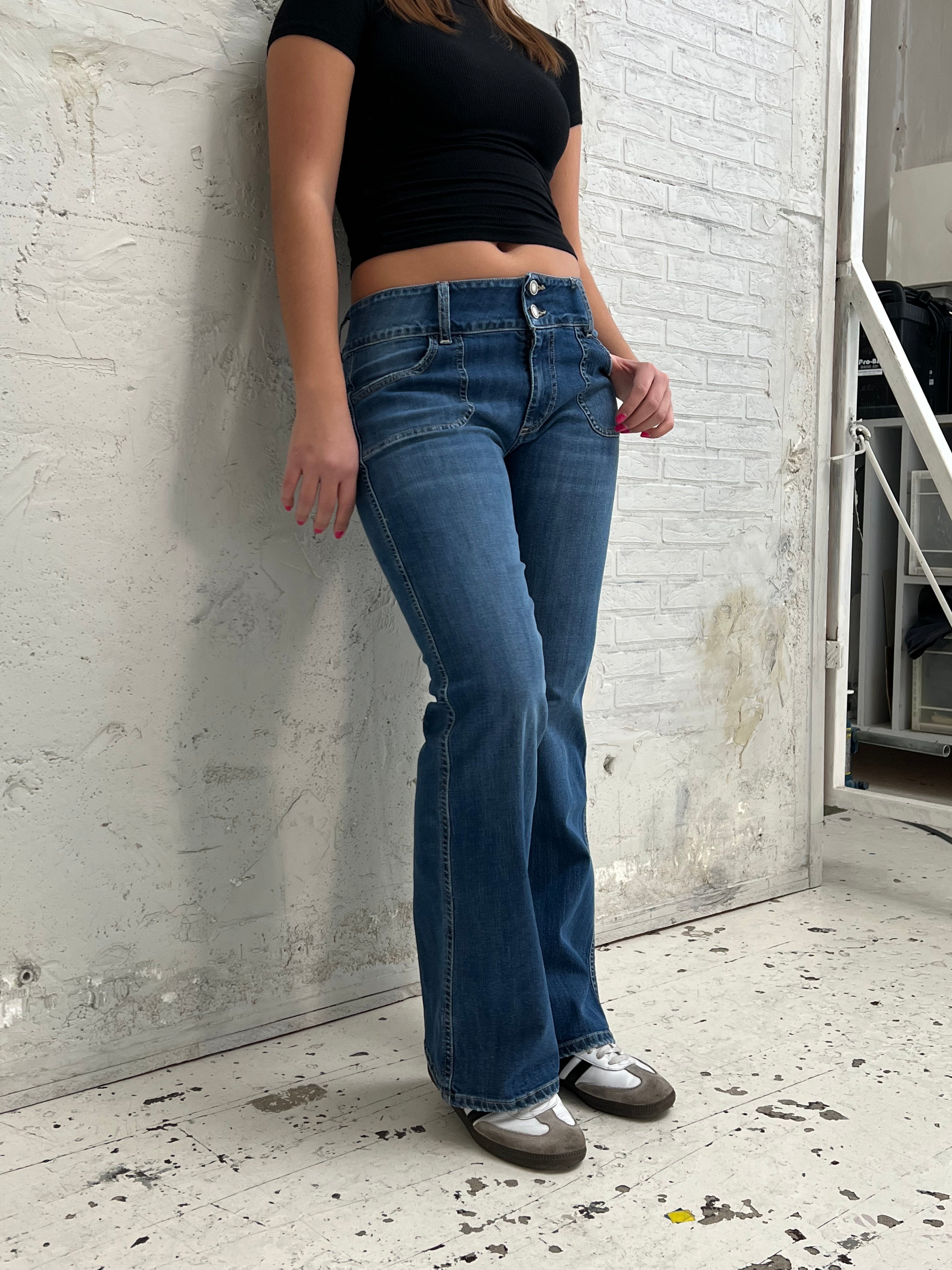 Jeans with a bootcut and low waisted fit. The jeans have a flare look and a long length. They are made of a stretchy material and close with a zip and 2 buttons at the front. They have front and back pockets.