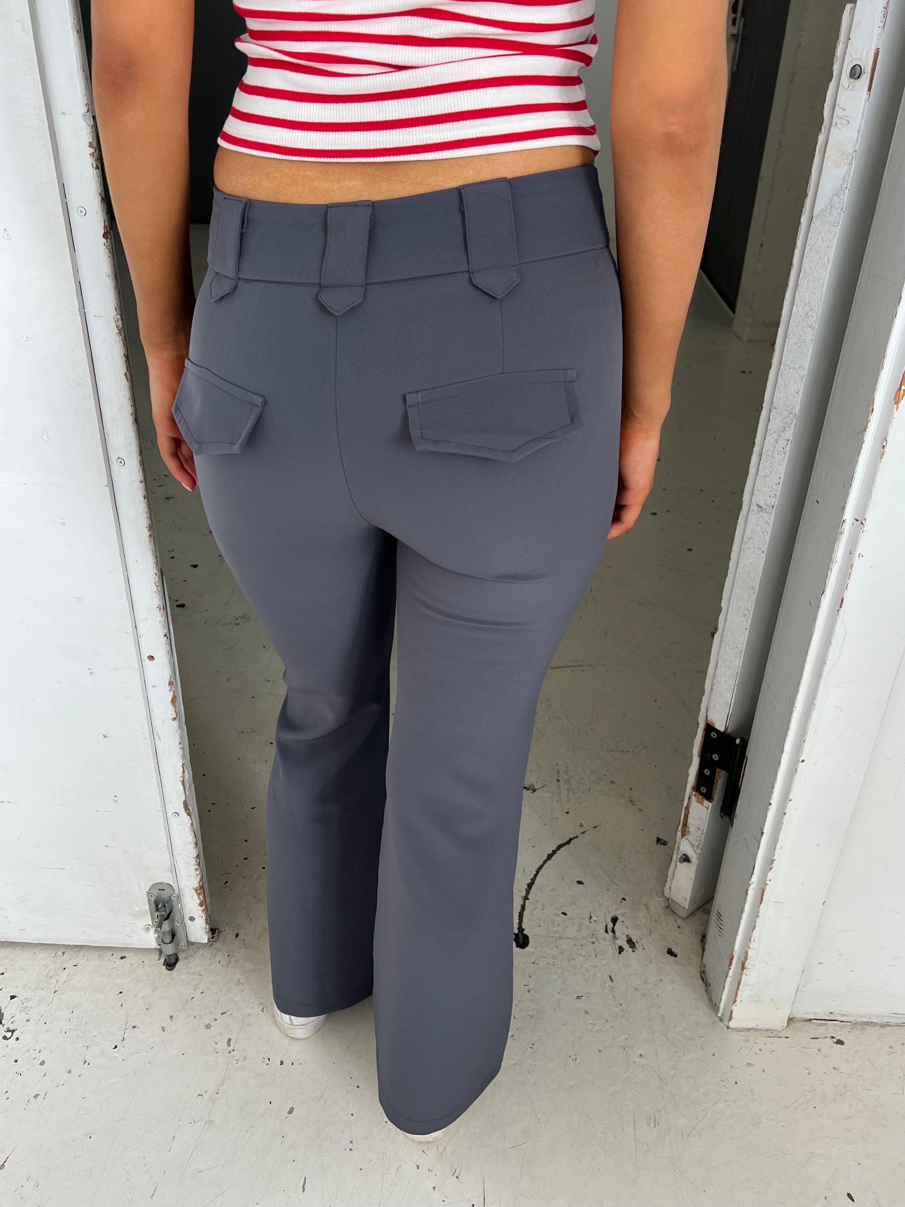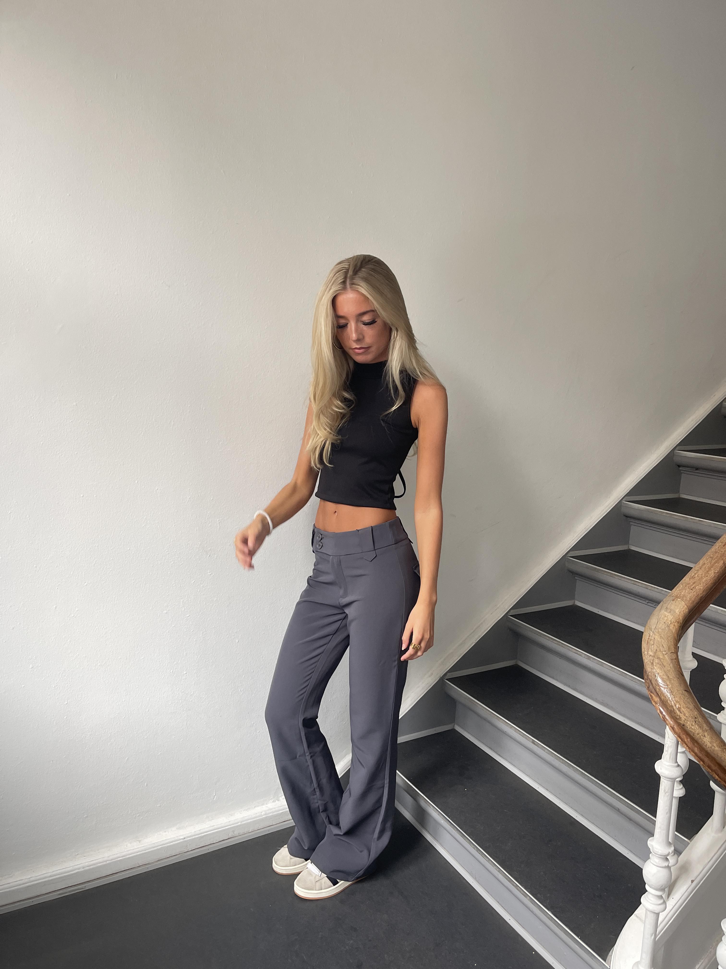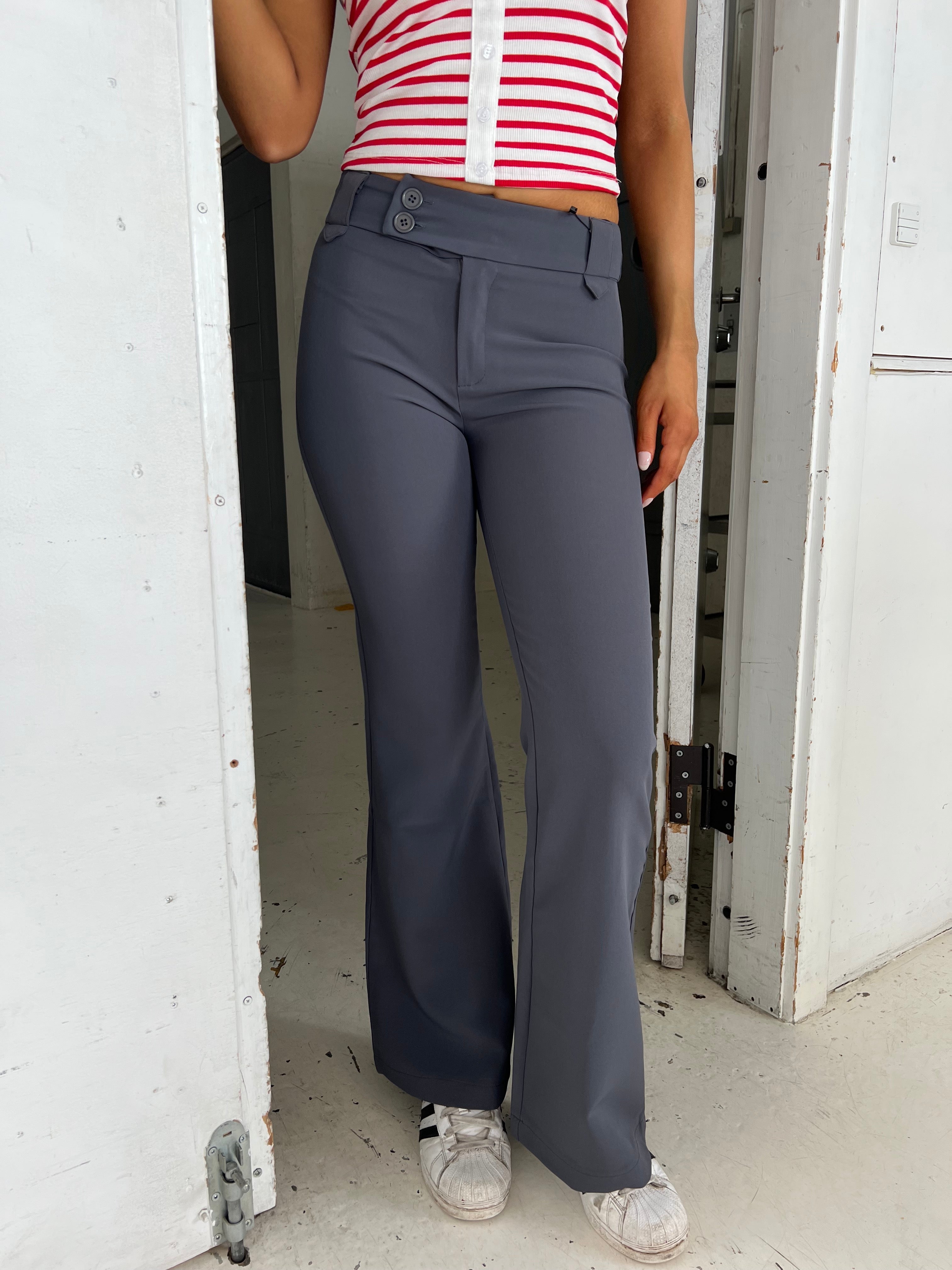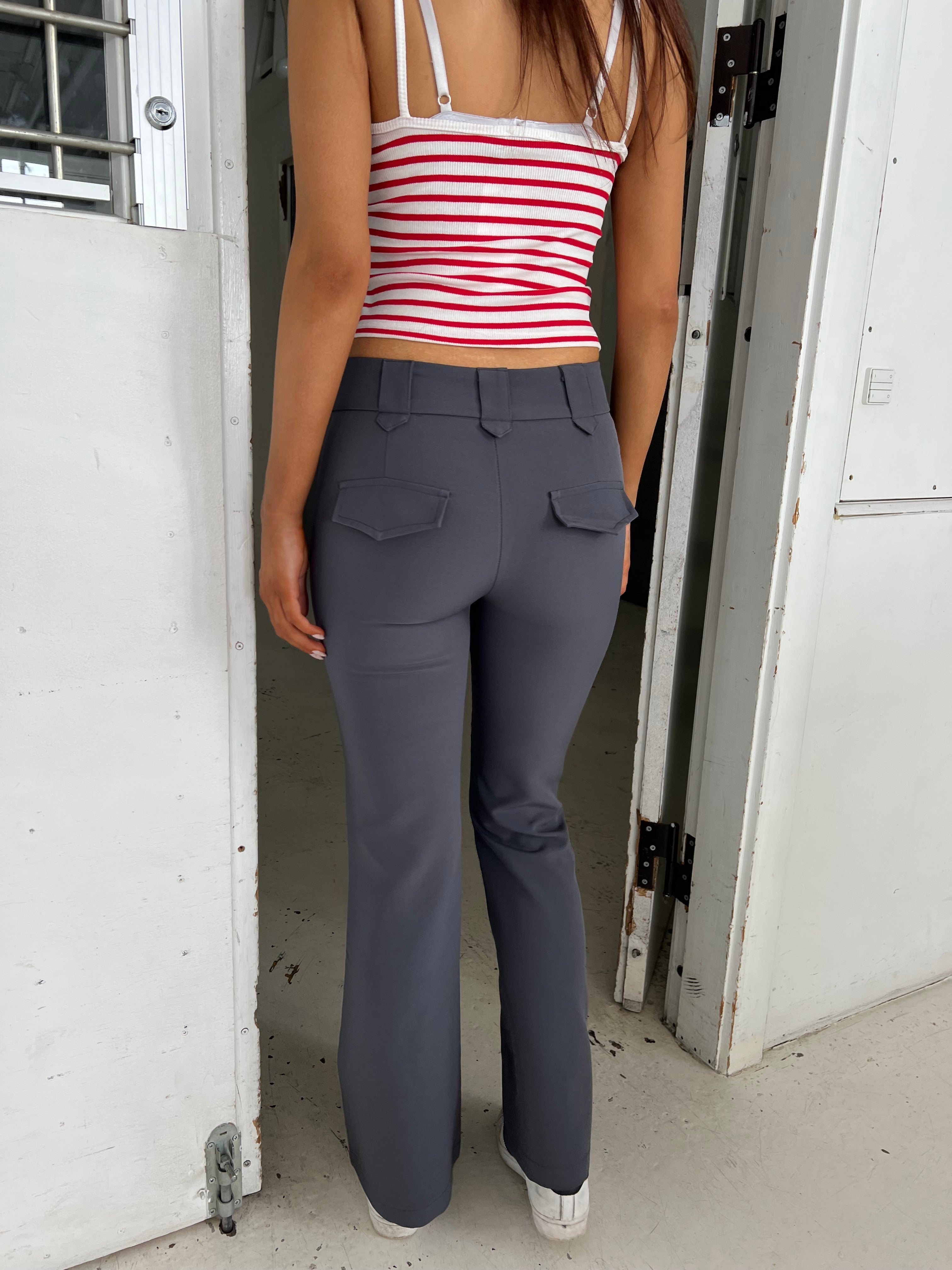 These pants have a fitted fit and a flared look. The pants have a wide waistband that consists of belt loops. They close with a zipper and 2 buttons at the front. They have 2 decorative back pockets.