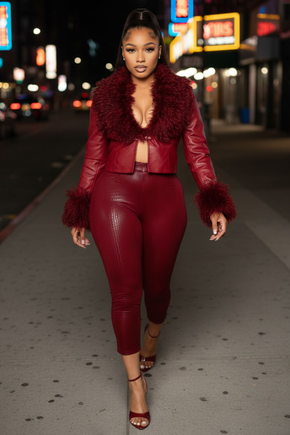 Fleece Collar Cuff Jacket PU Leather Leggings Pants 2pcs Set-Red