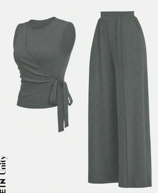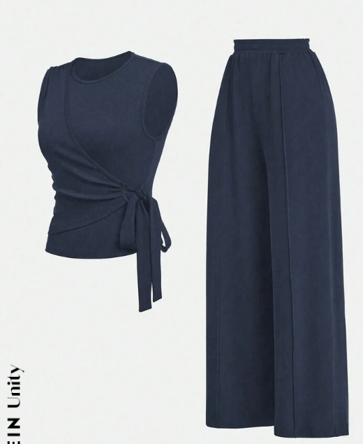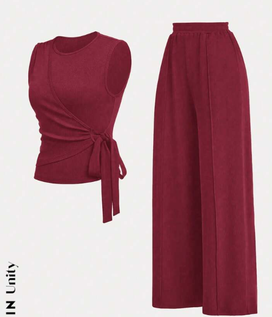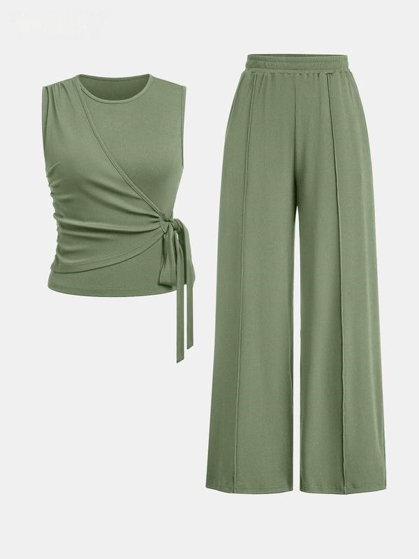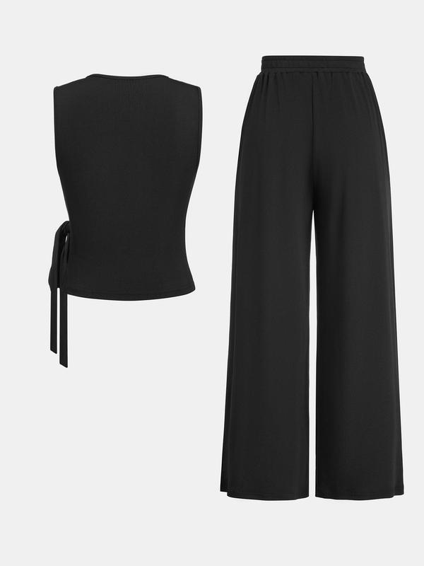 Women's Solid Knot Front Tank Top & Wide Leg Pants Set