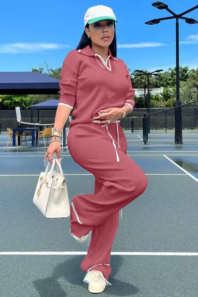 Knit Turndown Collar Long Sleeve Top Straight Leg Casual Pants Matching Set