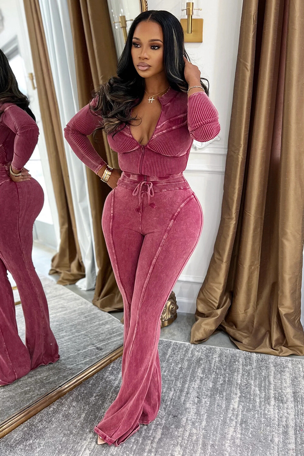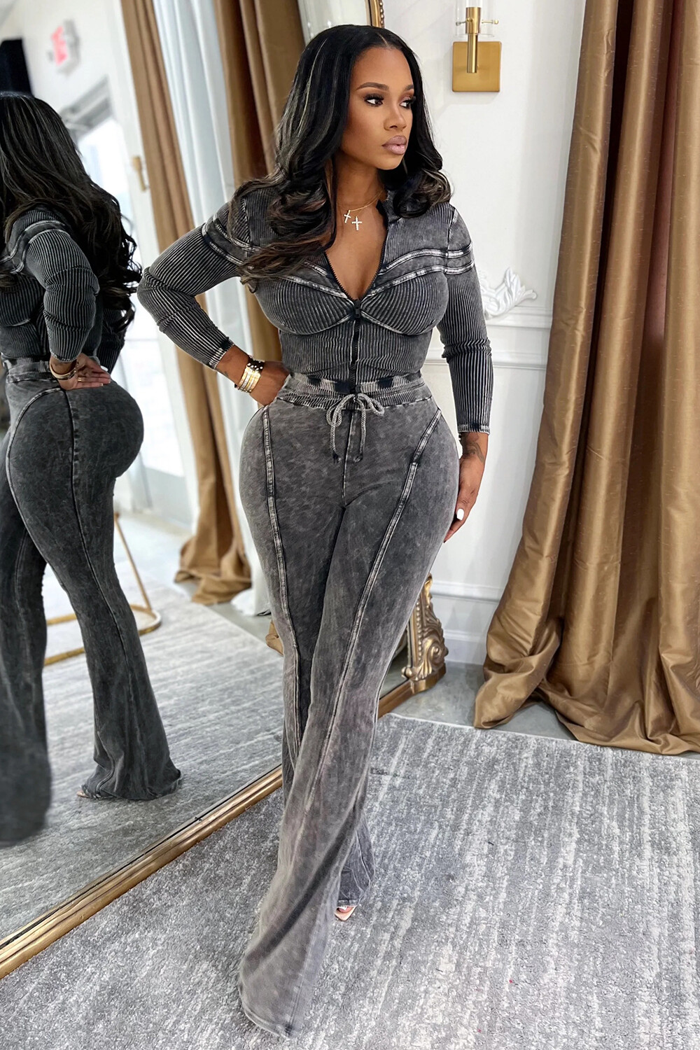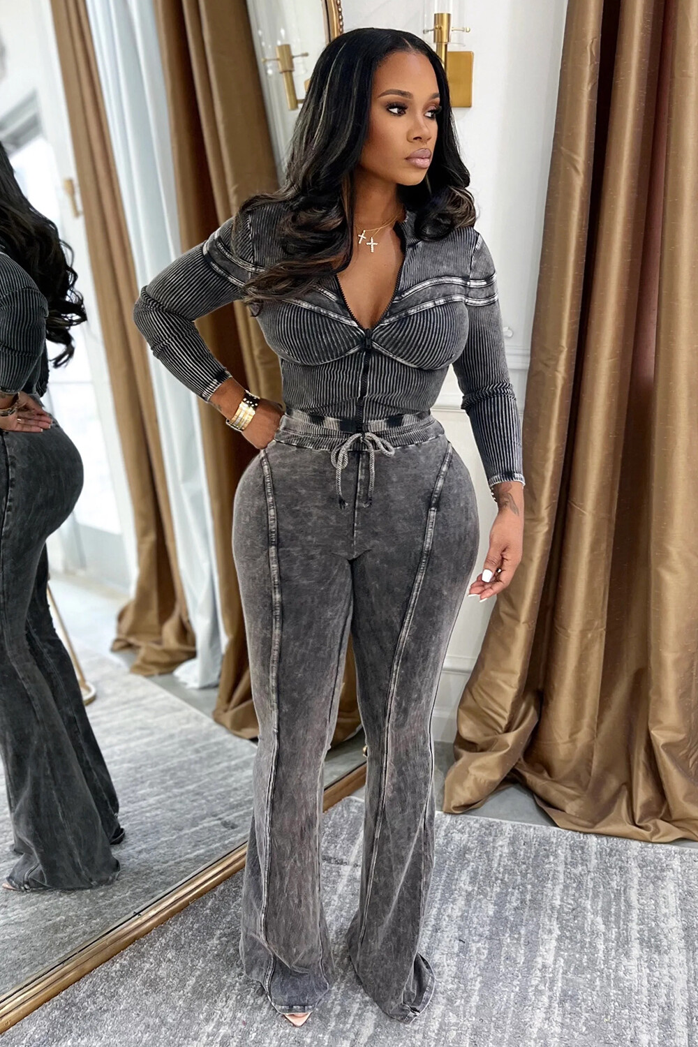 Long Sleeve Zipper Top Tie Up Bootcut Pants 2pcs Set-Coffee