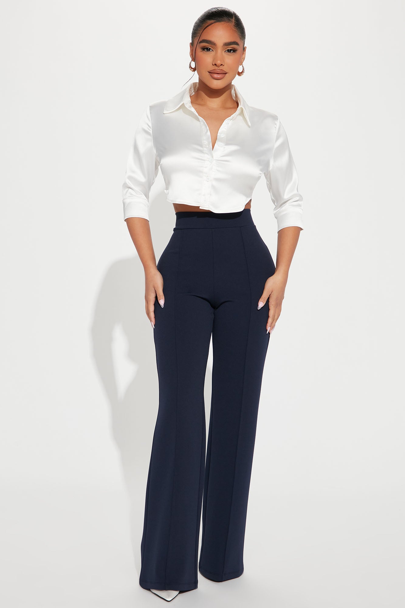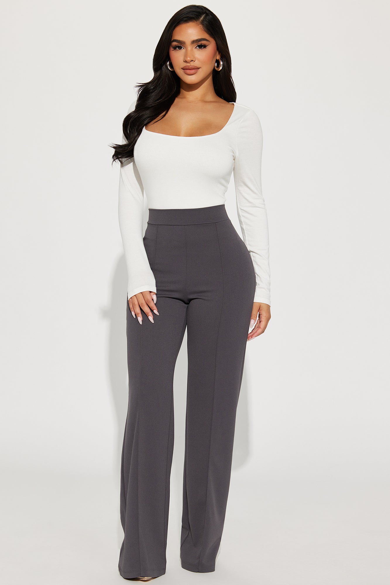 Available In Black, Charcoal, Chocolate, Navy, Red, Royal, Taupe And White.Available in Regular, Tall, and Petite InseamsPetite: 32" InseamHigh RisePintuck FrontHidden Back ZipperStretch95% Polyester 5% SpandexImported