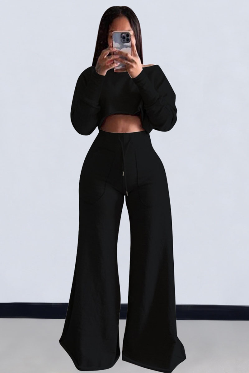 Plain Long Sleeve Crop Sweatshirt Pocket Wide Leg Pants Matching Set-Grey