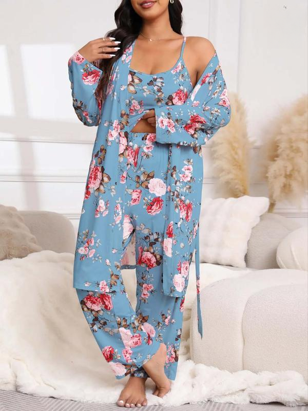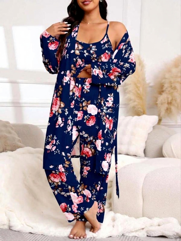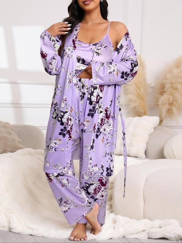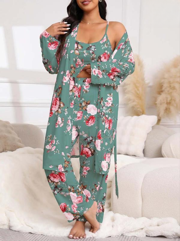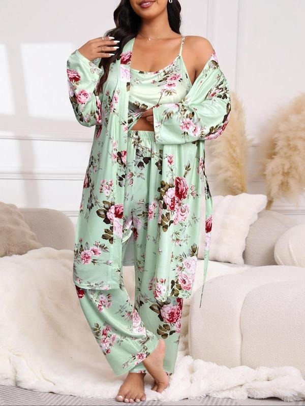 • [Plus Size] Three-Piece Set Floral Print Belted Lounge Robe & Cami Top & Elastic Waist Pants Pyjama Set