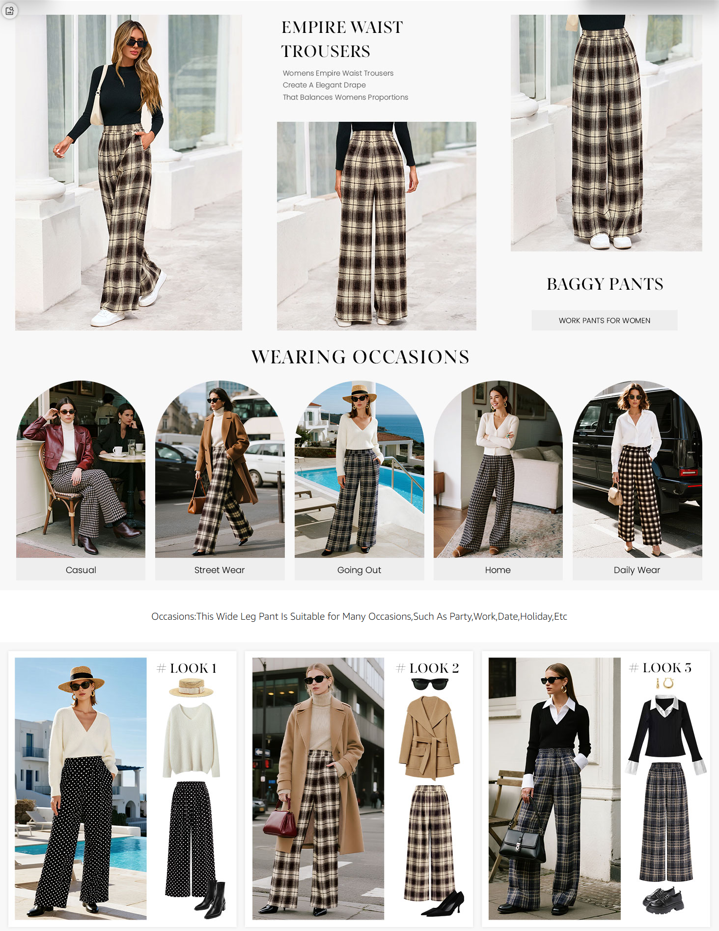 - FEATURES:The Wide Leg Pants Woman Offer A Chic,Relaxed Fit That Adapts To Womens Lifestyle,Providing Ample Room for Movement.Loose Women's Pants Collection Offers A Diverse Range of Designs from Classic Plaid and Striped To Chic Dot Patterns