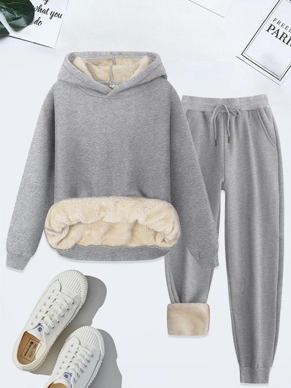 Women's Thermal Lined Solid Color Hoodie & Drawstring Waist Pants Two-piece Set, Casual Long Sleeve Hooded Sweatshirt & Pocket Trousers for Fall & Winter, Women's Clothes for Daily Wear