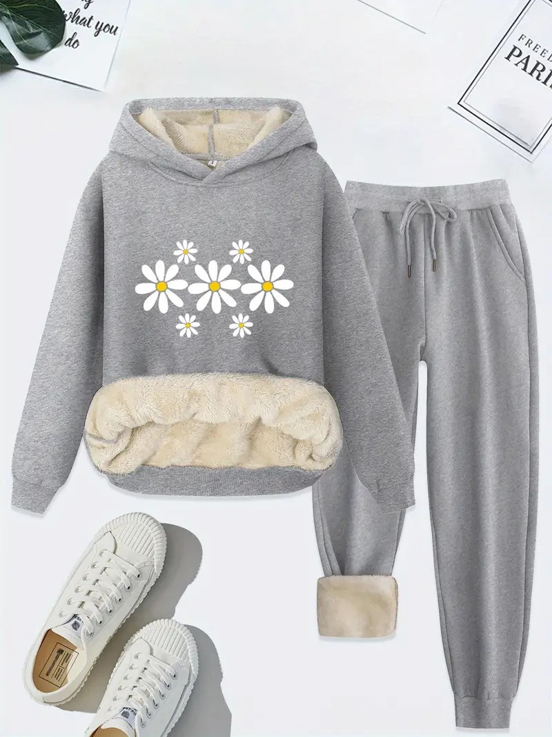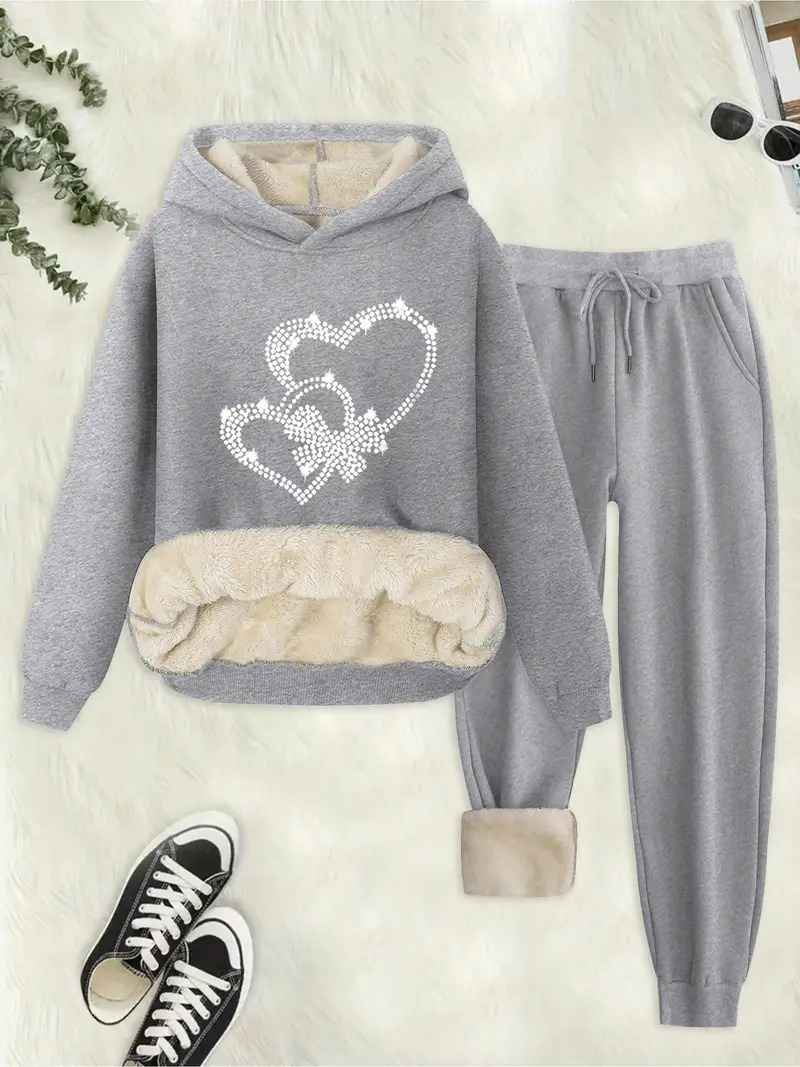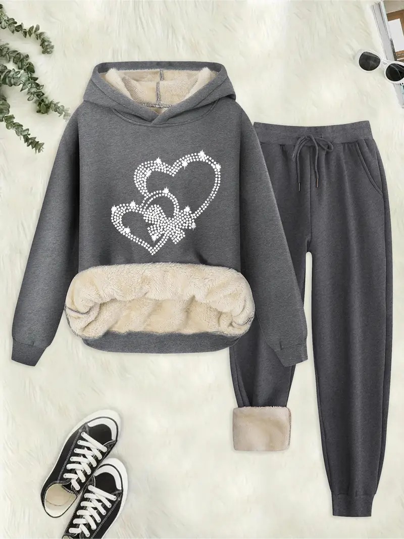 • Women's Thermal Lined Solid Color Hoodie & Drawstring Waist Pants Two-piece Set, Casual Long Sleeve Hooded Sweatshirt & Pocket Trousers for Fall & Winter, Women's Clothes for Daily Wear