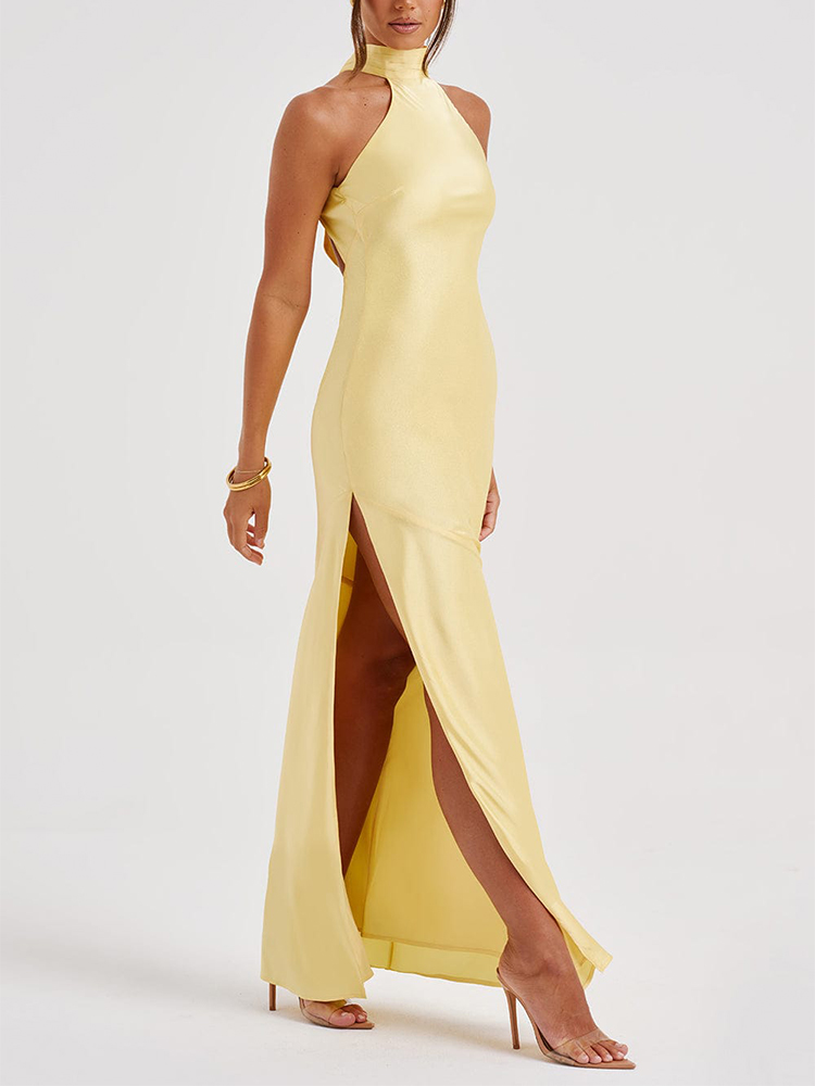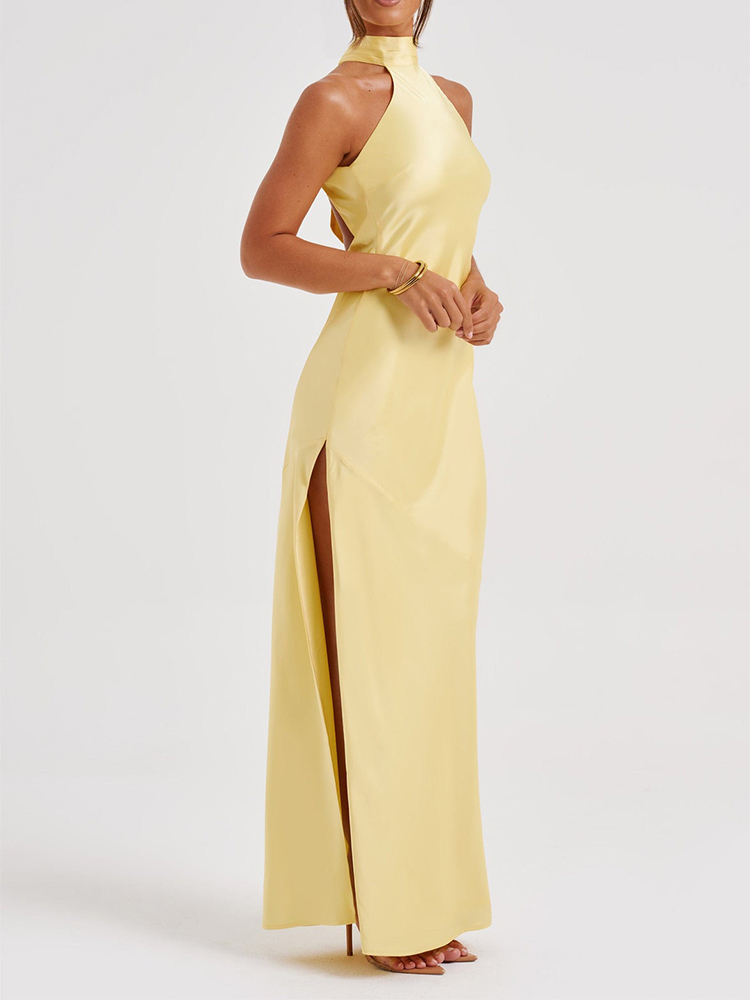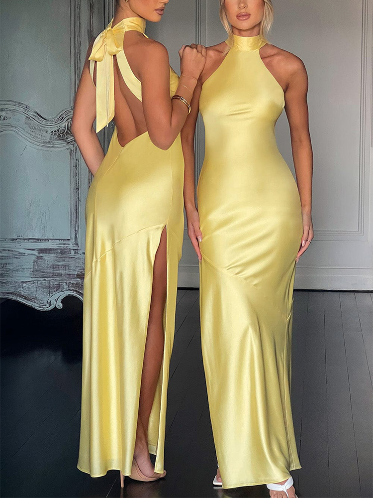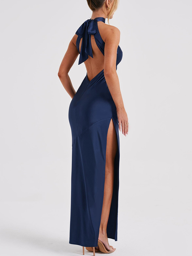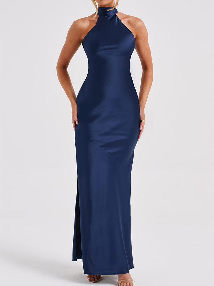 This elegant satin maxi dress is perfect for parties and proms. The halter neckline and backless design add a touch of sophistication, while the side slit adds a touch of allure. Made from high-quality satin fabric, this dress is sure to make you stand out at any special occasion.