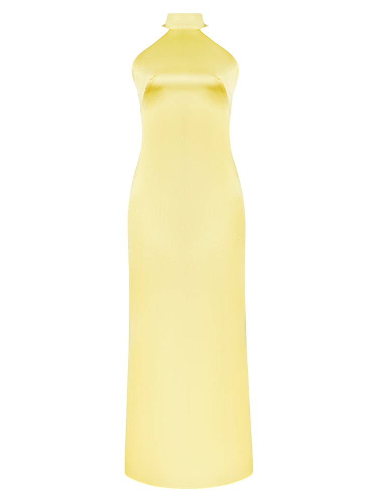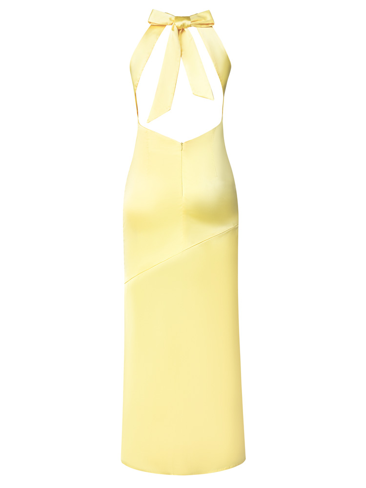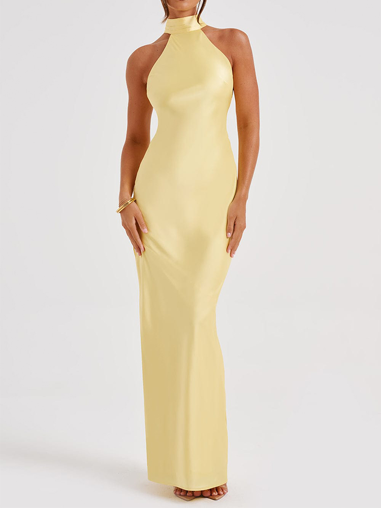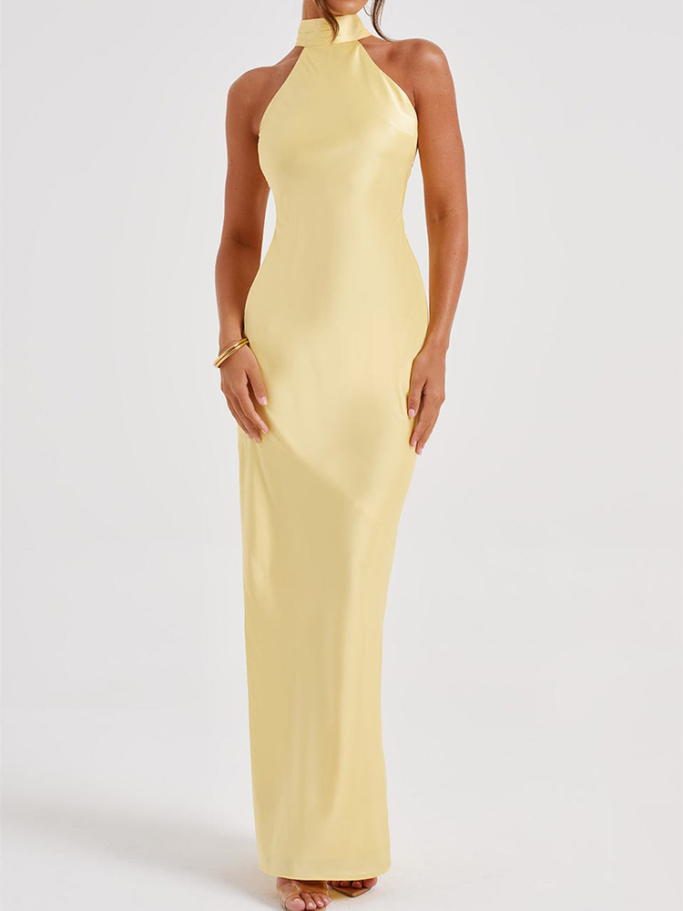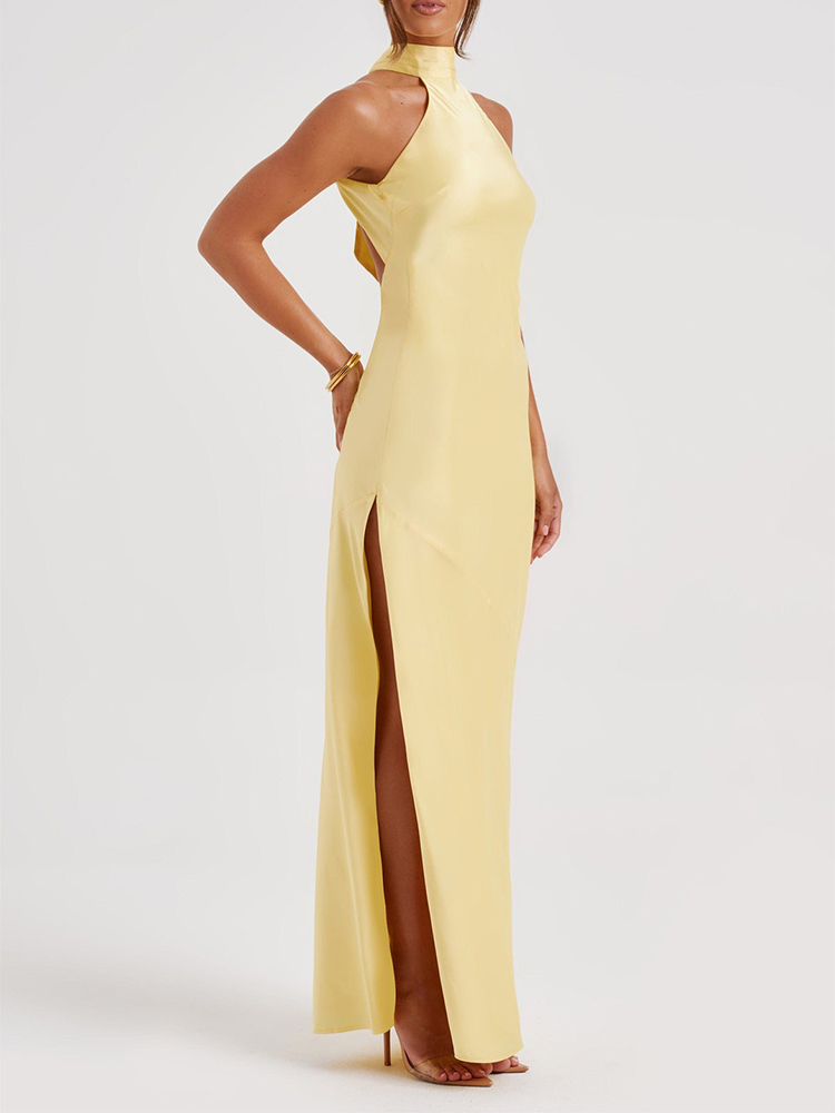 This elegant satin maxi dress is perfect for parties and proms. The halter neckline and backless design add a touch of sophistication, while the side slit adds a touch of allure. Made from high-quality satin fabric, this dress is sure to make you stand out at any special occasion.