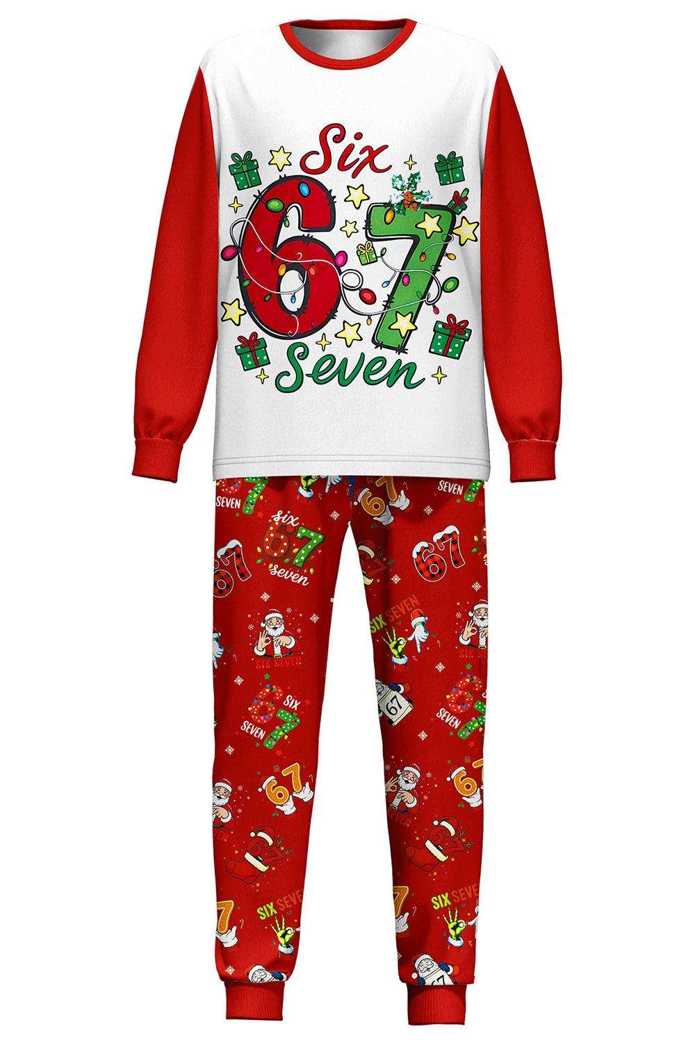 Featuring a playful mix of Santa, candy canes, and colorful lights, these cozy PJs will have your little one feeling the holiday magic. Perfect for Christmas morning photos and cozy family moments! These unique SIX SEVEN pajamas make the ultimate holiday gift.