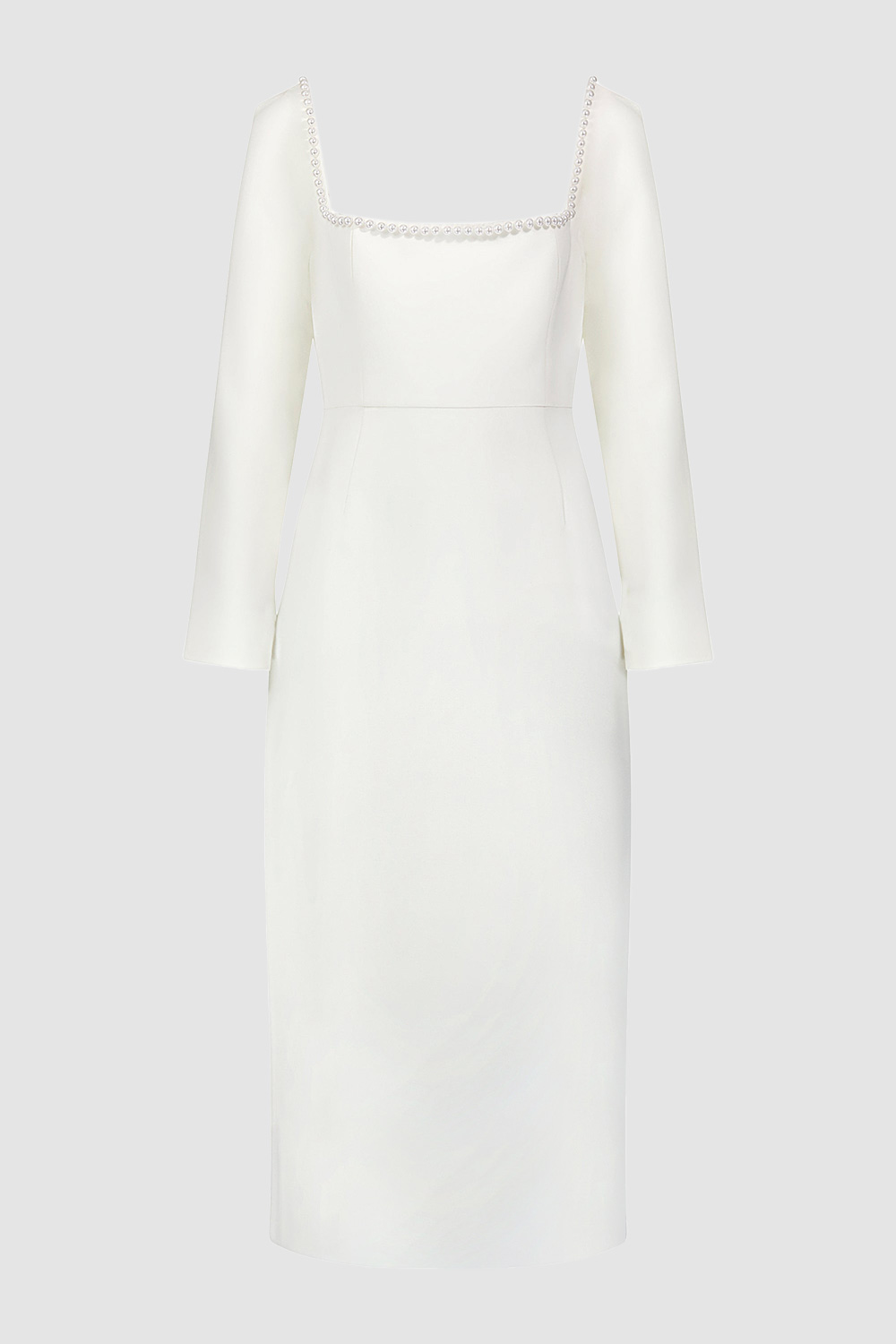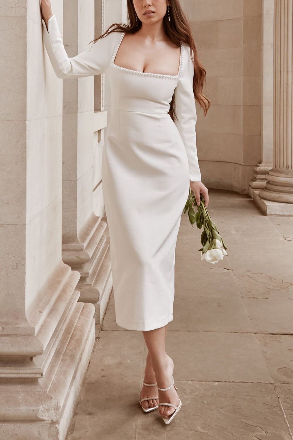 Shine as a wedding guest in this white square-neck mini dress adorned with pearl embellishments. Its elegant design and intricate detailing exude sophistication. The mini length adds a modern flair while the pearl embellishments elevate the look. Feel radiant and refined, captivating attention at any wedding celebration.