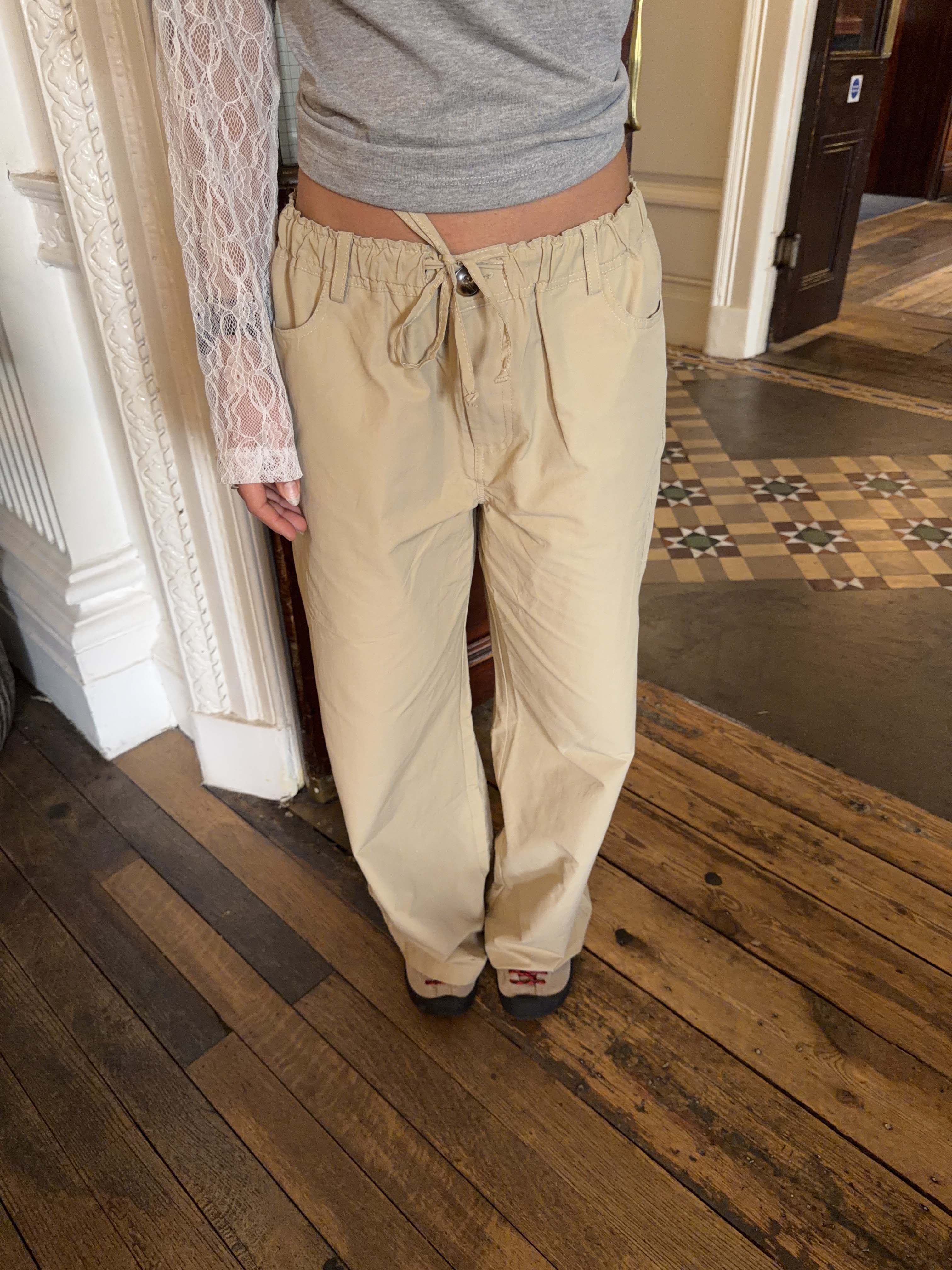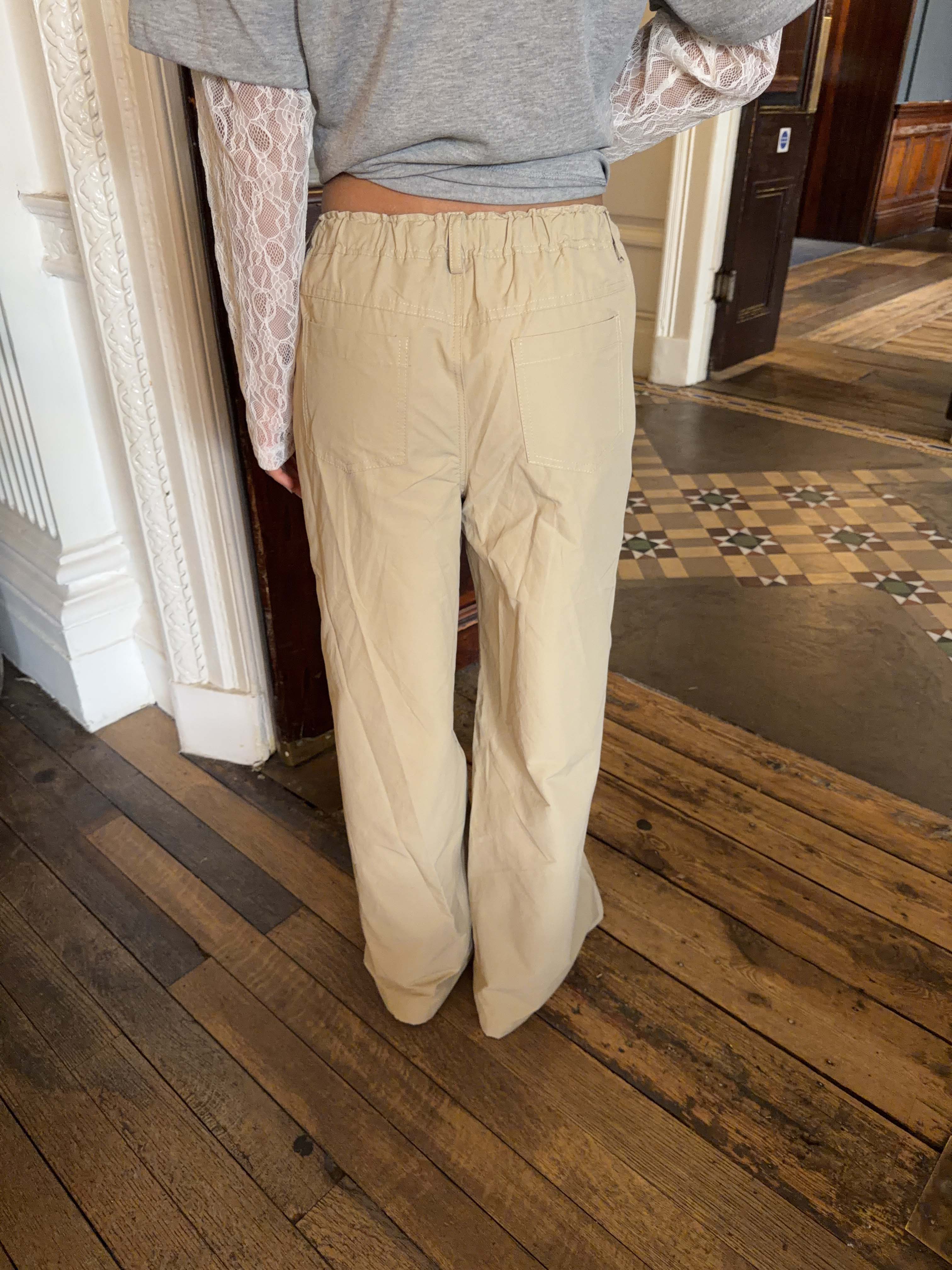 These light cream-beige trousers are designed with comfort and ease in mind. The smooth, breathable fabric feels soft against the skin and drapes gently around the body. The elastic waistband with an adjustable drawstring provides a flexible fit and a relaxed, effortless look. A single button and discreet fly add a classic touch to the otherwise simple design.