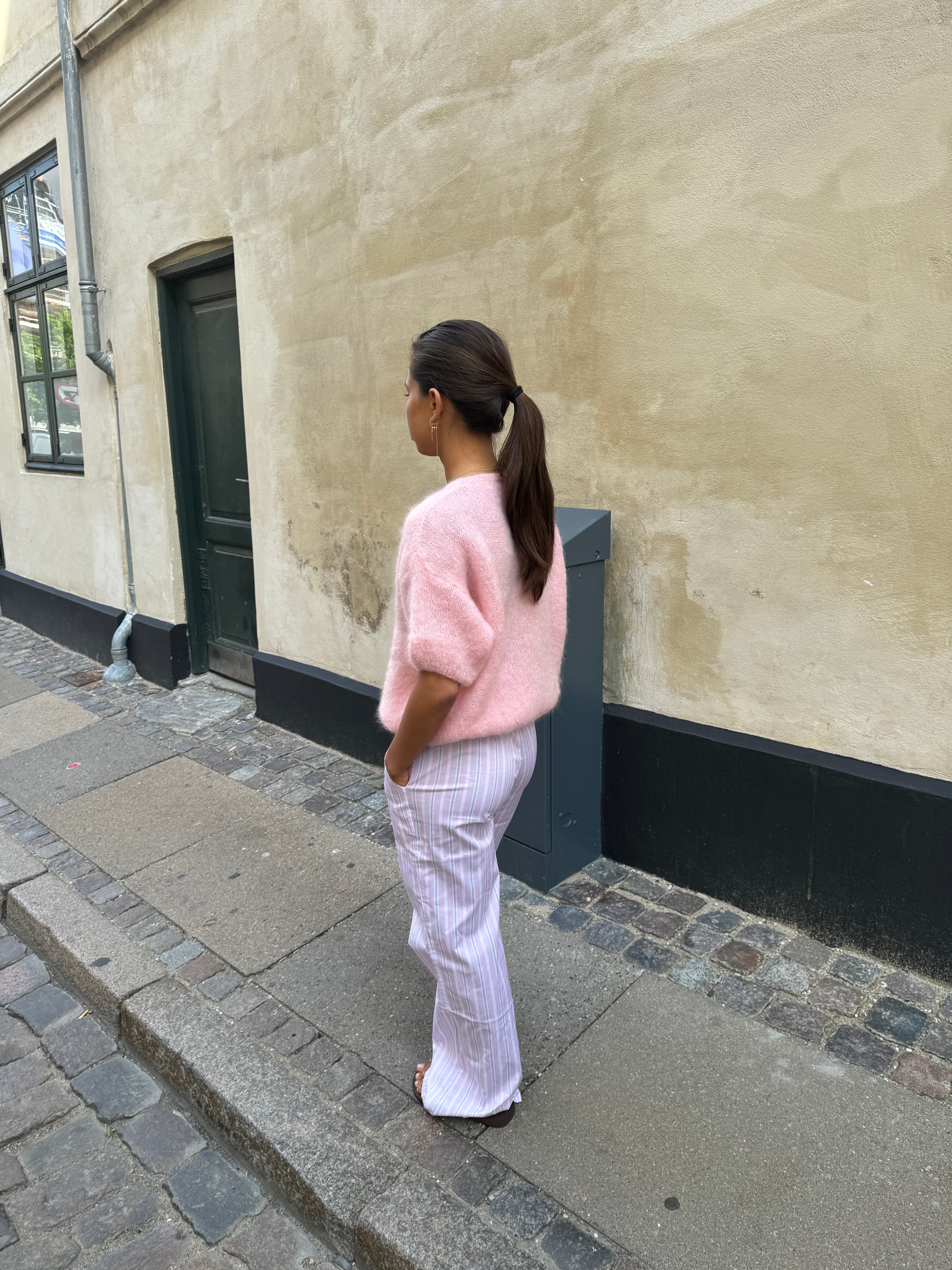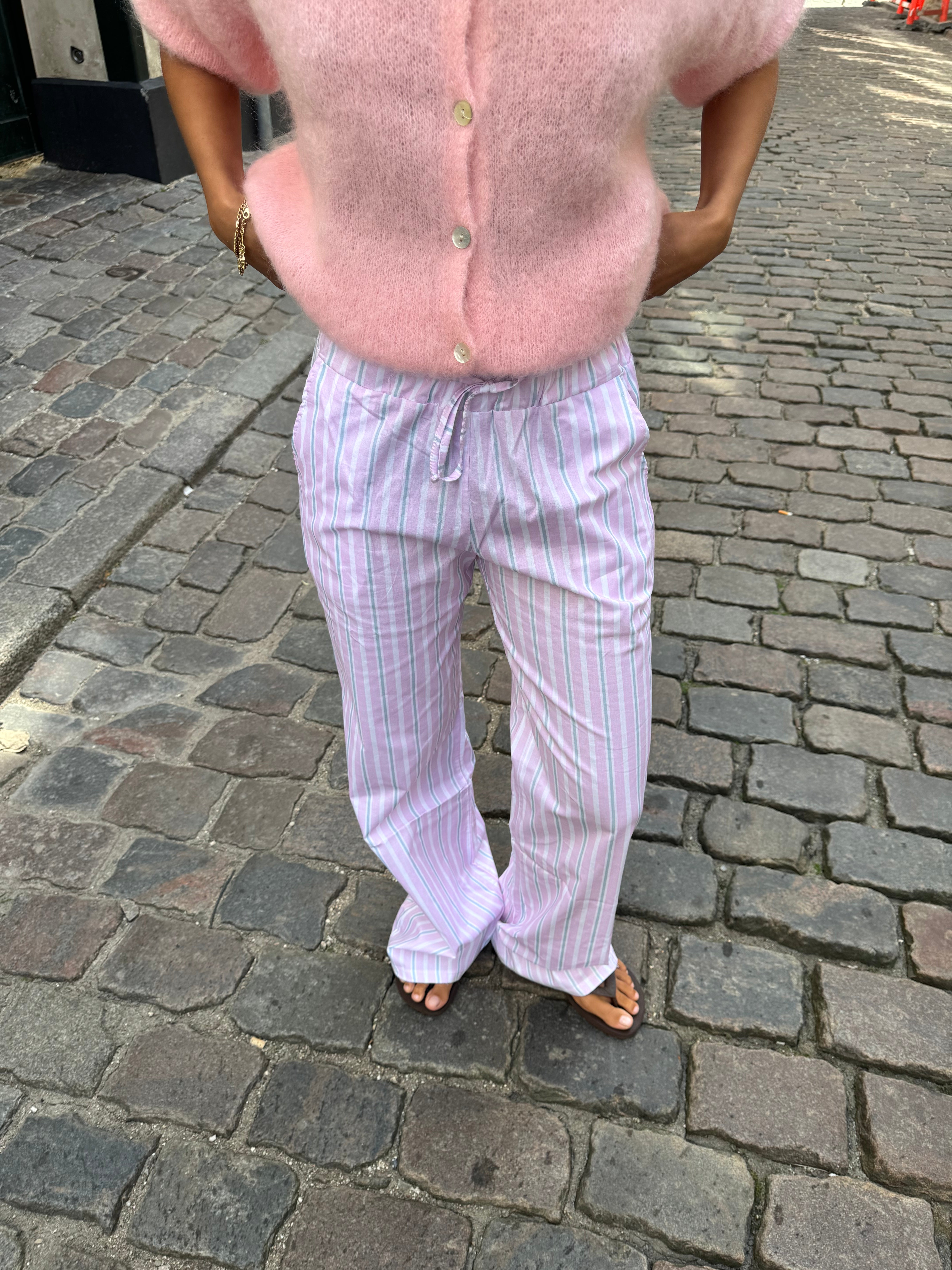 These trousers have a loose and relaxed fit. They have an elastic waistband with tieable strings. The trousers have slanted side pockets.