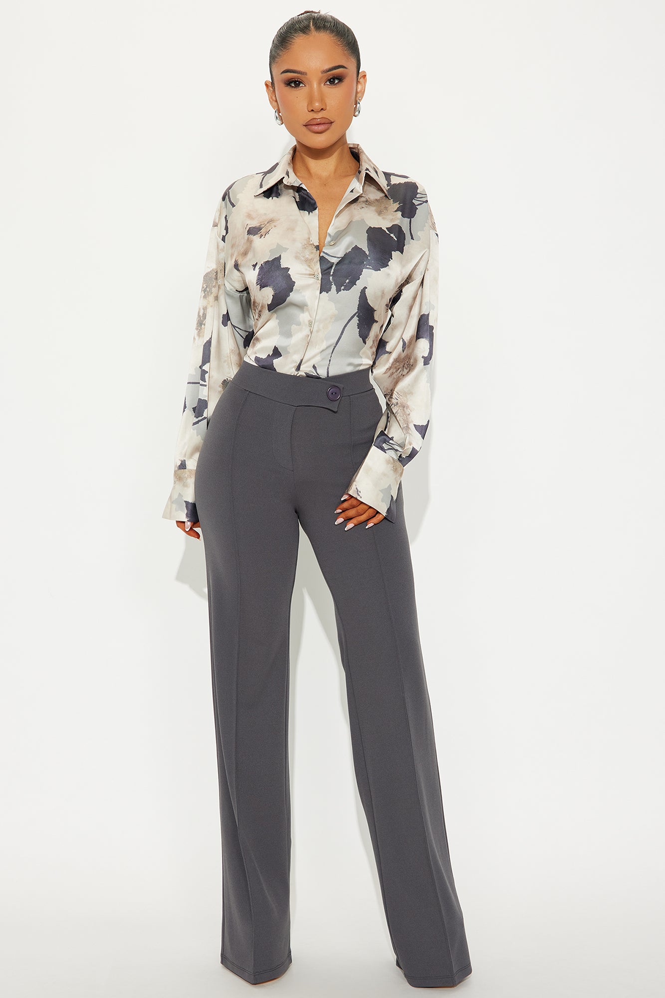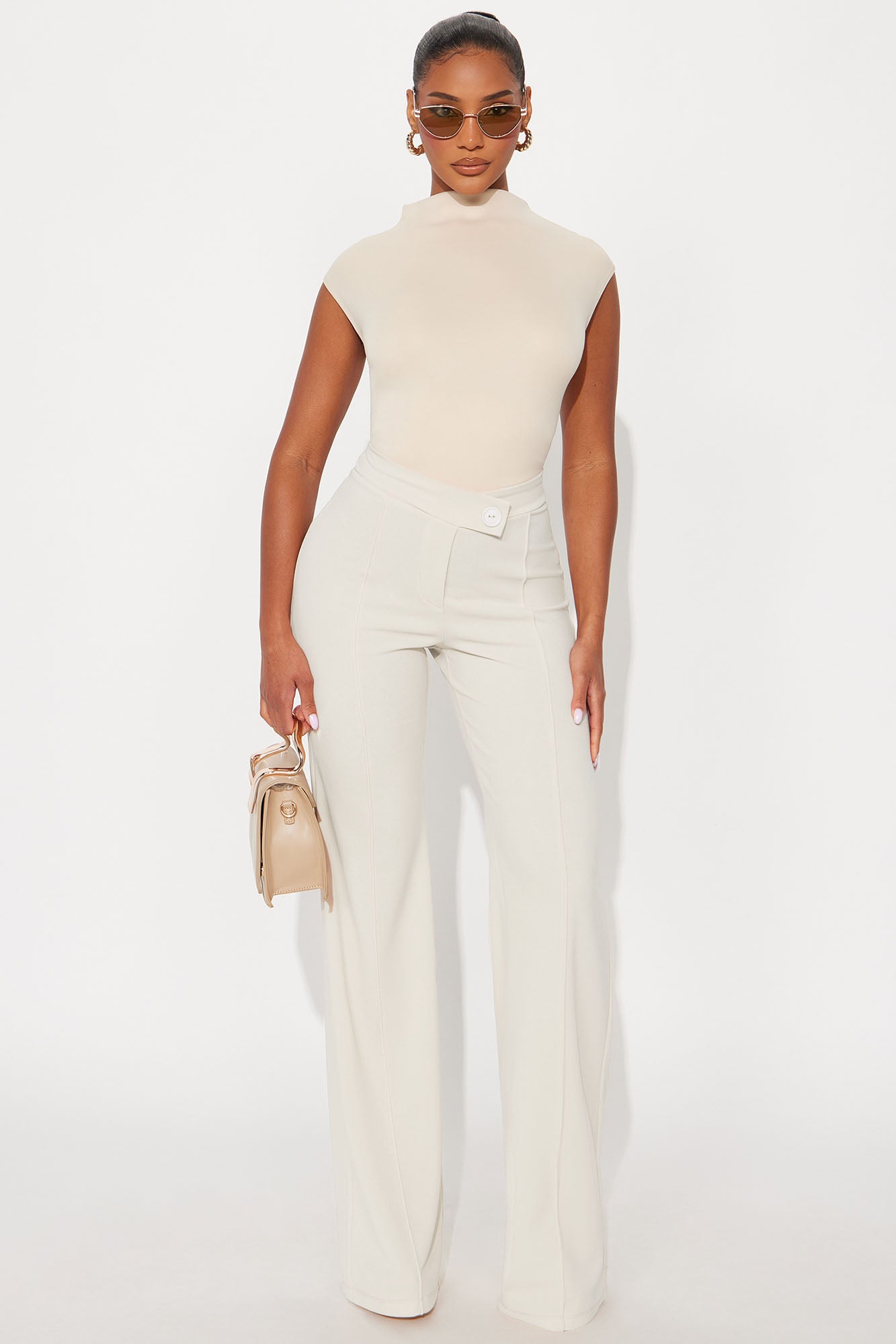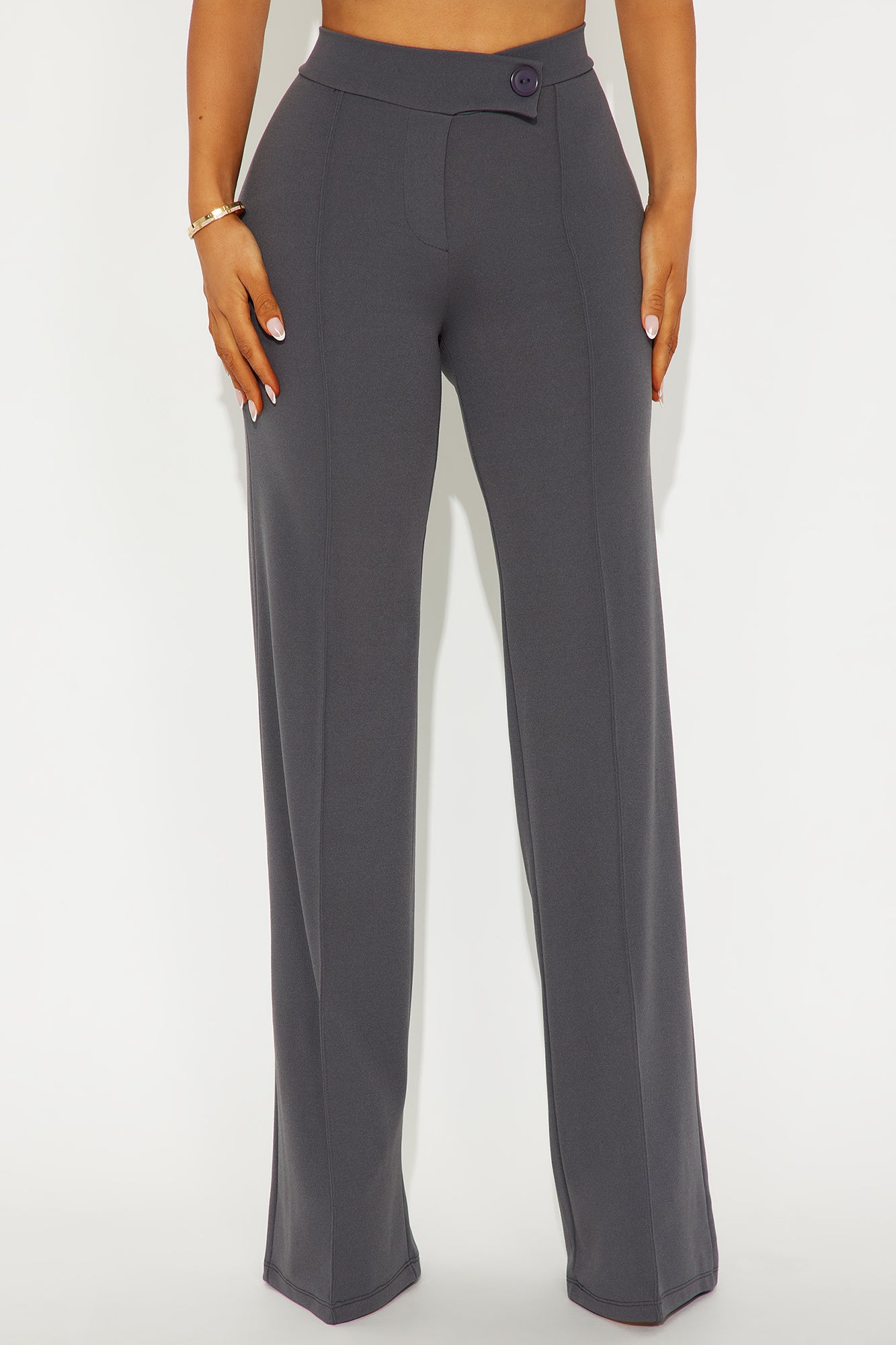 Available In Black, Charcoal, Chocolate, Oatmeal, Taupe And White.Available in Regular, Tall , and Petite InseamsWide Leg Dress PantsTall 36" InseamAsymmetrical Button DetailBack Zipper ClosureFront Seam DetailClean Finish HemStretchCrepe KnitHigh WaistHigh Rise95% Polyester 5% SpandexImported