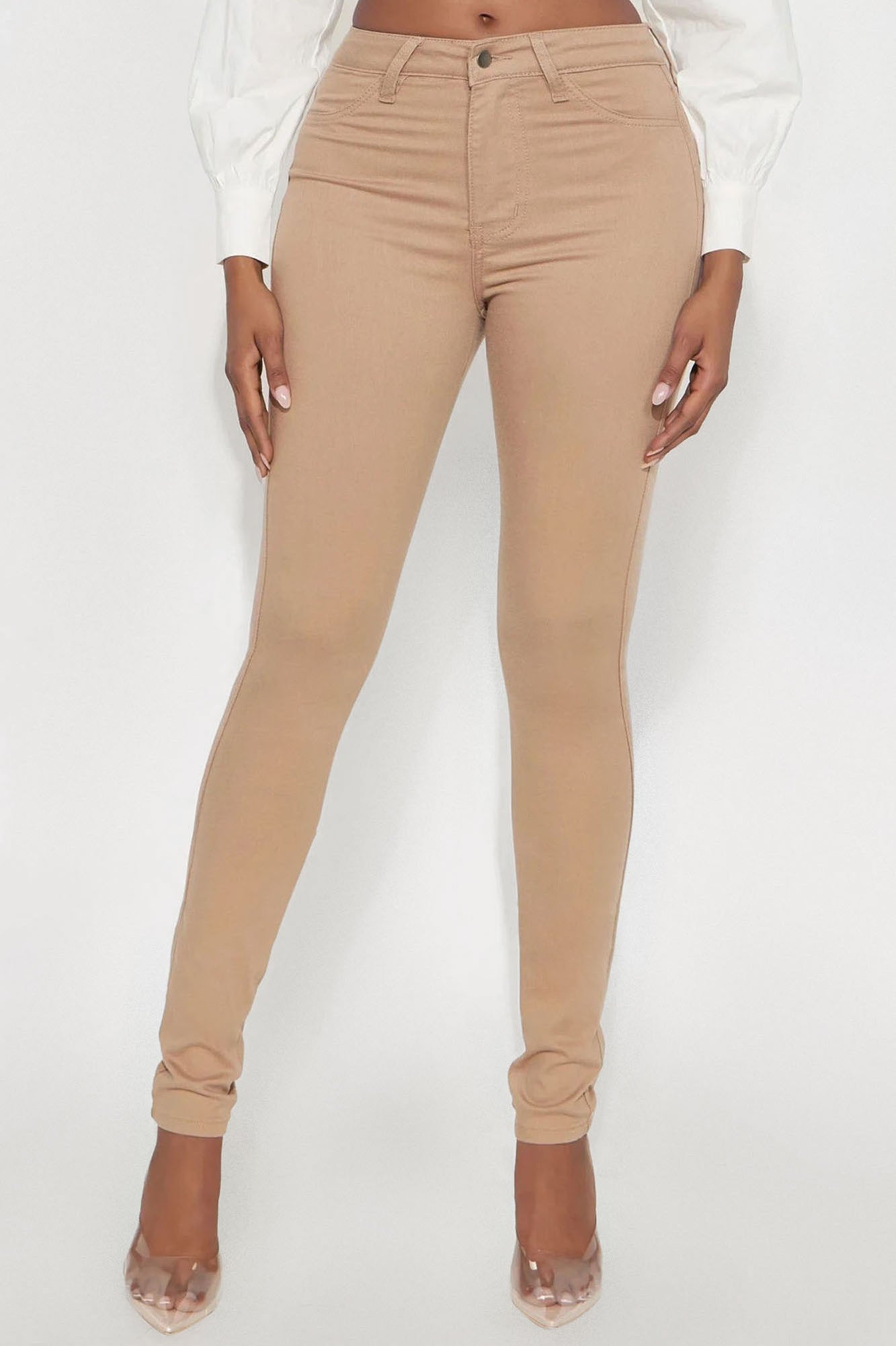Available In Black, Khaki, Light Blue Wash, Medium Blue Wash And White.Available in Petite 28" Inseam, Regular 31" Inseam, & Tall 34" Inseam11" High RiseSkinny JeanHigh StretchFaux Front PocketsFunctional Back PocketsDisclaimer: Due To The Specialized Wash Process, Each garment Is Unique49% Rayon 32% Cotton 17% Polyester 2% SpandexImported