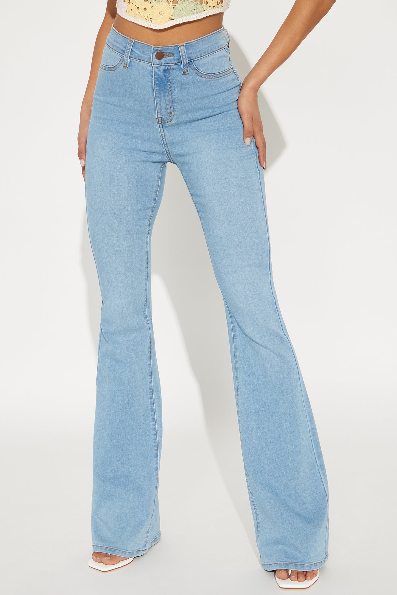 Our sexiest flare jean is offered in a range of washes in a high stretch, super soft fabric that hugs every curve. Fitted in the hips and thighs while flaring at the knee, these jeans elongate the legs and are perfect with a heel. Now offered in a range of washes, colors, and inseams.Available In Black, Dark Denim, Light Blue Wash, Light Wash, Medium Blue Wash And White.Available In Petite 31" Inseam, Regular 34" Inseam, & Tall 37" InseamHigh Stretch Denim11.5" High Rise22" Flare Leg OpeningFaux Front PocketsFunctional Back PocketsDisclaimer: Due To The Specialized Wash Process, Each Garment Is UniqueWhite And Colors: 52% Tencel 36% Cotton 10% Elasterell 2% SpandexBlack: 49% Rayon 32% Cotton 17% Polyester 2% SpandexBlue Washes: 49% Rayon 32% Cotton 17% Polyester 2% SpandexImported