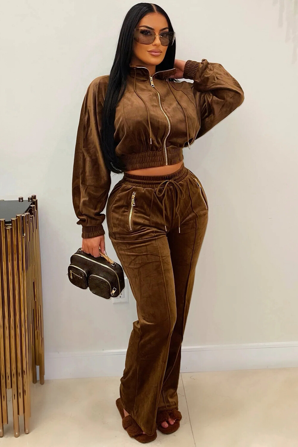 Velvet Crop Track Jacket Tie Up High Waist Pants 2pcs Set-Khaki
