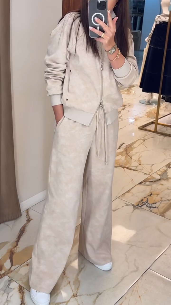 Women Lapel Zipper Top + Drawstring Pants Casual Set