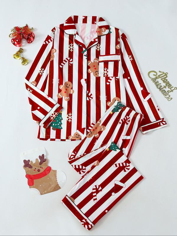 • 2026 Two-piece Set Women's Christmas Print Button Front Pocket Shirt & Elastic Waist Pants Pyjama, Casual Comfy Long Sleeve Collared Top & Trousers Pyjama Set, Women's Sleepwear for Spring & Fall